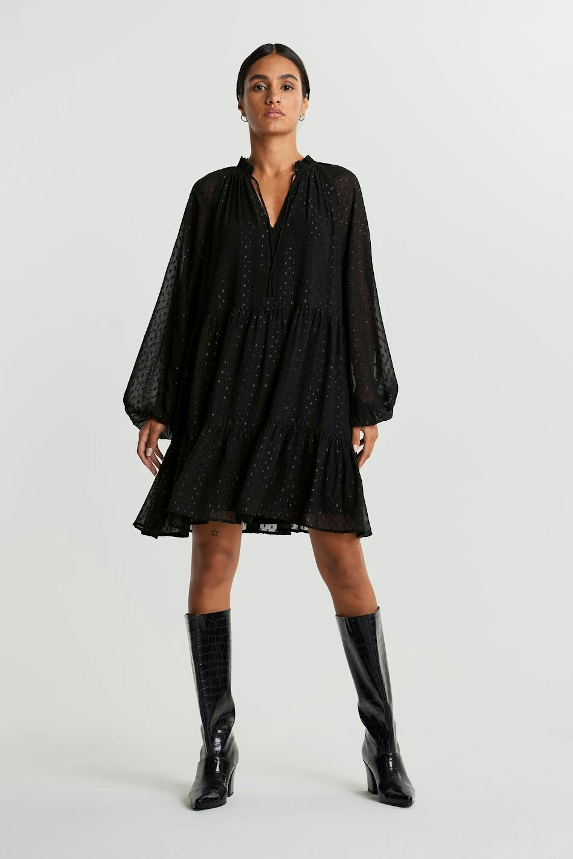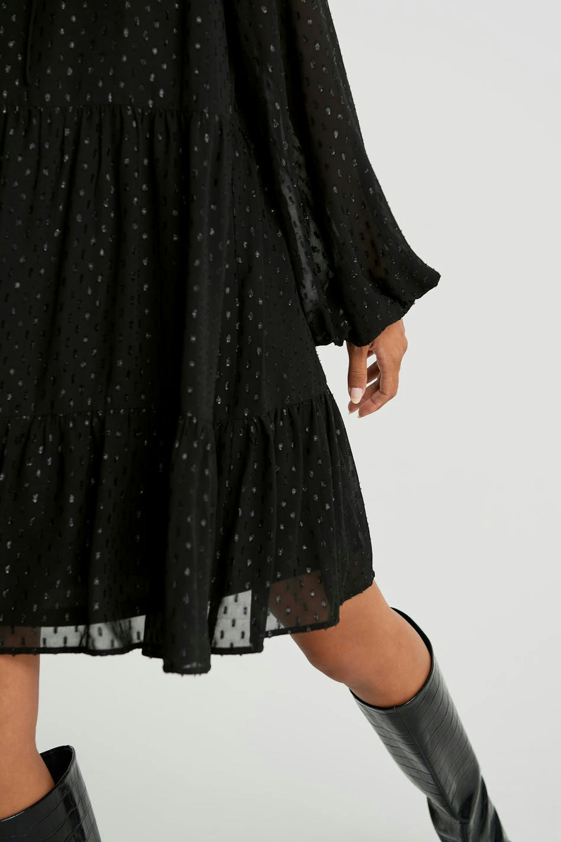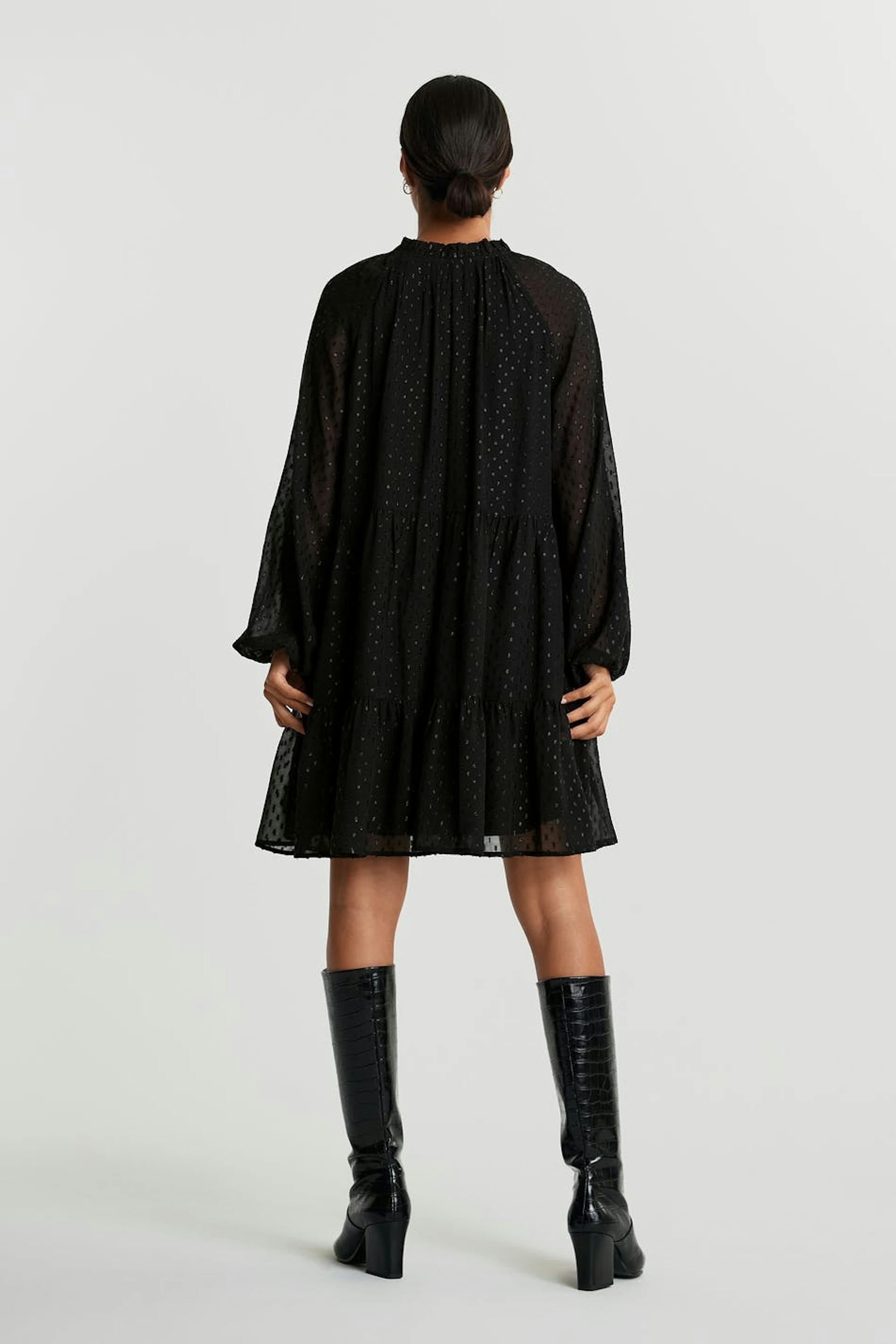 Kjole med en oversized-passform. Kjolen er svart og har glitrende prikker. Den har lange, voluminøse armer med en elastisk stropp på enden av ermene, en v-hals og en liten krage med en volangdetalj.