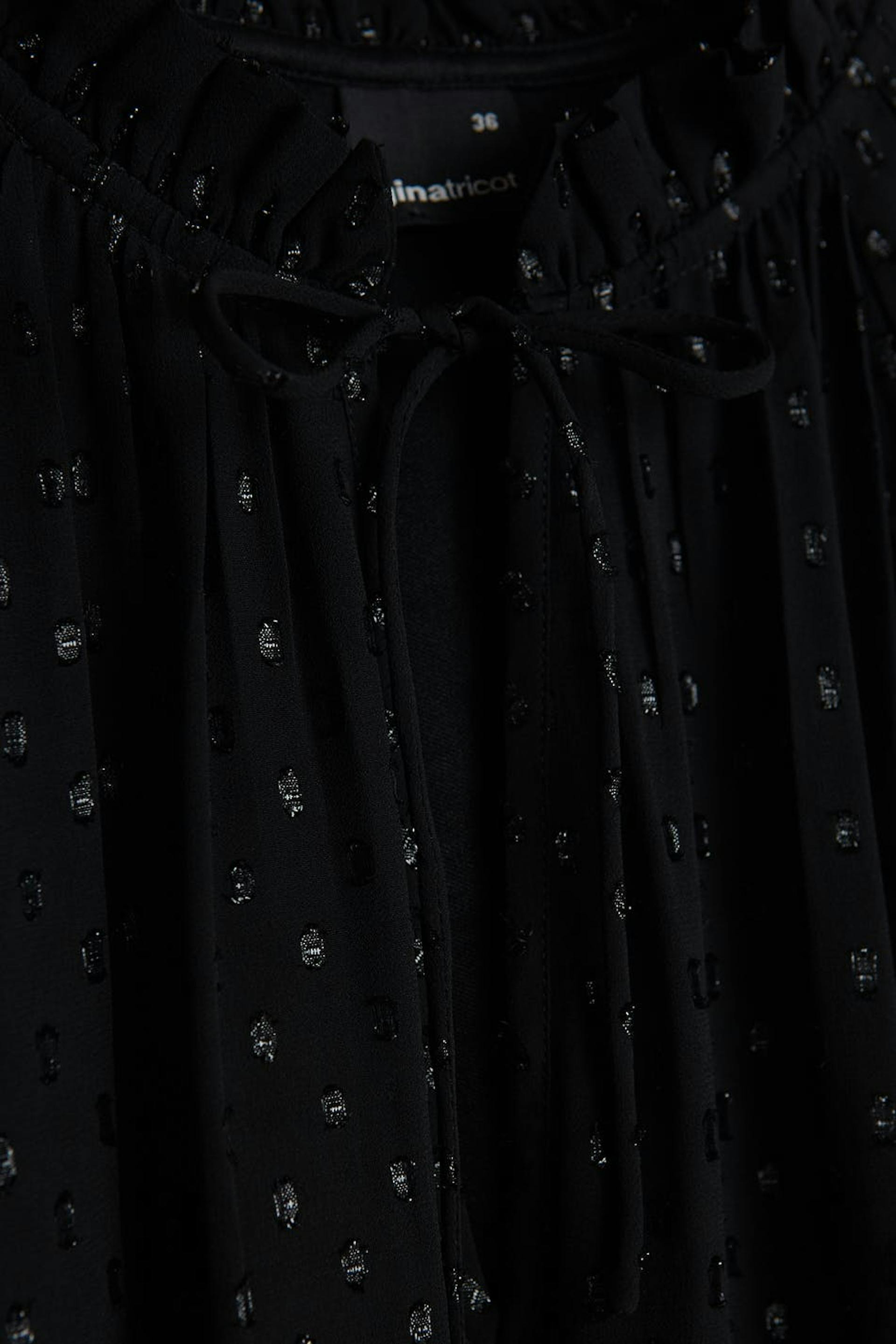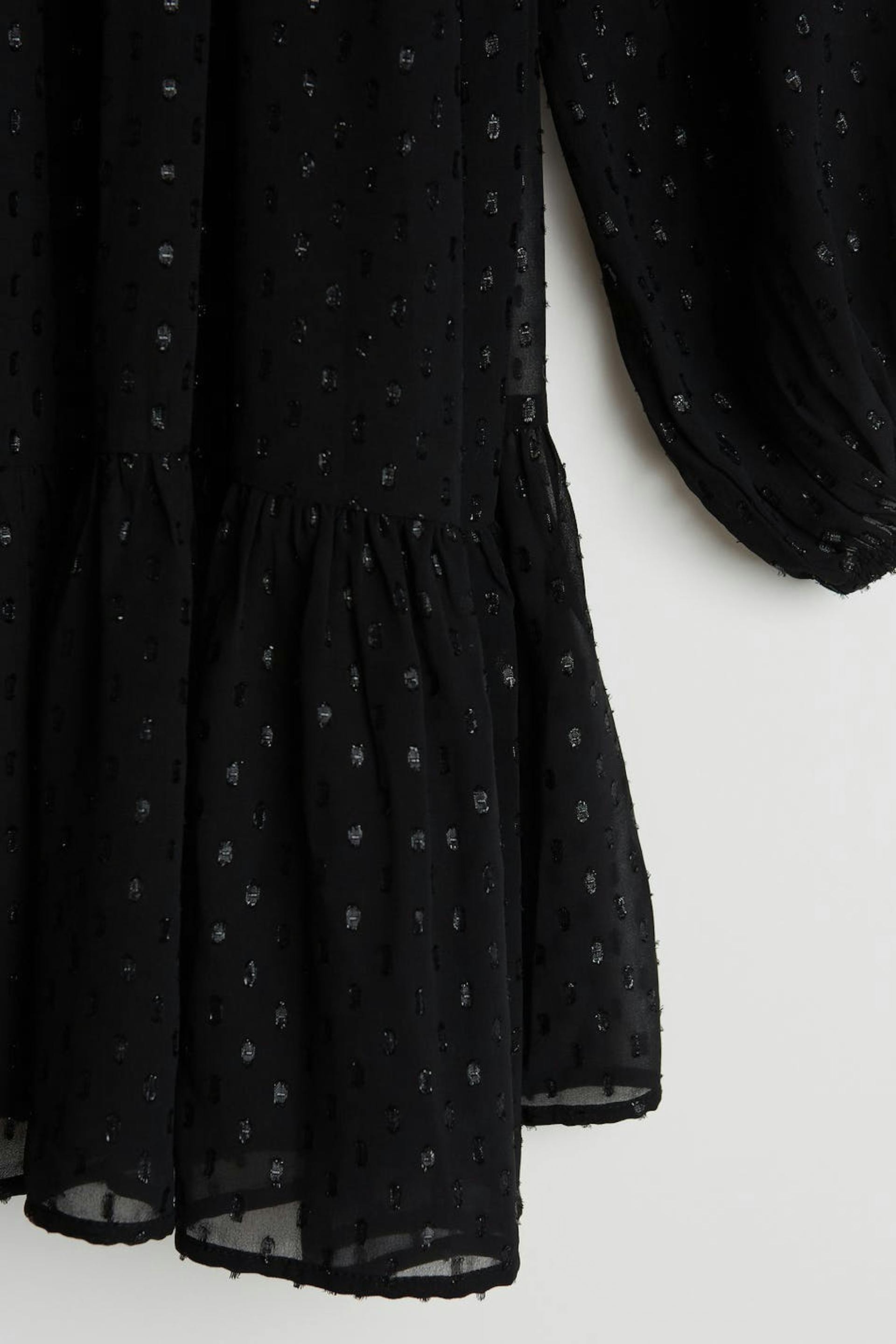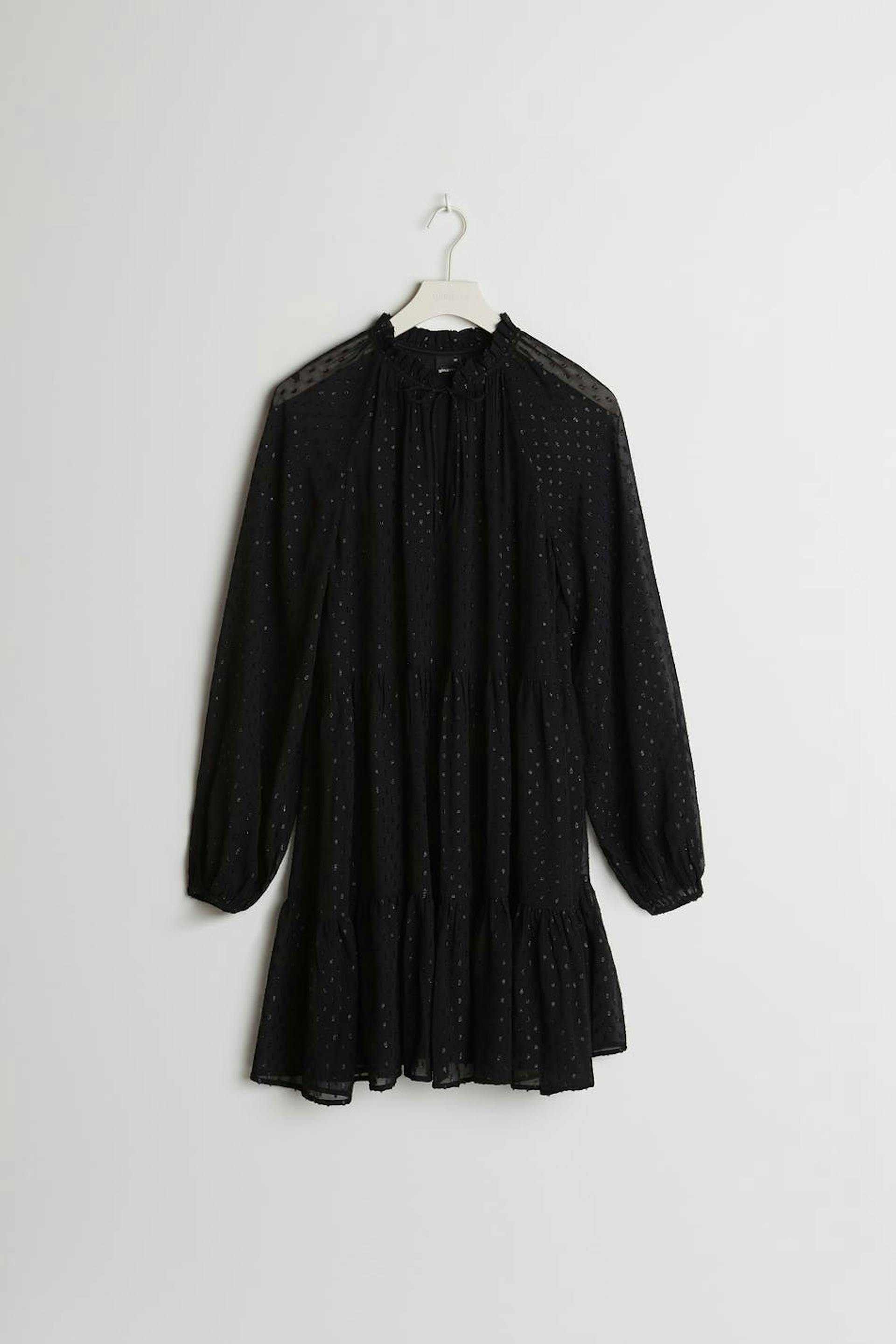 Kjole med en oversized-passform. Kjolen er svart og har glitrende prikker. Den har lange, voluminøse armer med en elastisk stropp på enden av ermene, en v-hals og en liten krage med en volangdetalj.