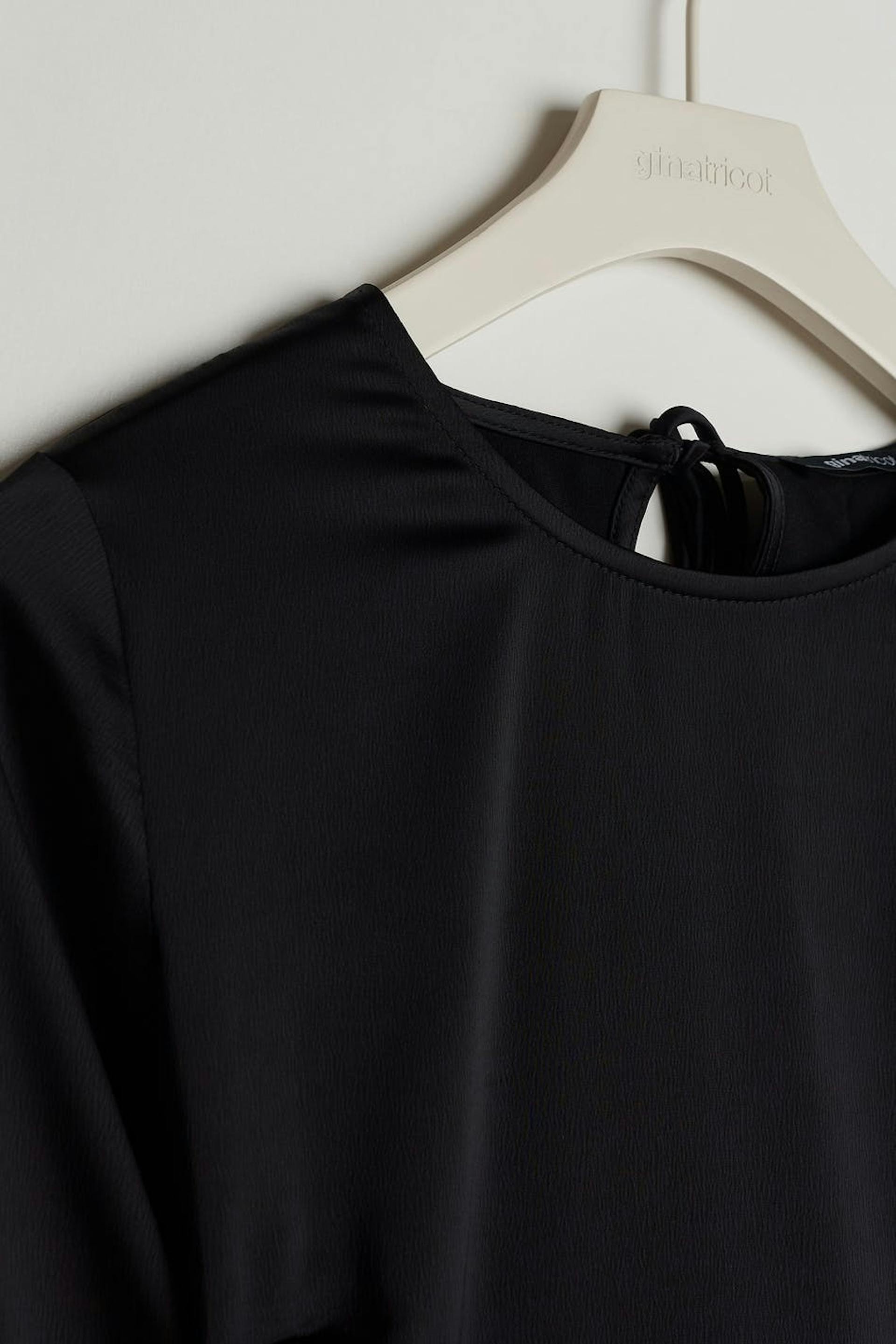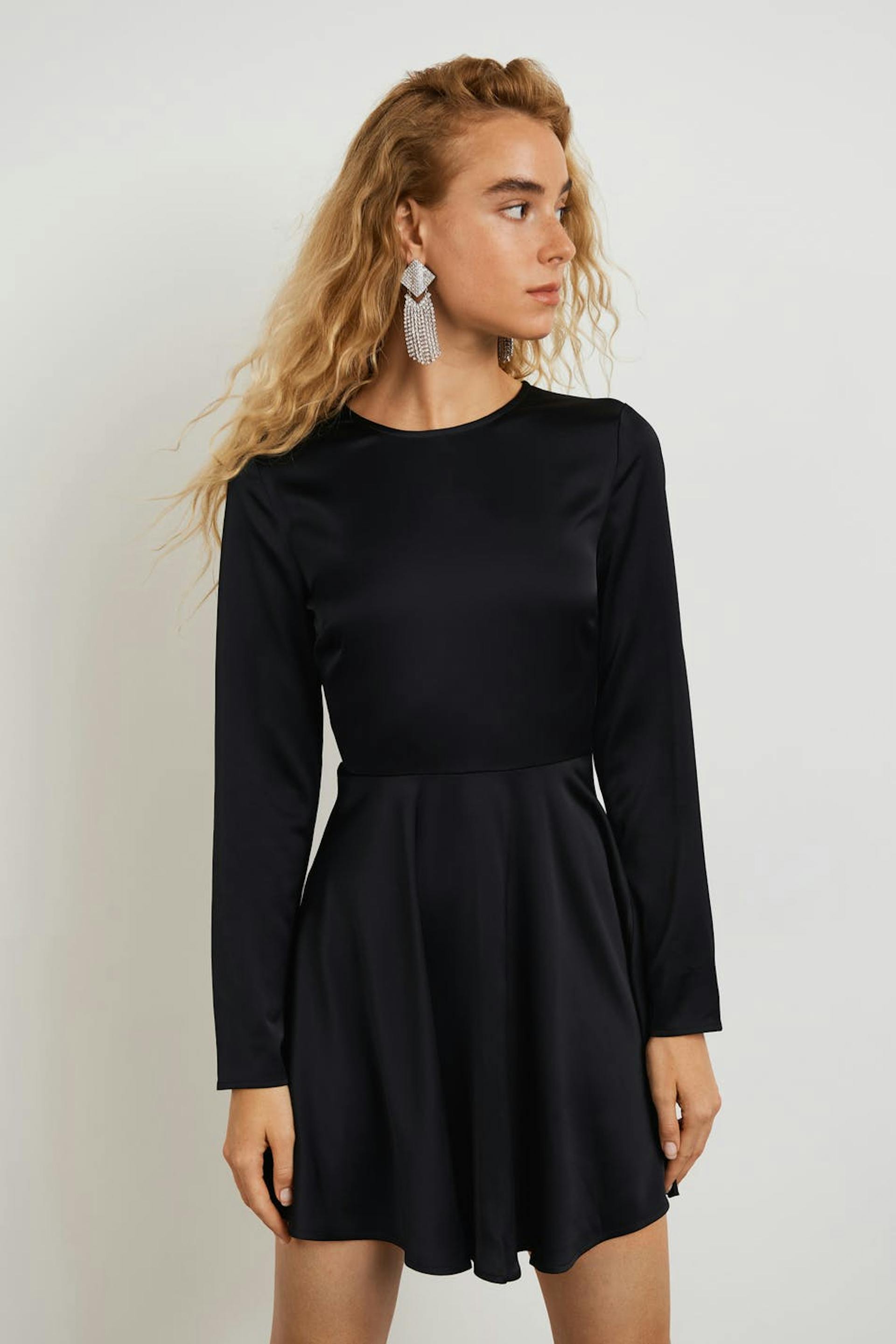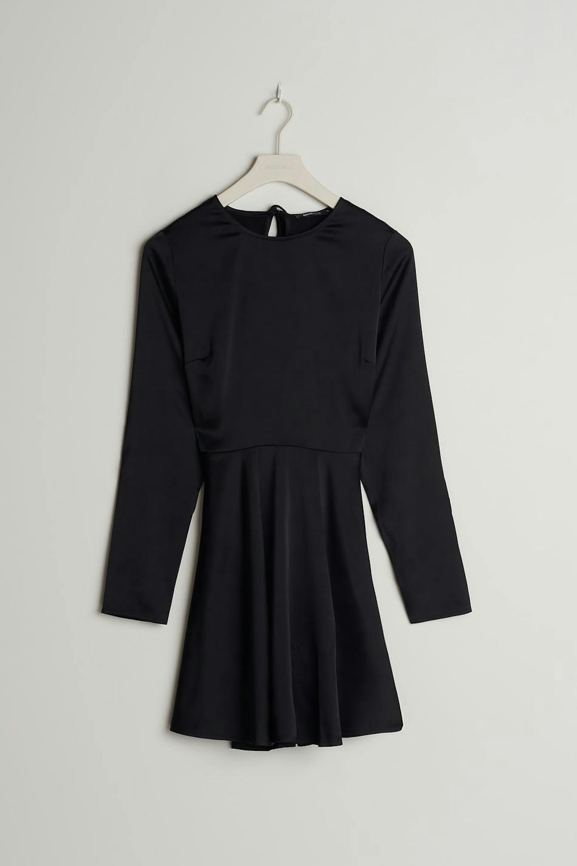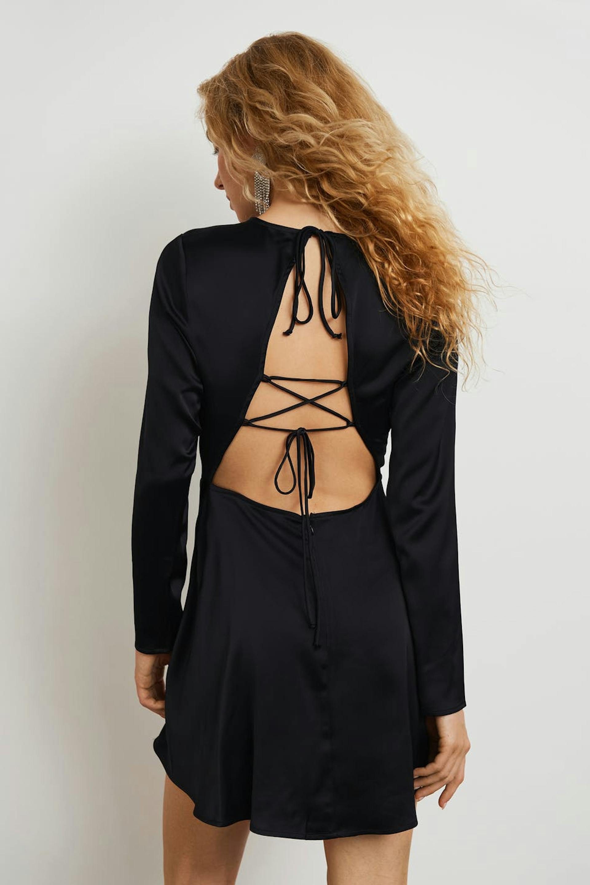 Kort kjole med en åpen rygg. Kjolen er perfekt for festen, svart og langermet. Den har en sømdetalj ved midjen og en snøredesign med knyting bakpå.