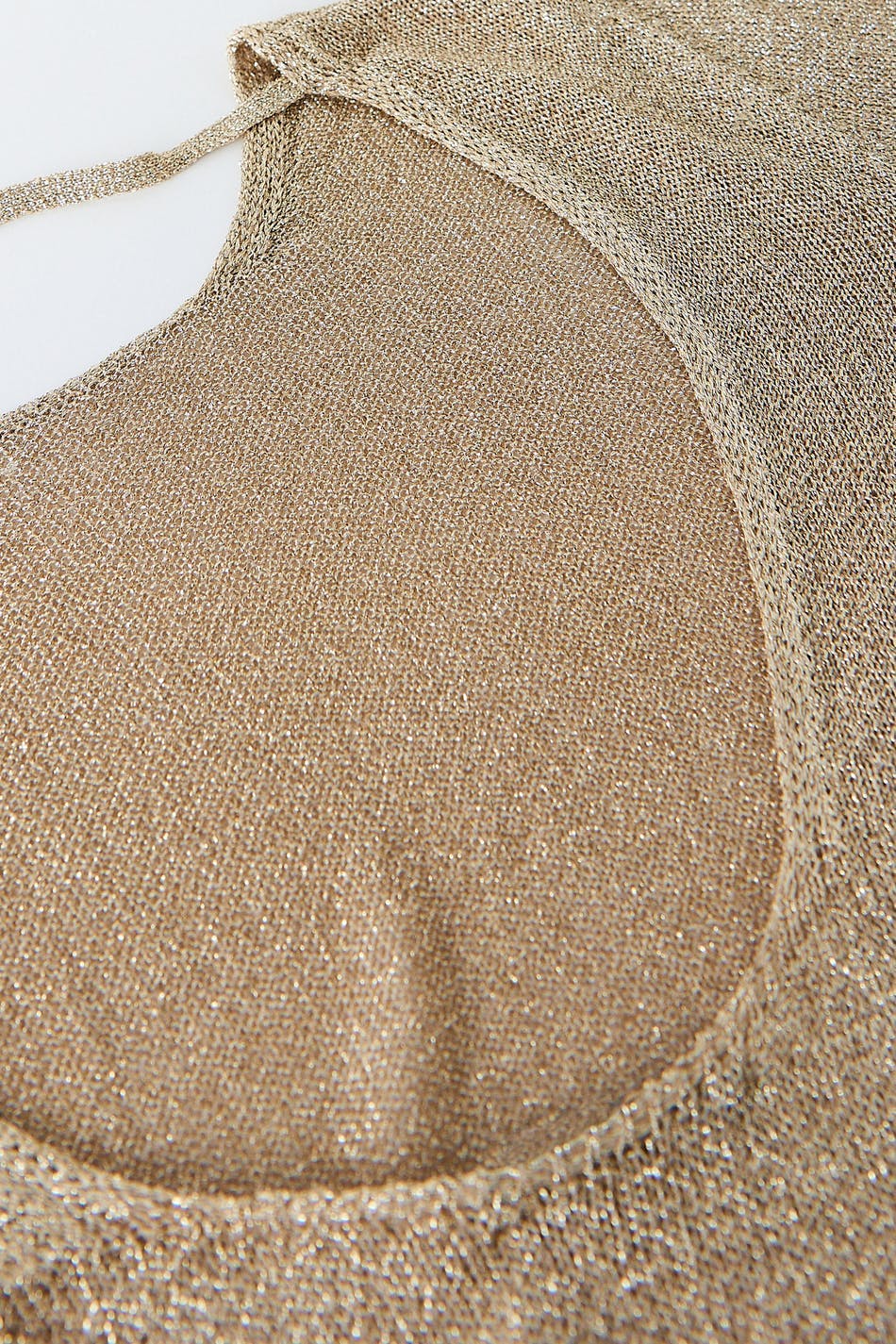 Langermet strikketkjole med åpen rygg. Kjolen er perfekt for festen, gullfarget og kort. Den har et skinnende materiale og en tilpasset passform med utsvingte armer.