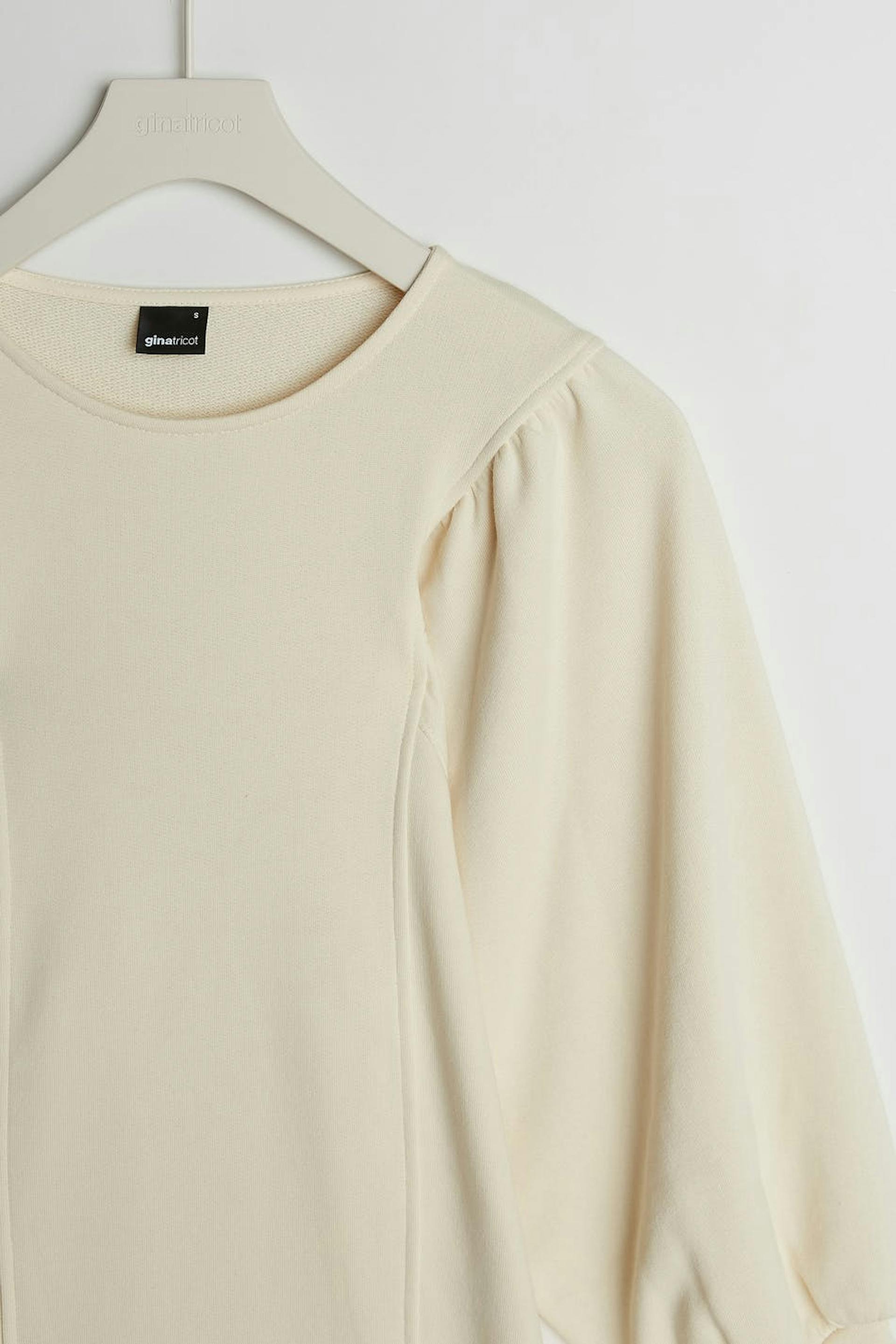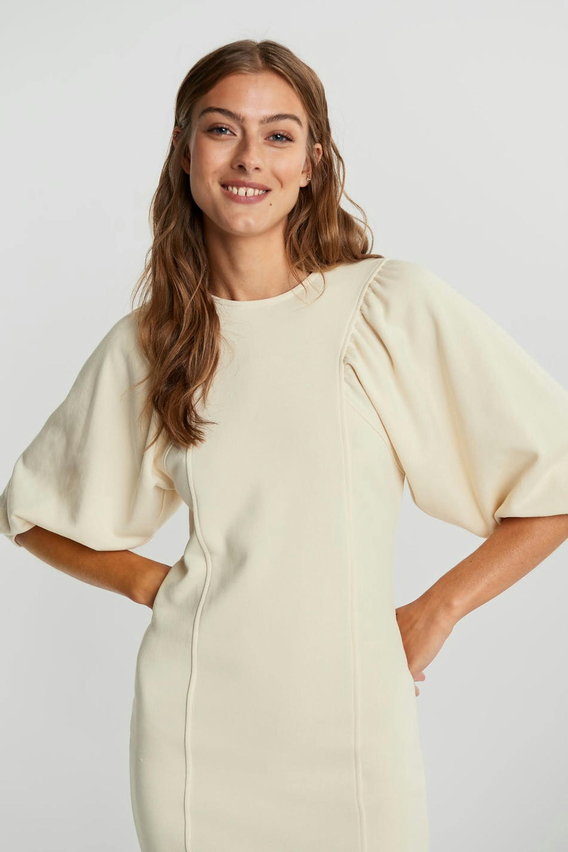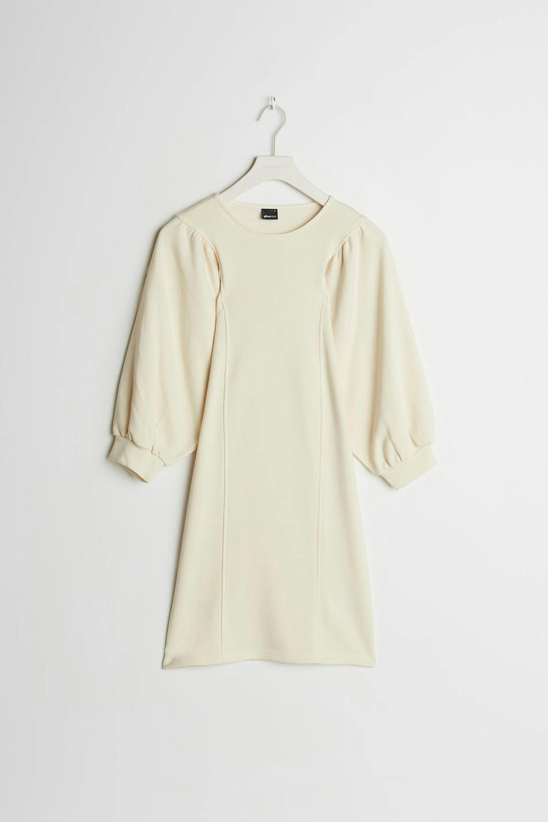 Kjole med en sømdetalj nede på framsiden og på baksiden. Kjolen er beige og har romslige armer. Den er laget av jersey.