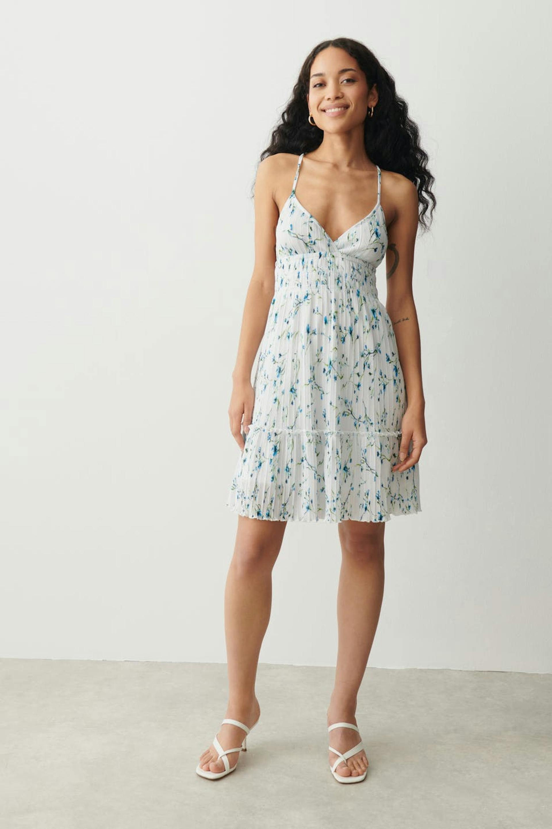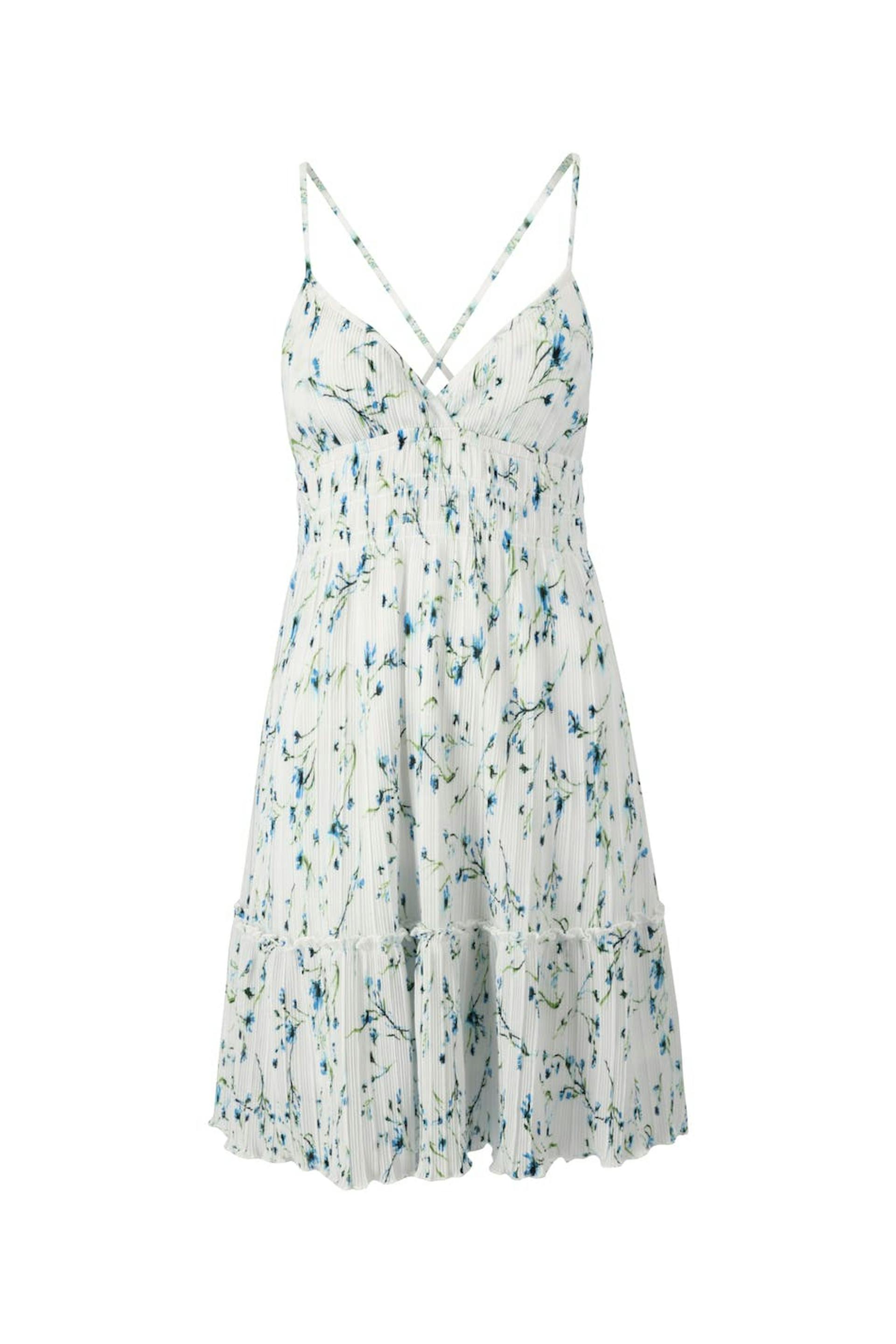 Kjole med plissé med en vanlig passform. Kjolen er blå, ermløs og fôret. Den har tynne, justerbare skulderstropper som krysses i ryggen, en detalj ved midjen med en vaffelsøm, v-ringning, et bredt, bølget skjørt og rysjedetalj på bunnen.