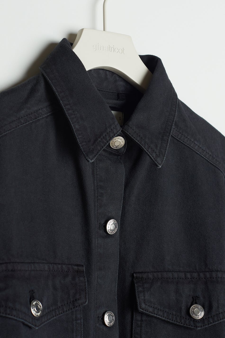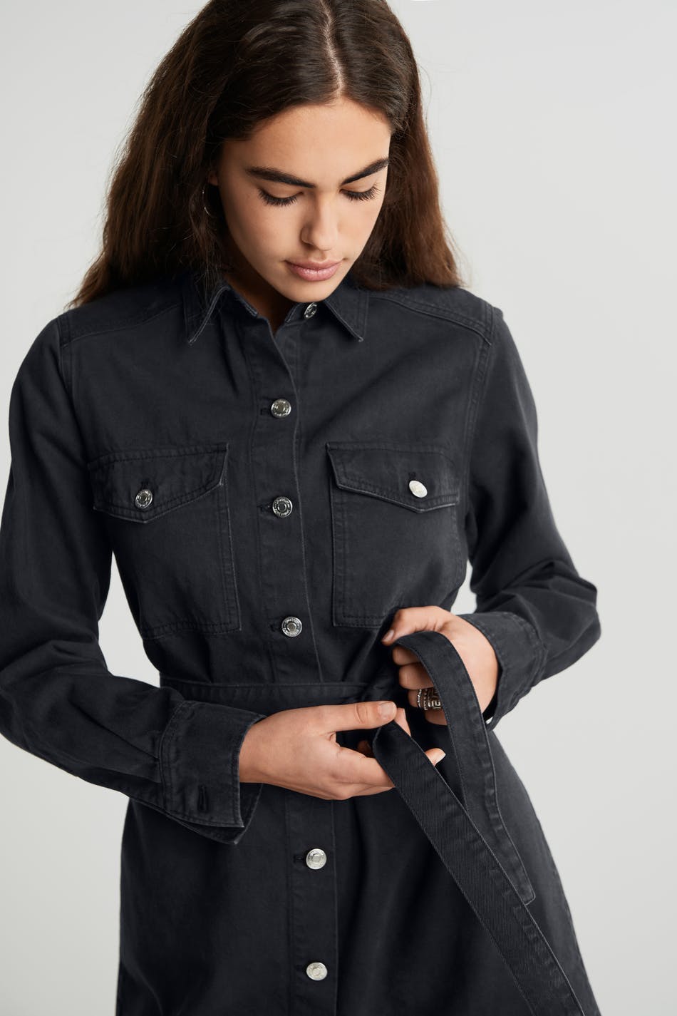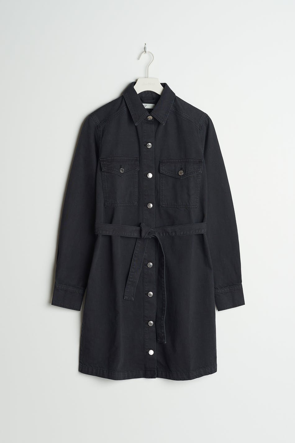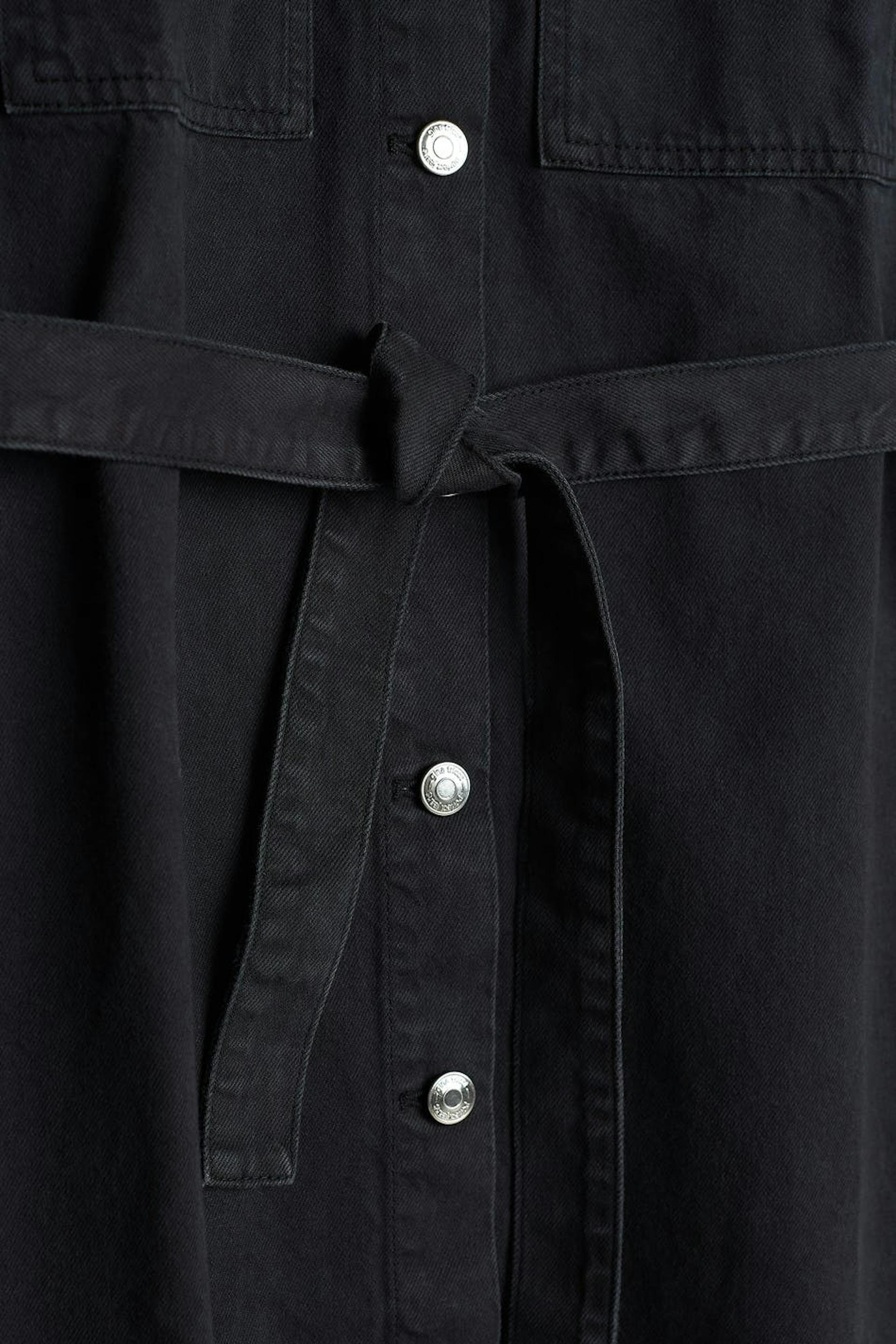 Skjortekjole med knapper foran. Kjolen er svartgrå og har ei beltespenne ved midjen. Den er laget av denim og har brystlommer og krøllede detaljer i ryggen.