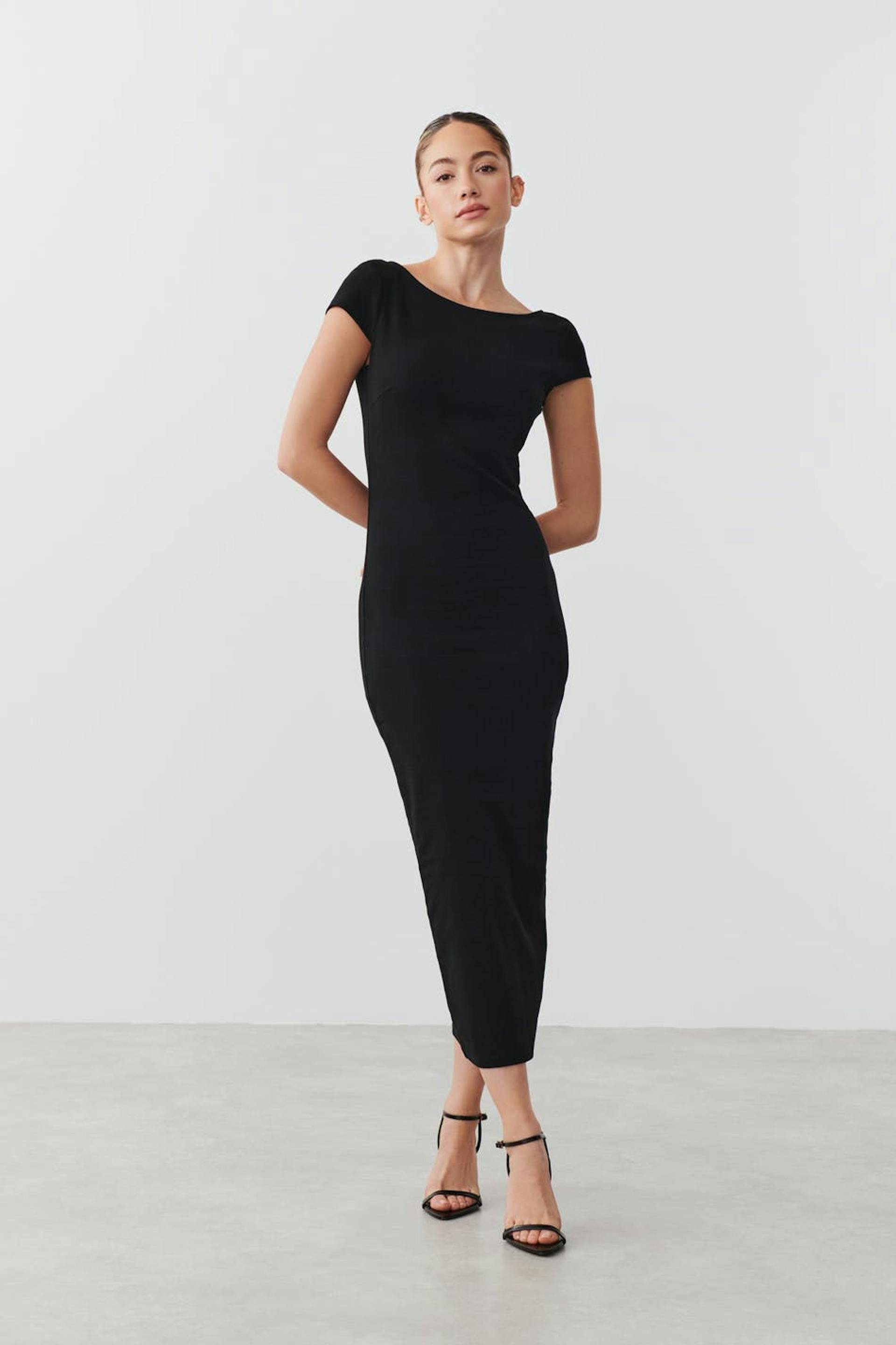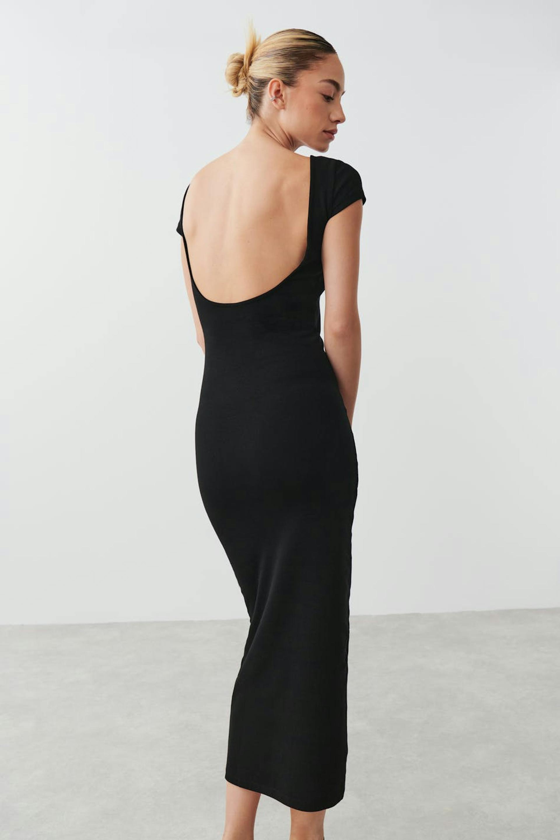 Kortermet kjole i jersey med åpen rygg. Kjolen er svart og har figurnær passform.