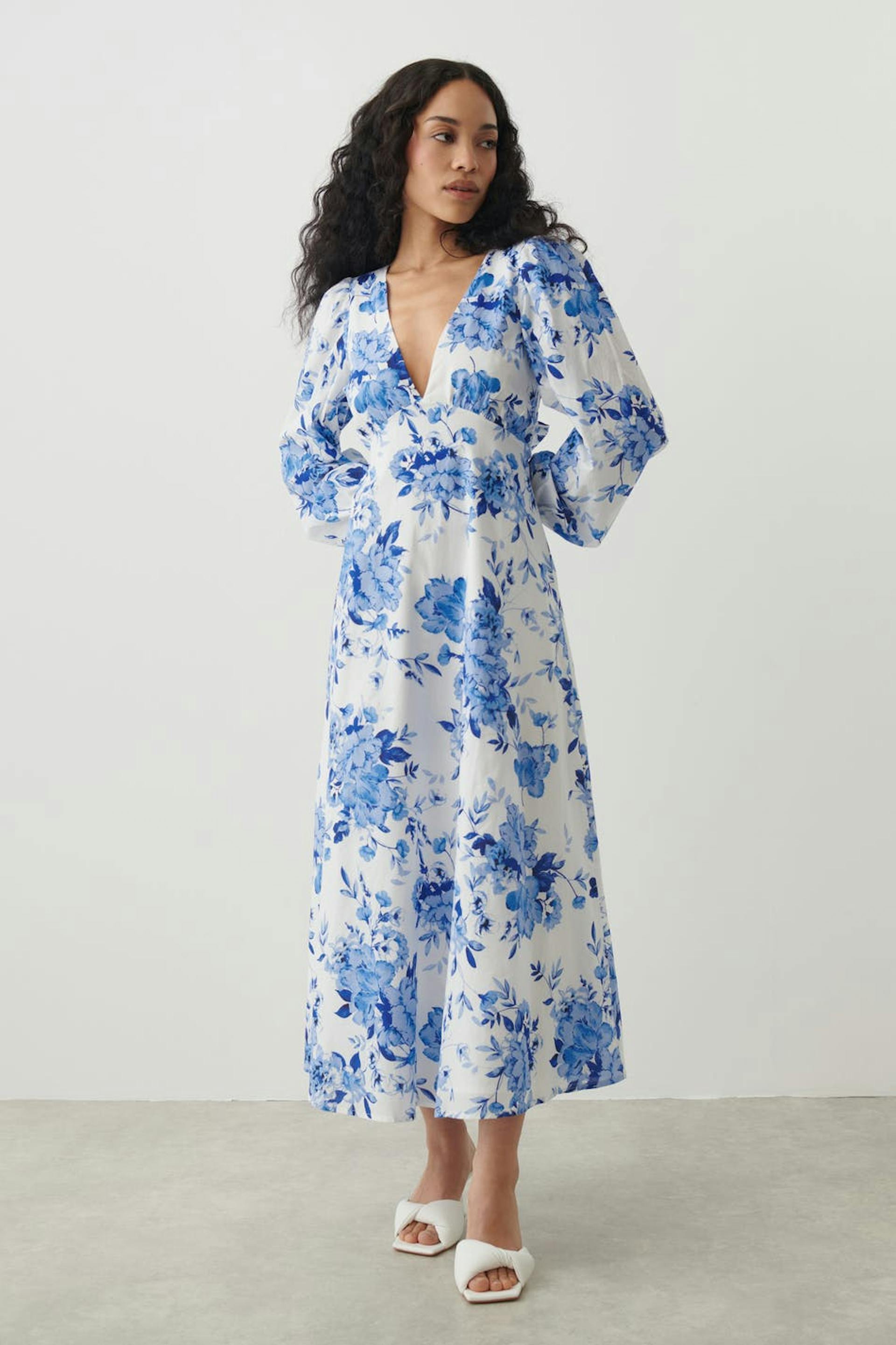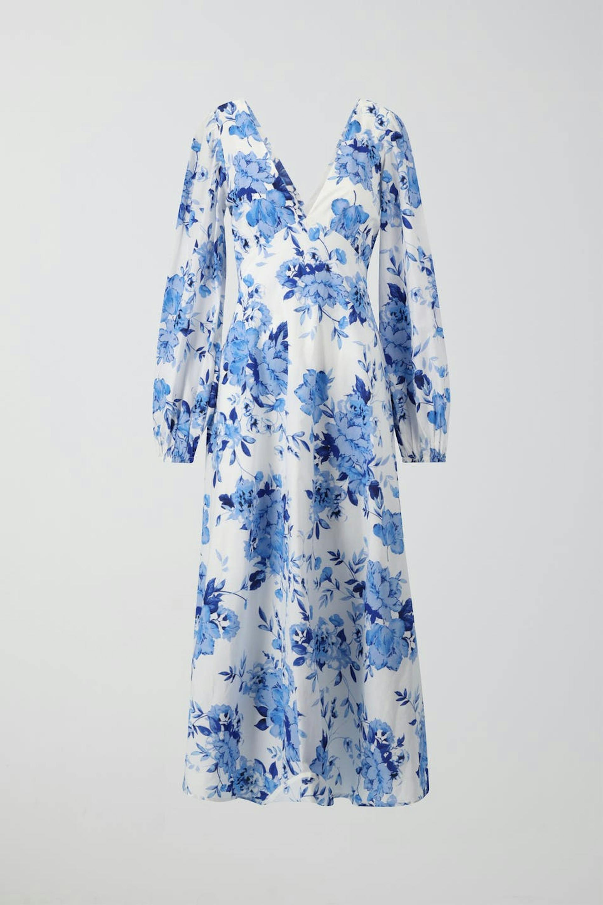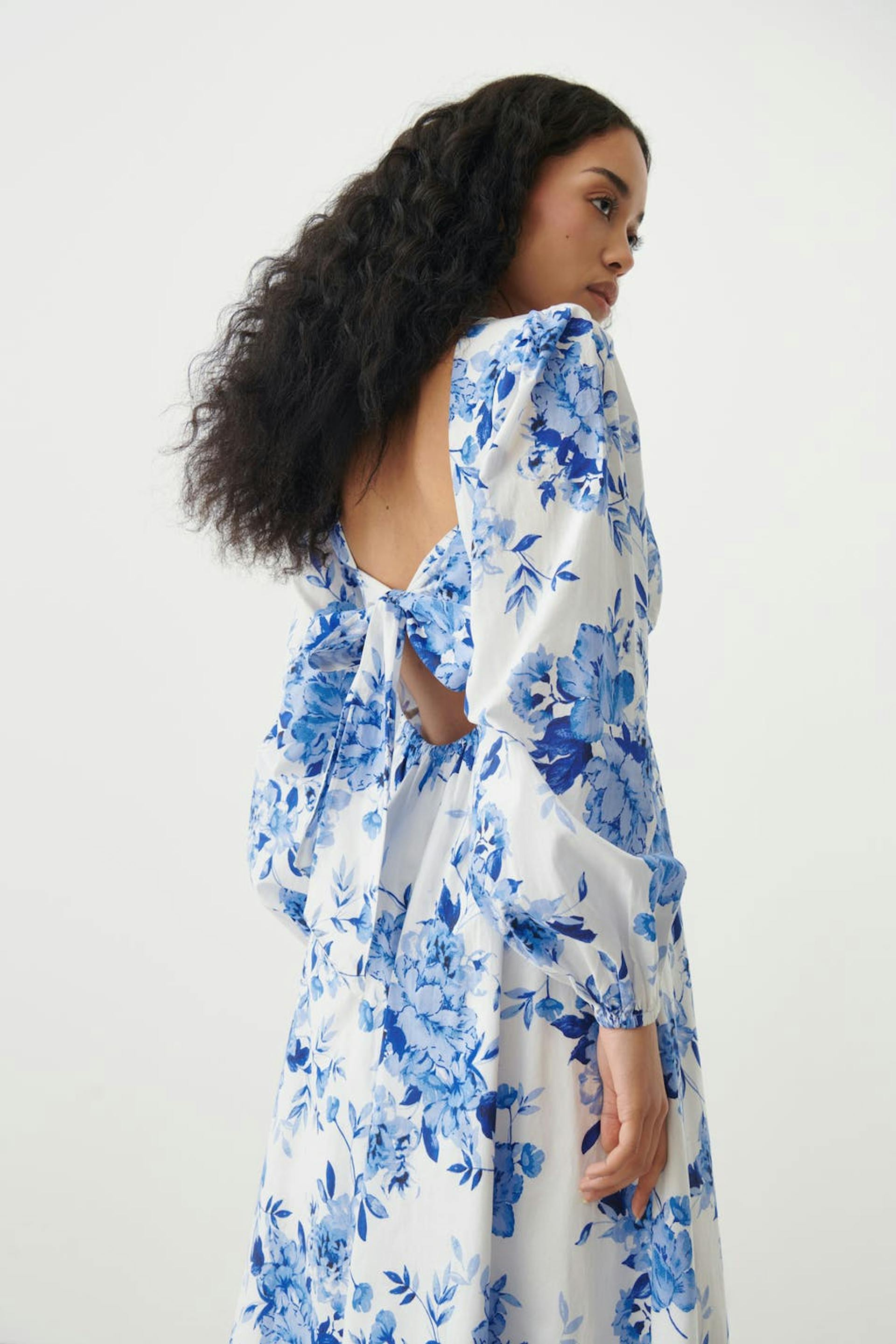 Blomstret maxikjole med langt pufferme. Kjolen er blå og har v-ringning. Den har bølget passform med tilpasset midje og lav rygg med knutedetalj.