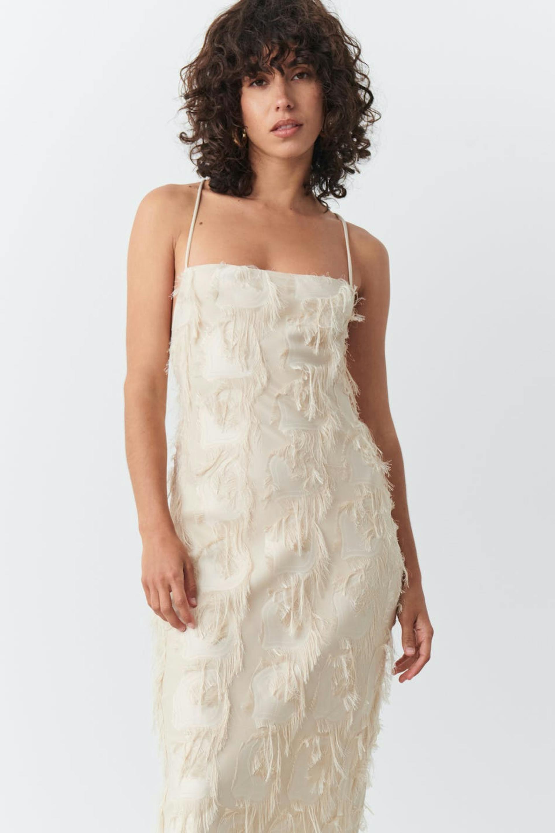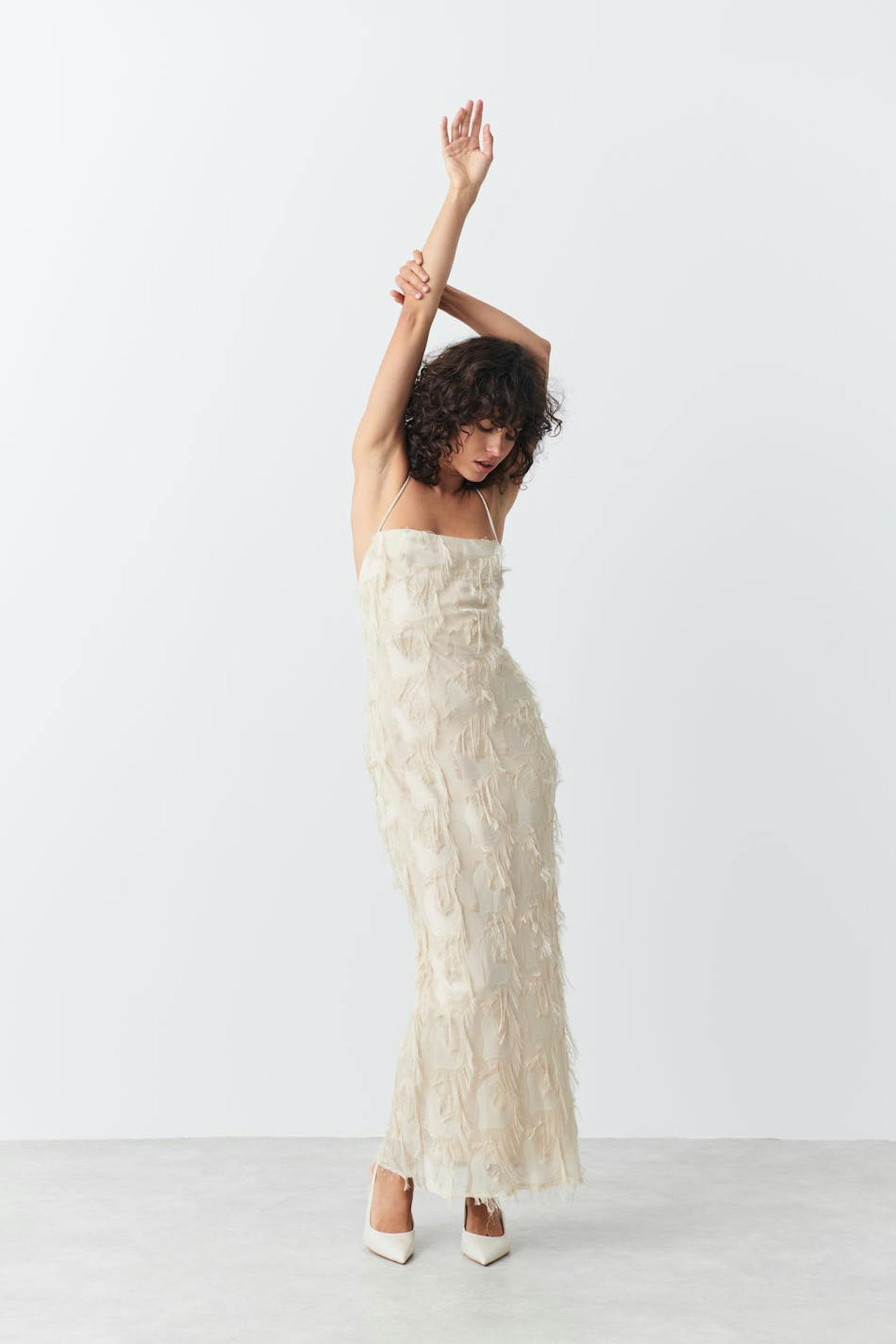Ermløs kjole med frynser. Kjolen er beige og har åpen rygg. Den har en tilpasset passform og en glidelås i ryggen.