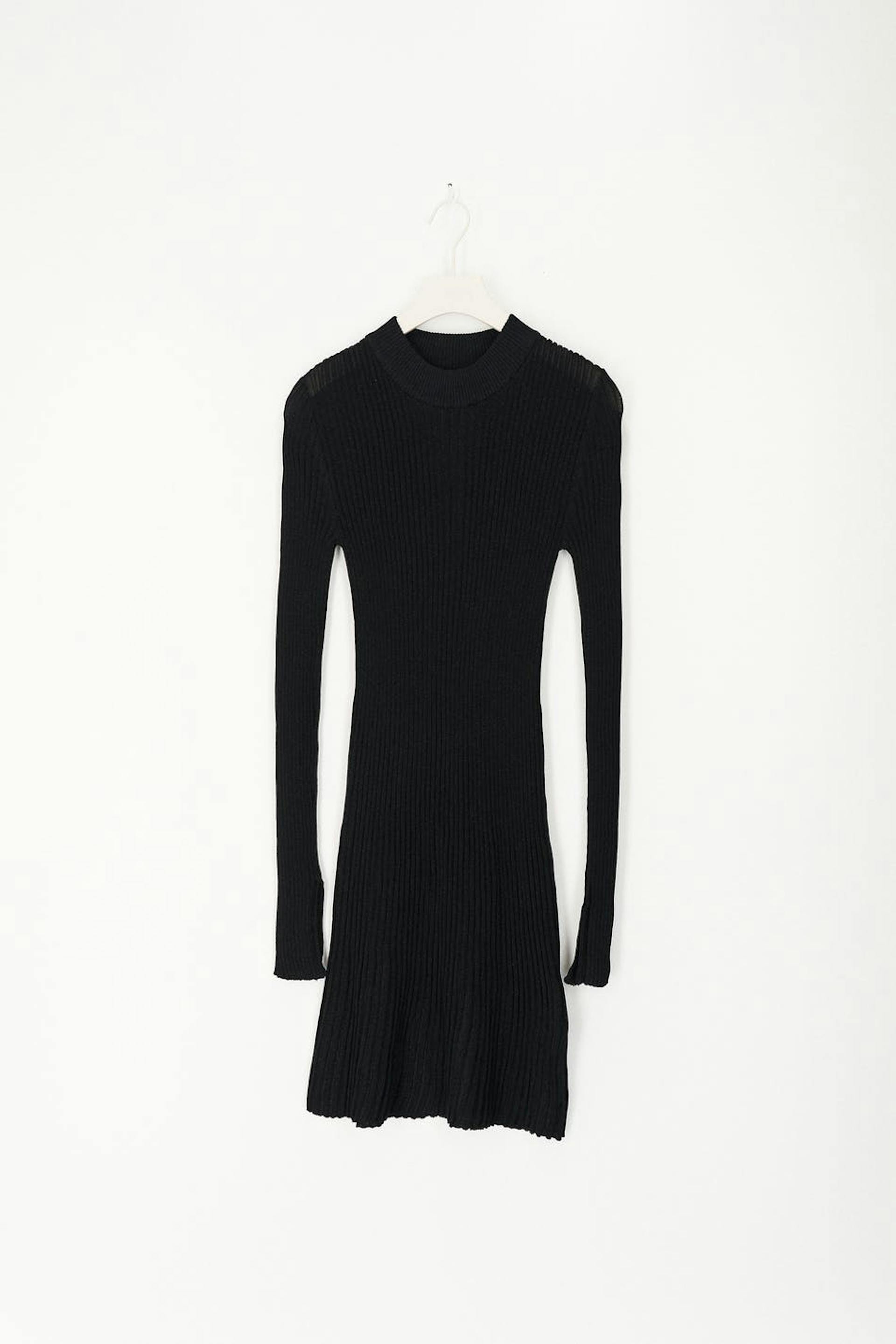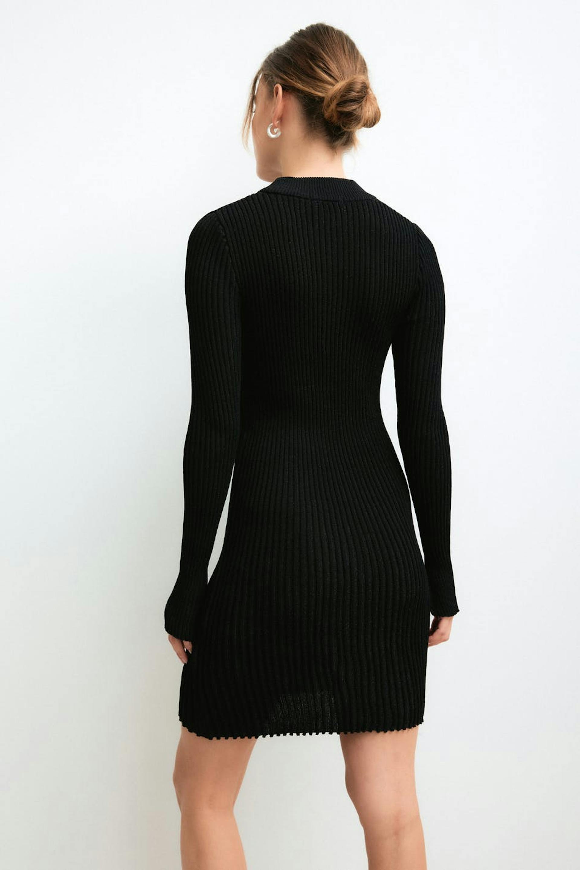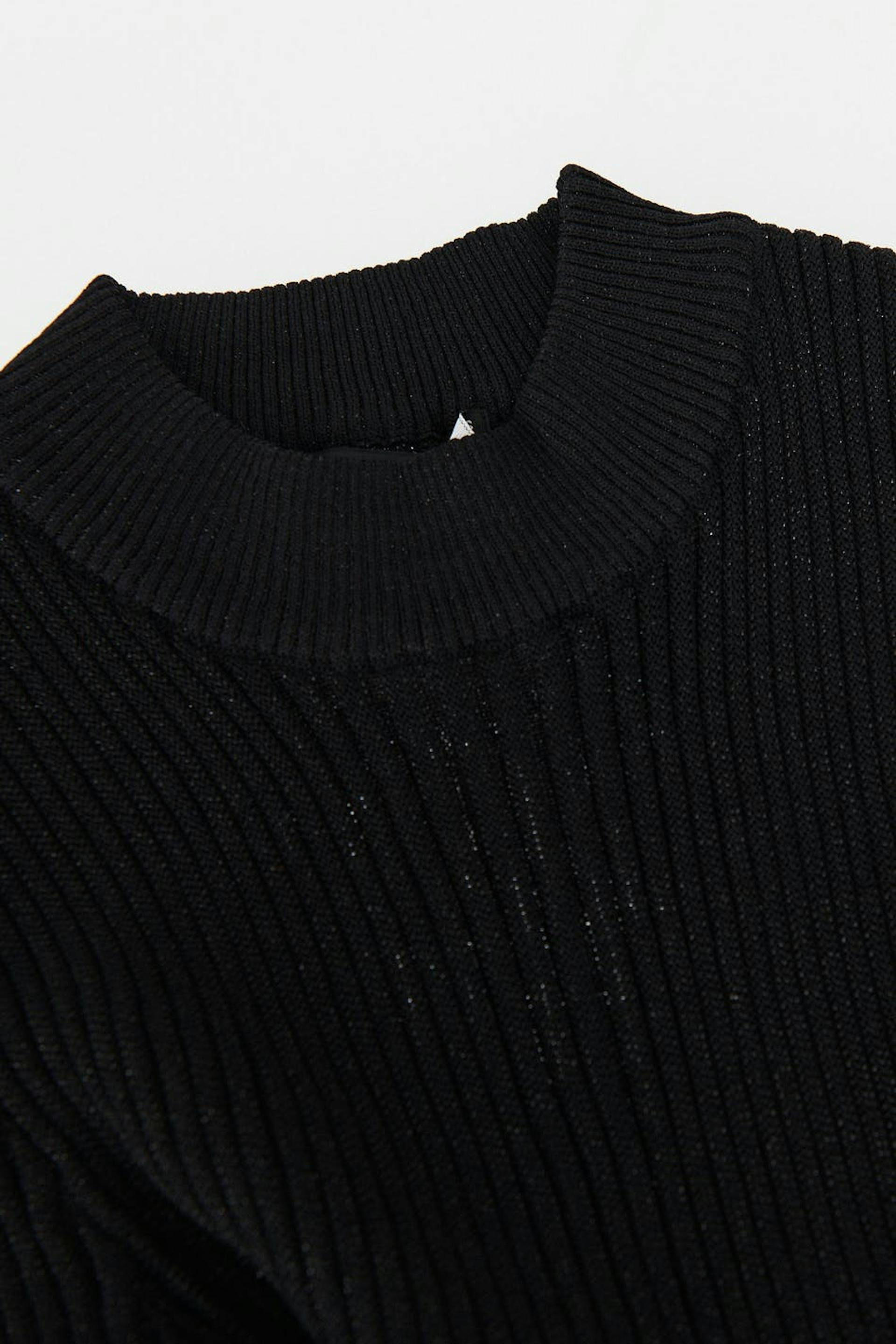 Glitrende strikketkjole i lurex med tilpasset passform. Kjolen er svart og har rund hals. Den har lange ermer, splitt på enden av ermene og utsvingt skjørt.