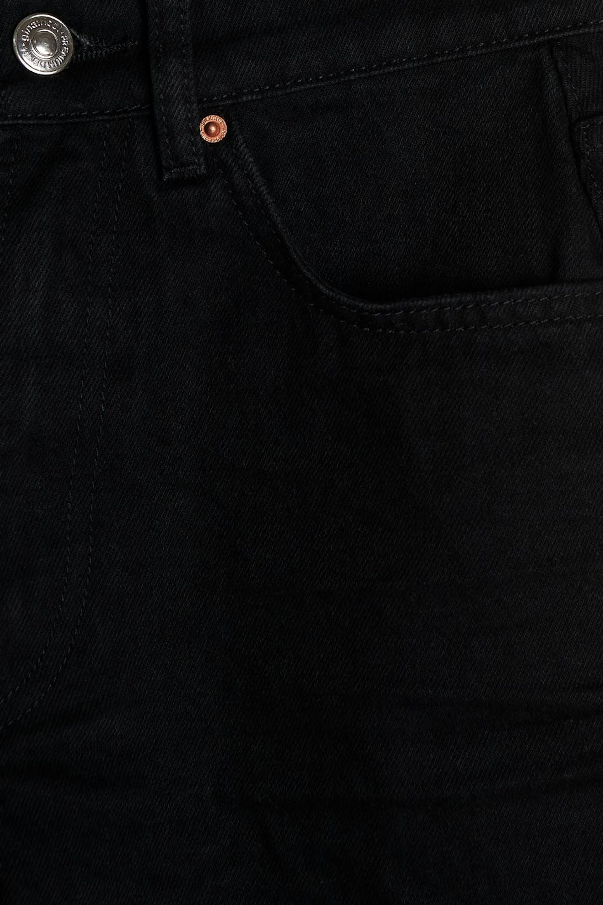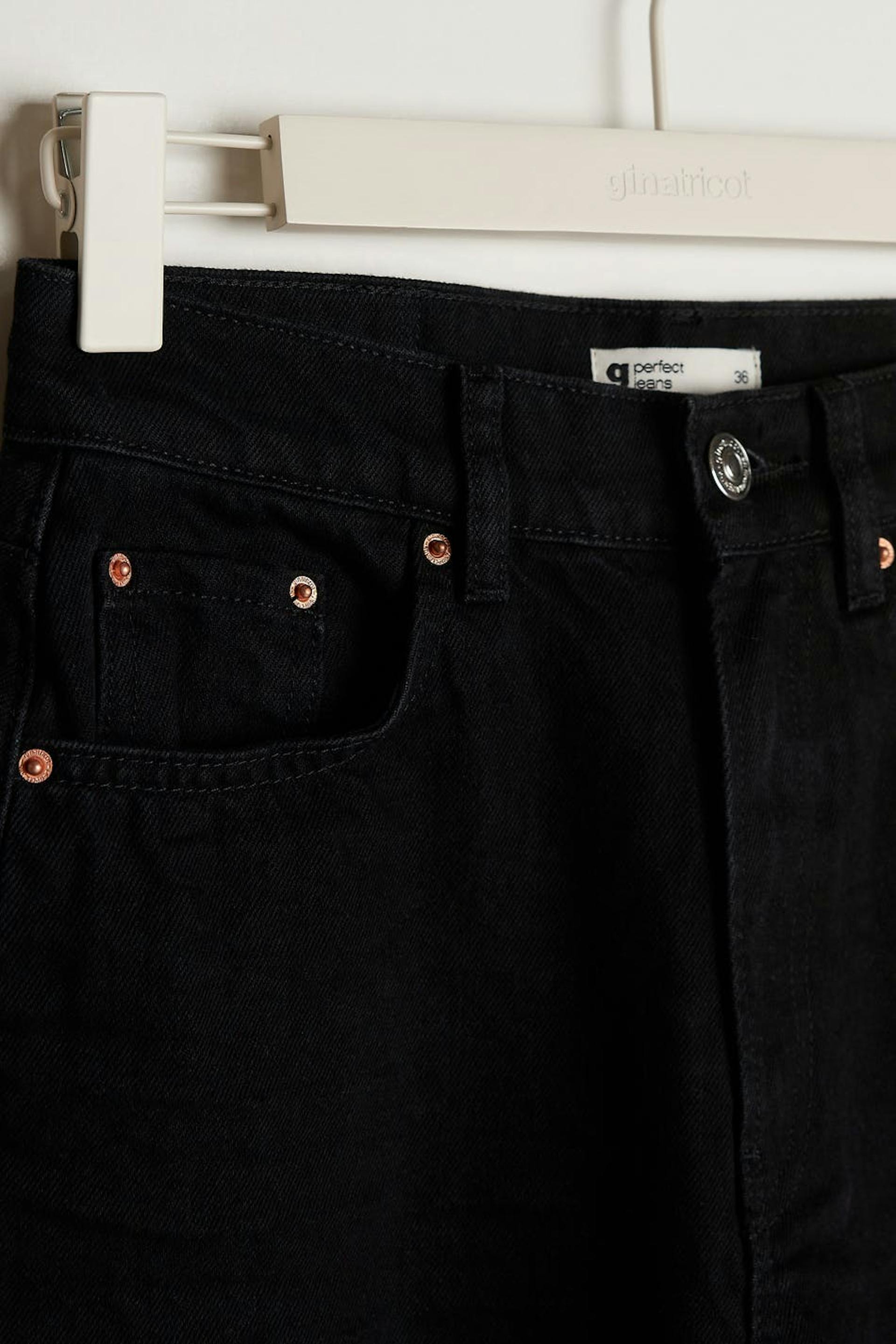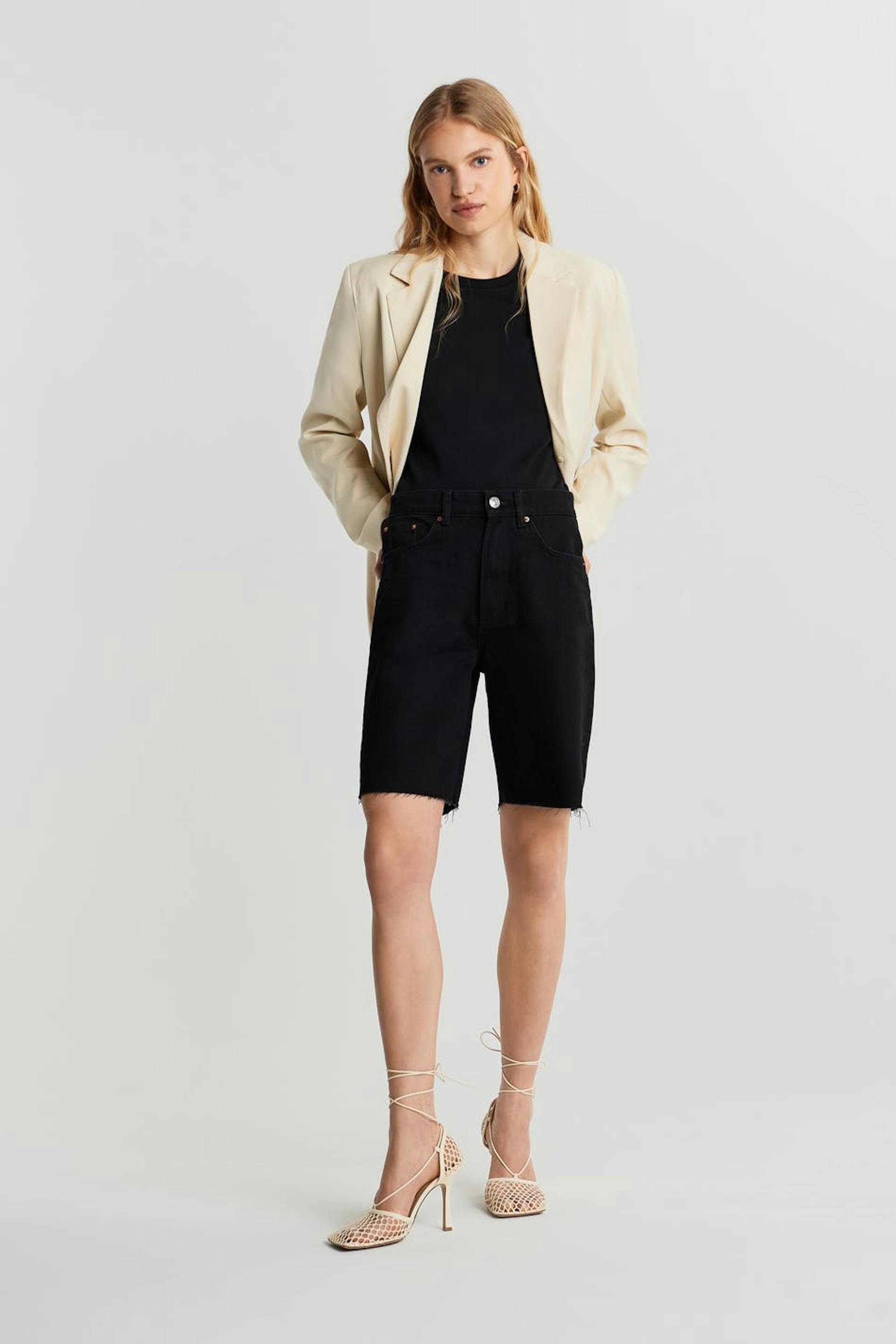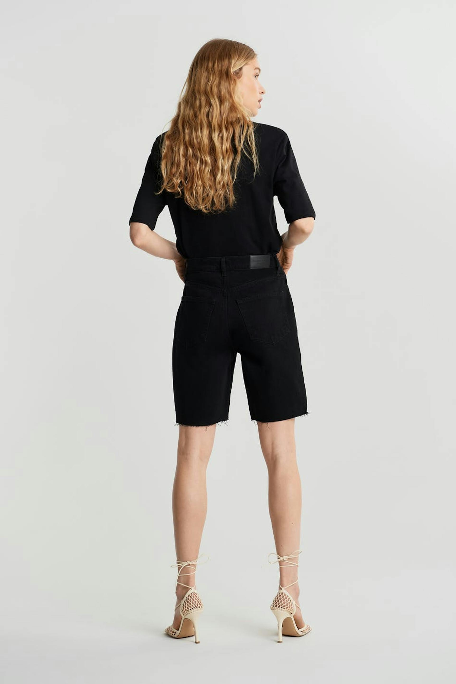 Non-stretche jeans-shorts med en 90-tallsinspirert, rett passform. Shortsen er svart og har en rå skjørtelengde på bunnen. Den har en lenger lengde.
