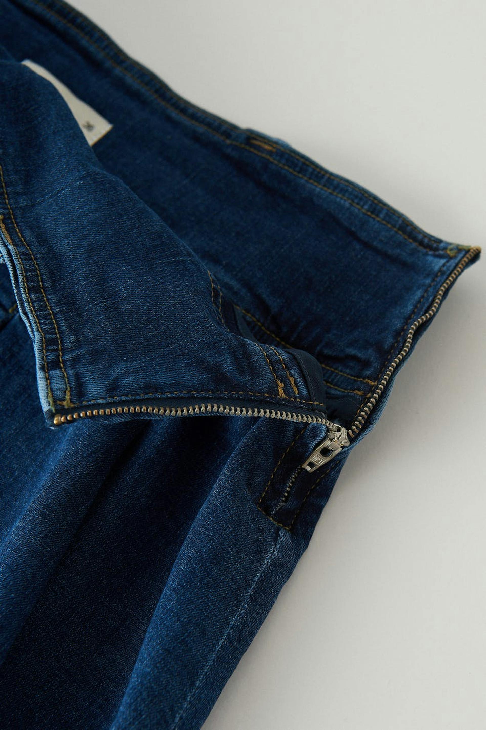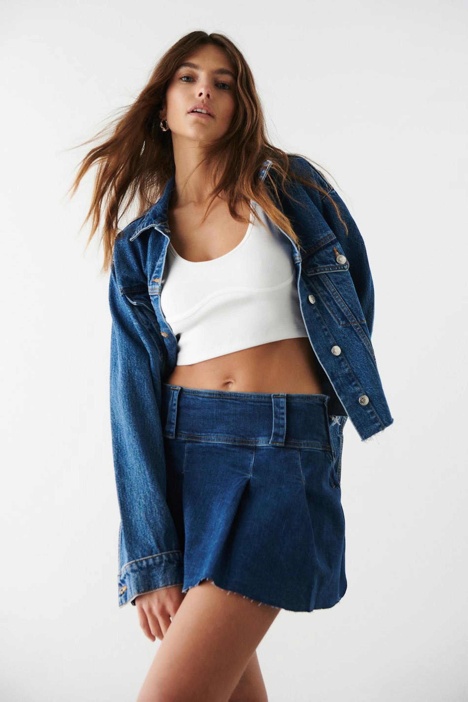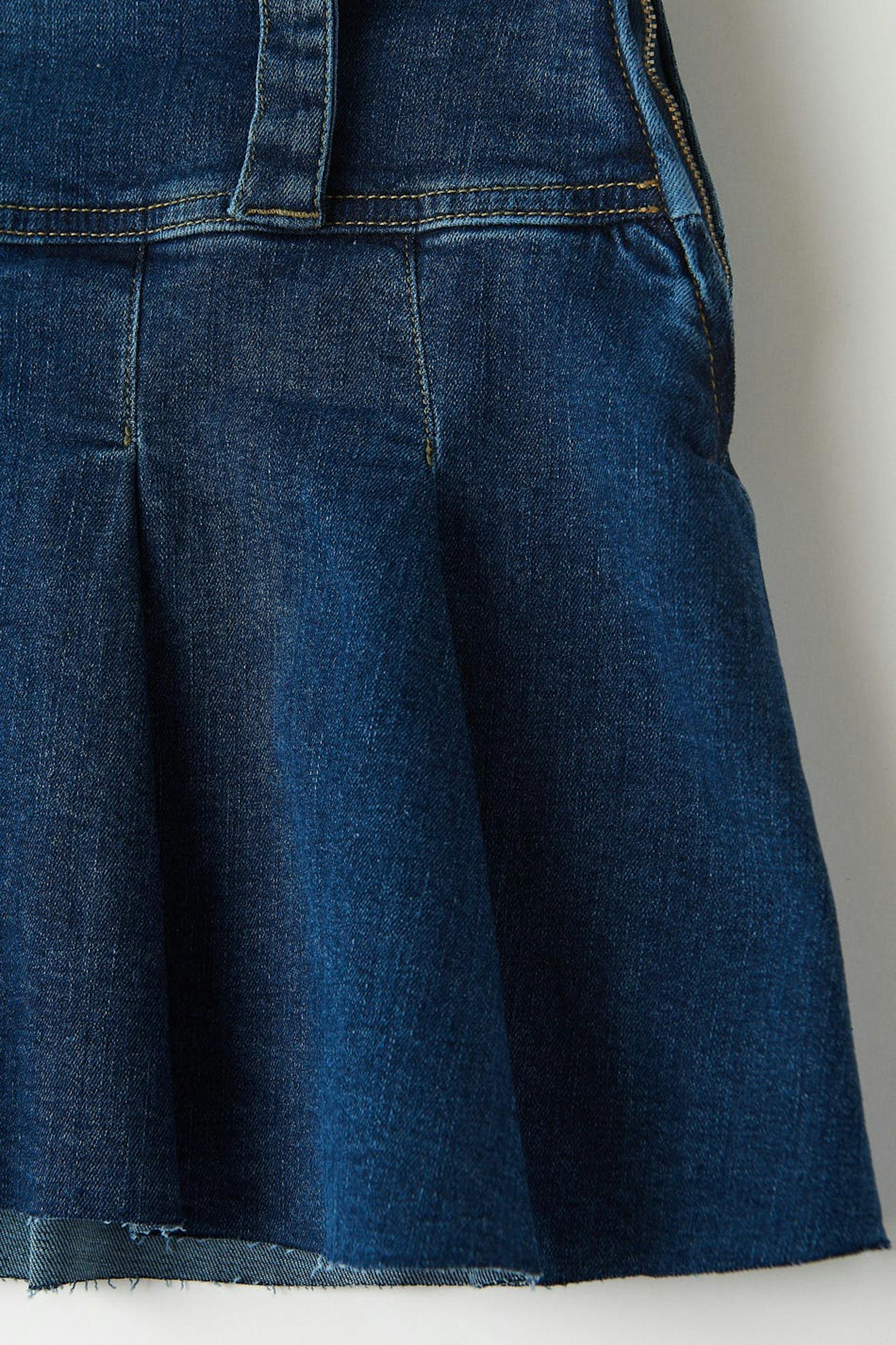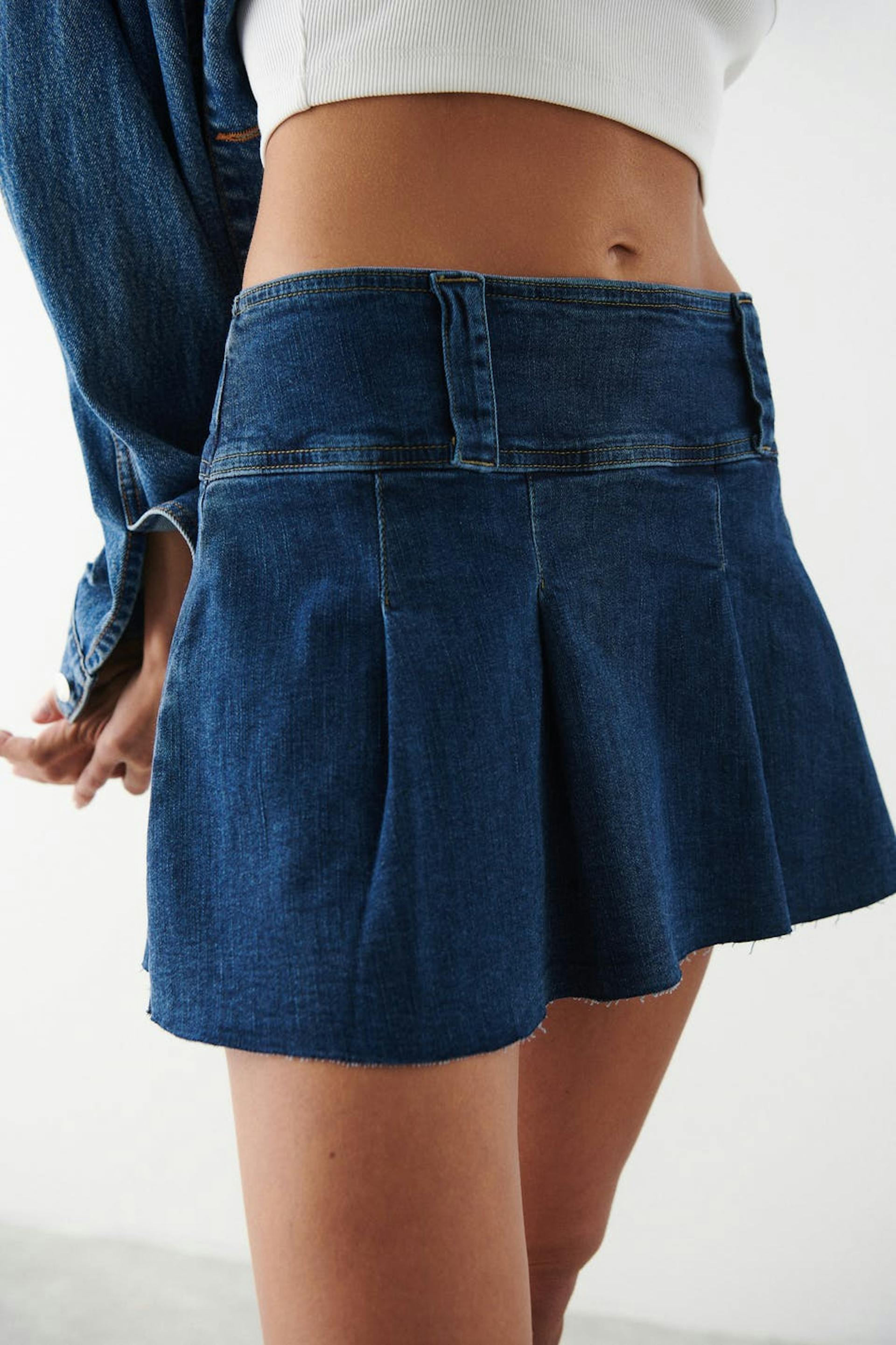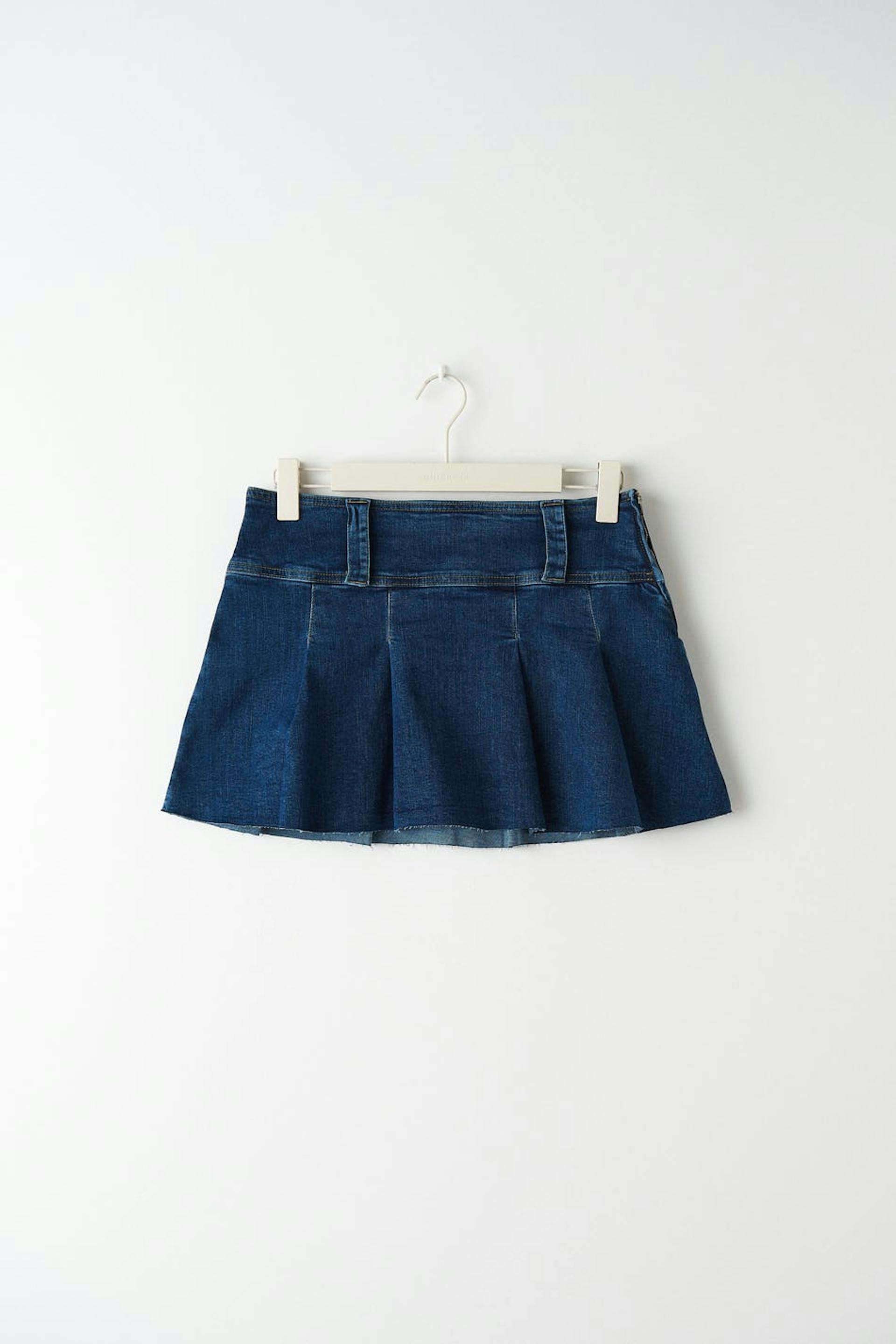 Plissertt denim skjørt med lav midje. Skjørtet er mørkeblått og har en rå kant på bunnen. Det har bredt linning med beltestropper og glidelås i sidesømmen.