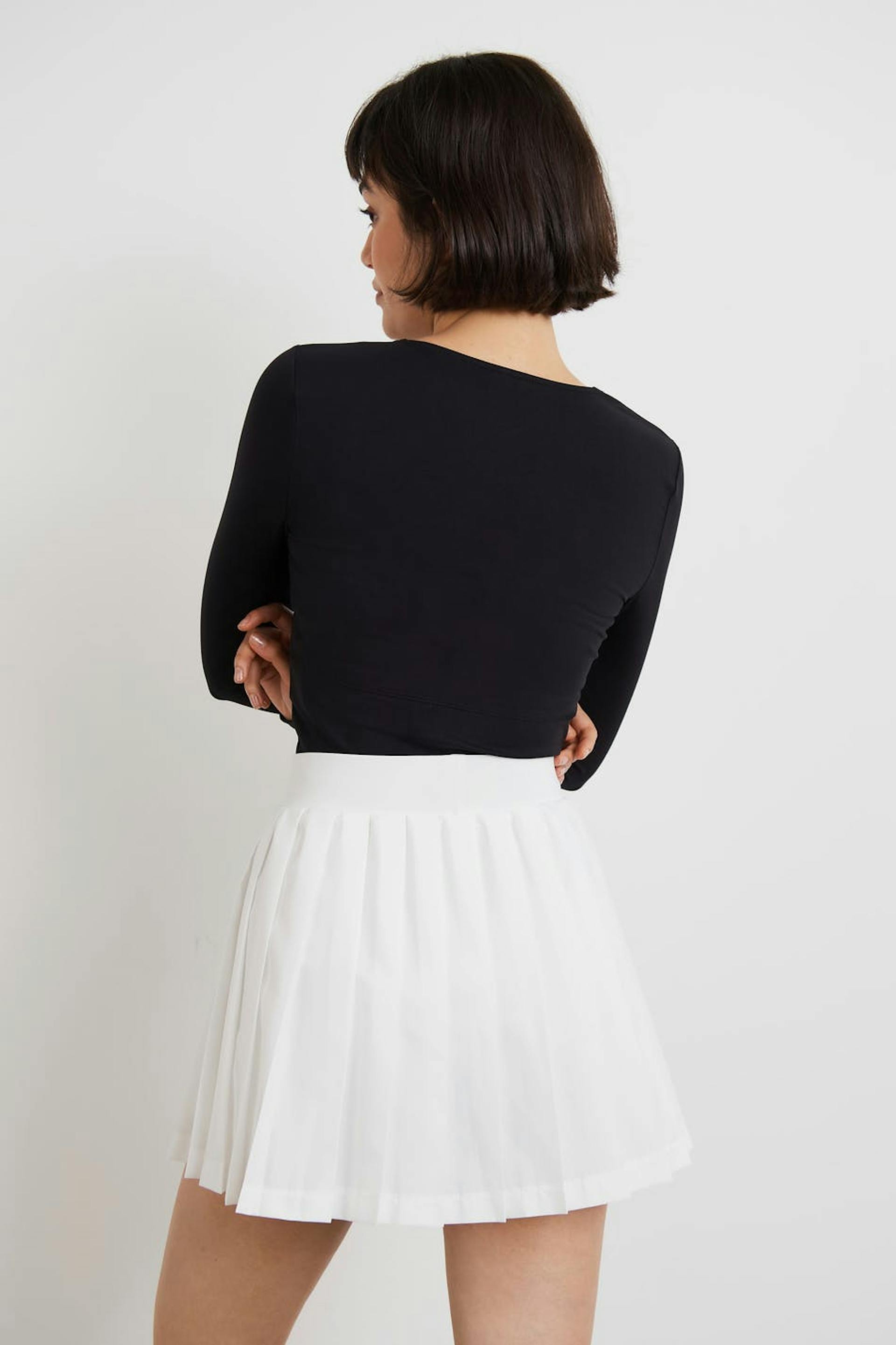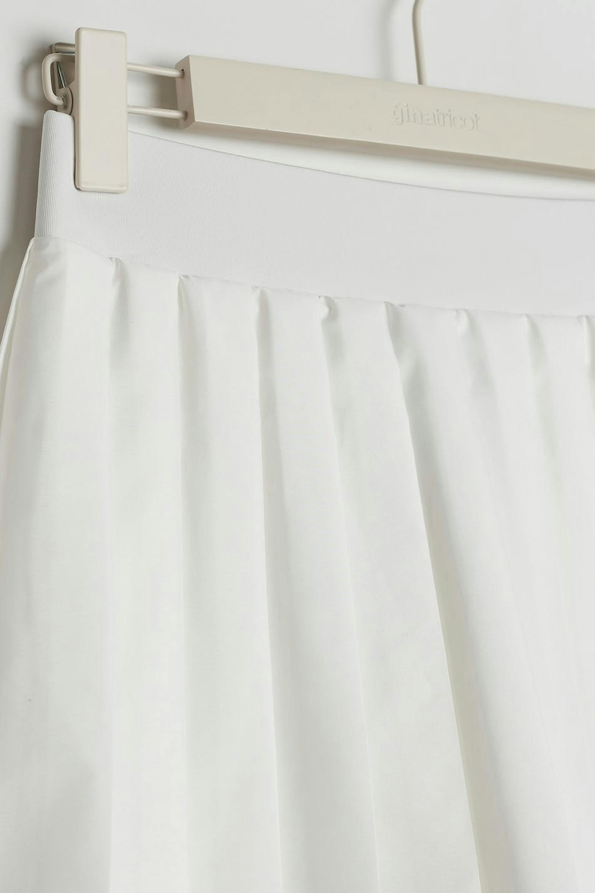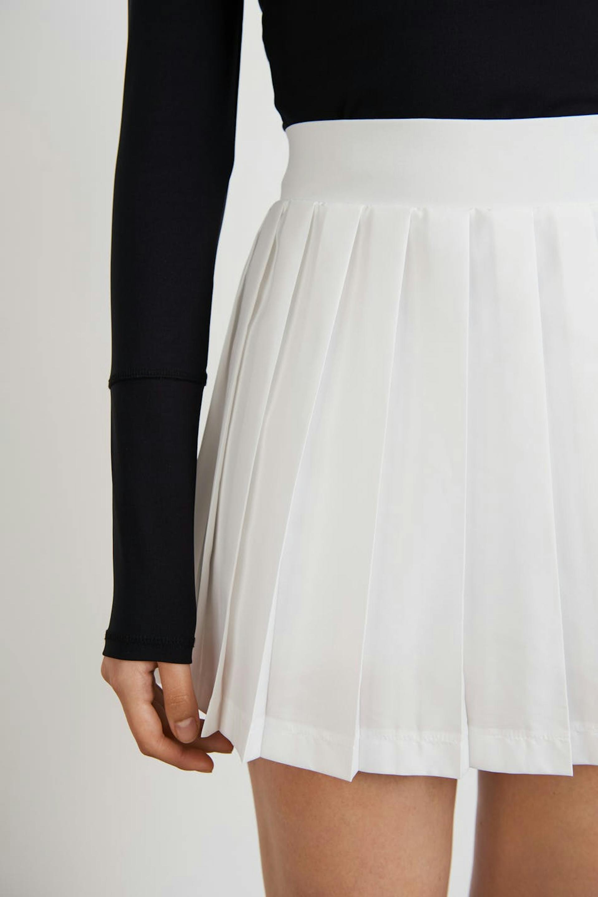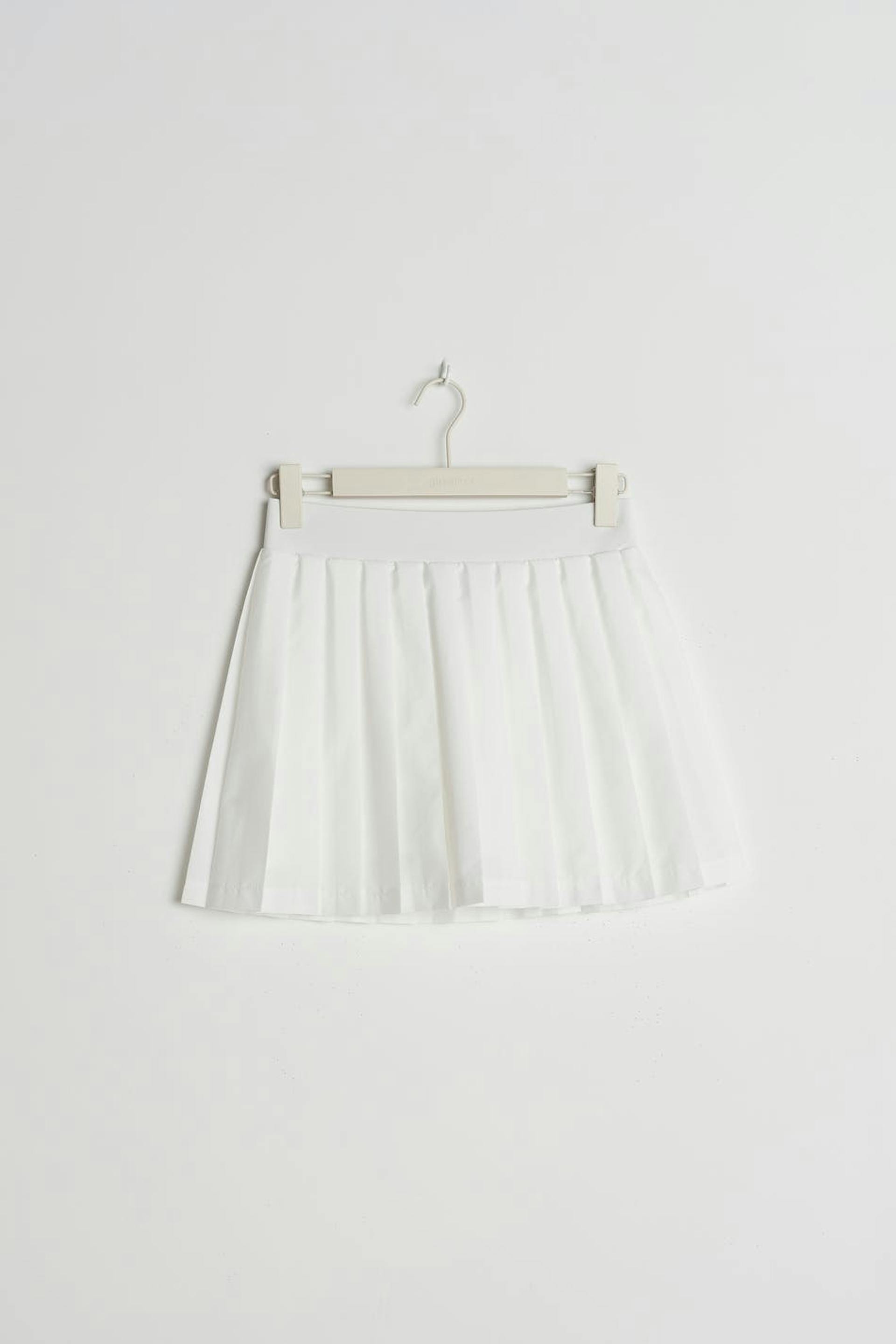RS X Gina Tricot. Plissertt padelskjørt med en vanlig passform. Skjørtet er hvitt og har en myk elastisk strikk ved midjen. Det har en shorts under.