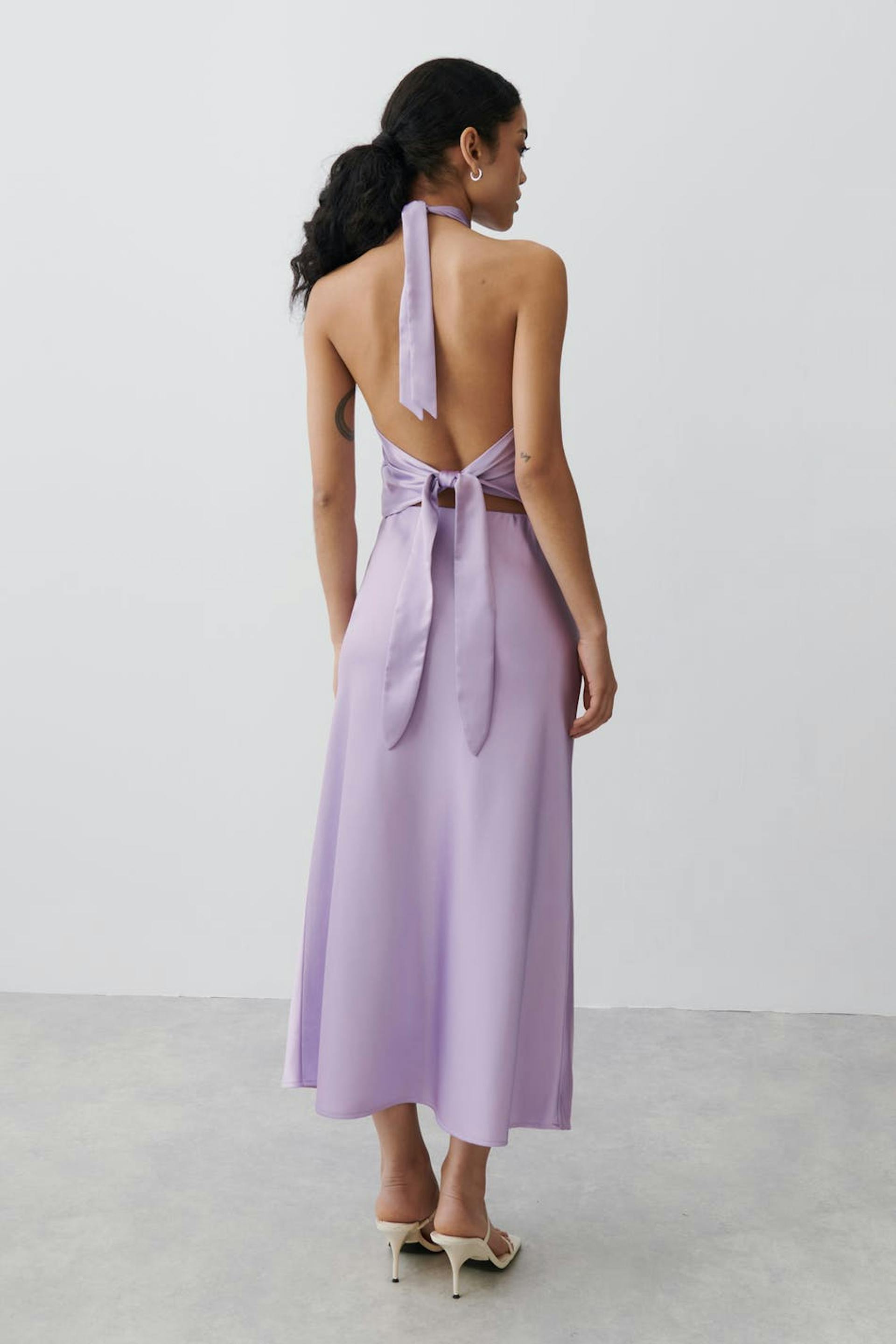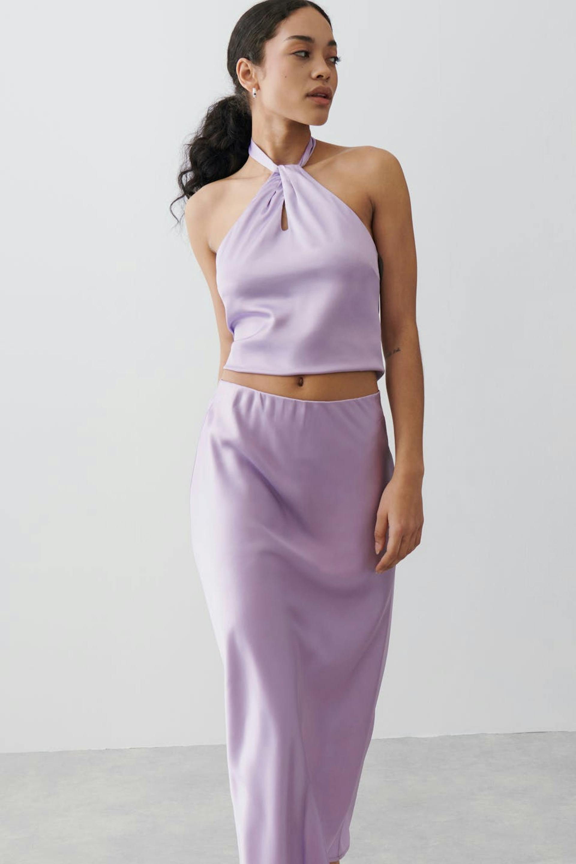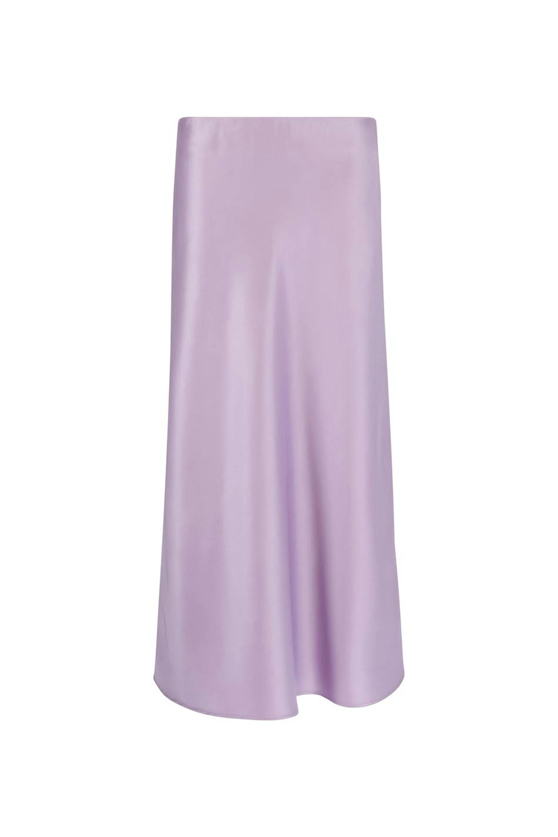 Satengskjørt med gummistrikk ved midjen. Skjørtet er lilla og har myk, skinnende kvalitet.