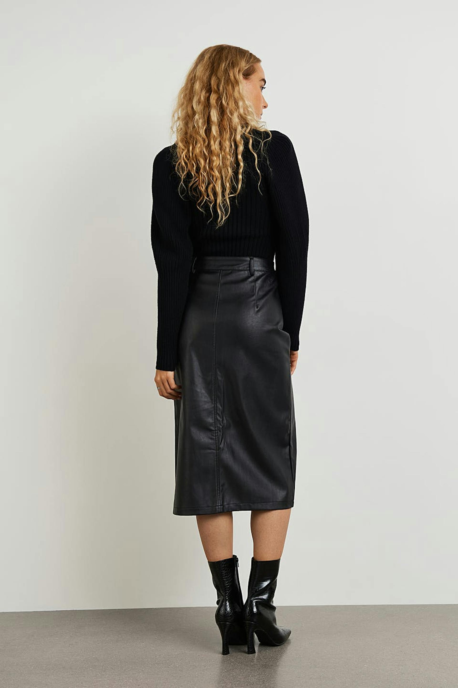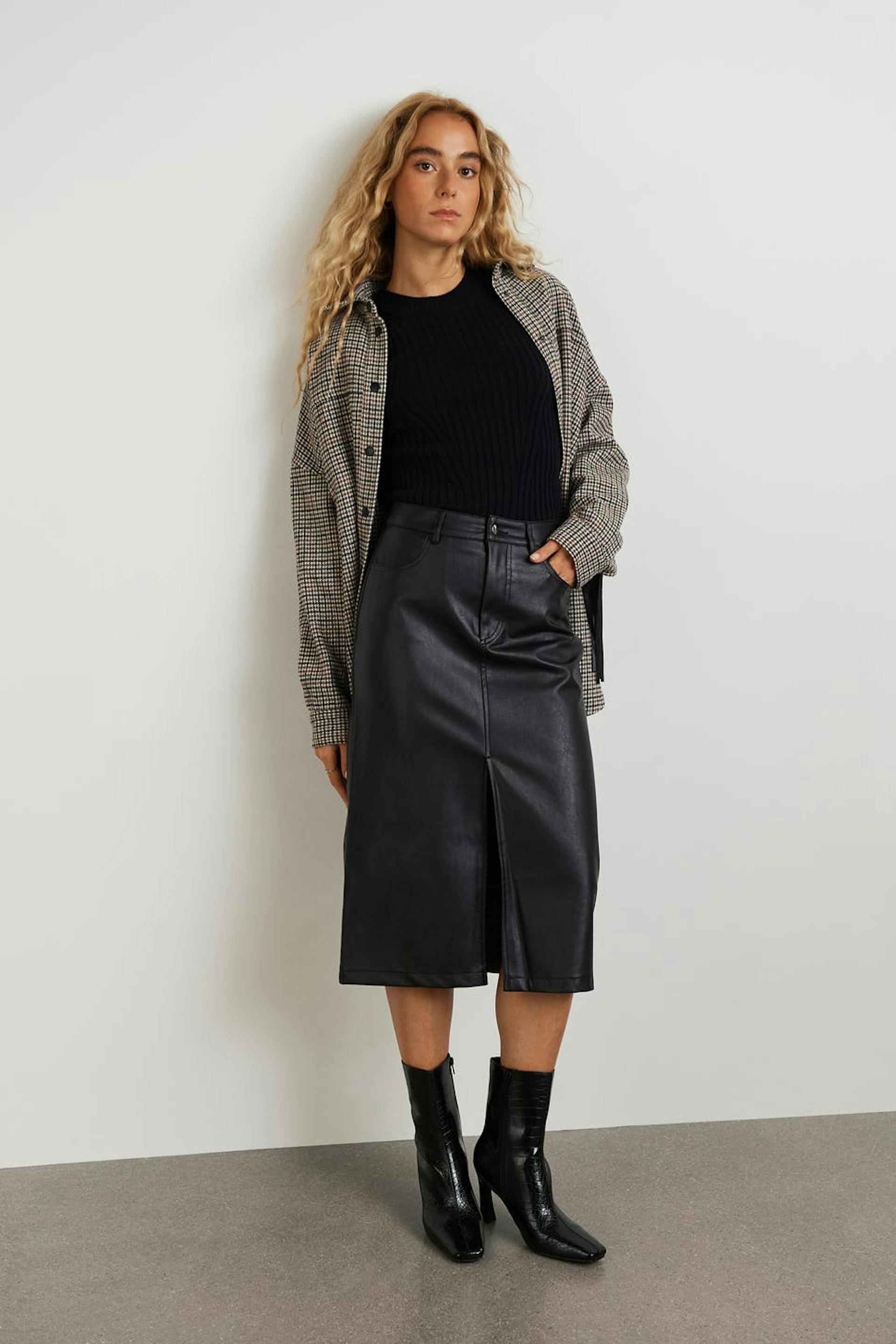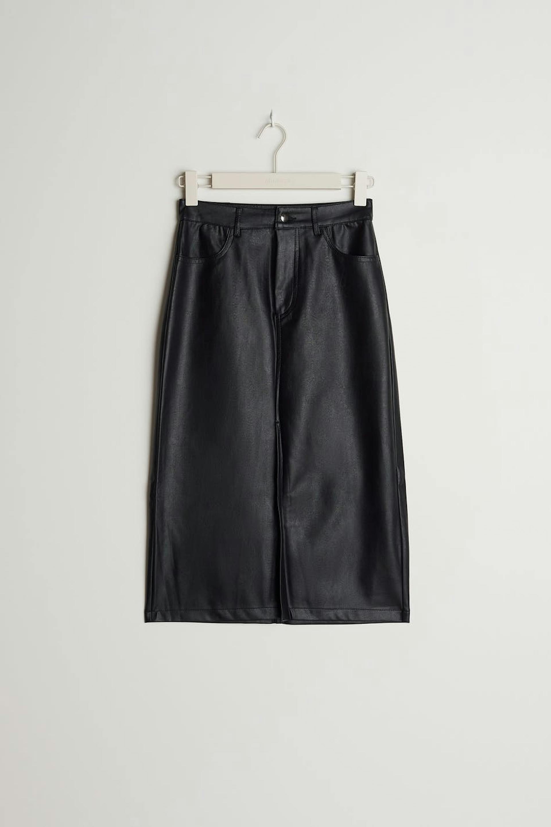 Midi skjørt med et fuskeskinnmateriale. Skjørtet er svart og har en splitt foran. Det har dekorative sømdetaljer og lommer på framsiden.