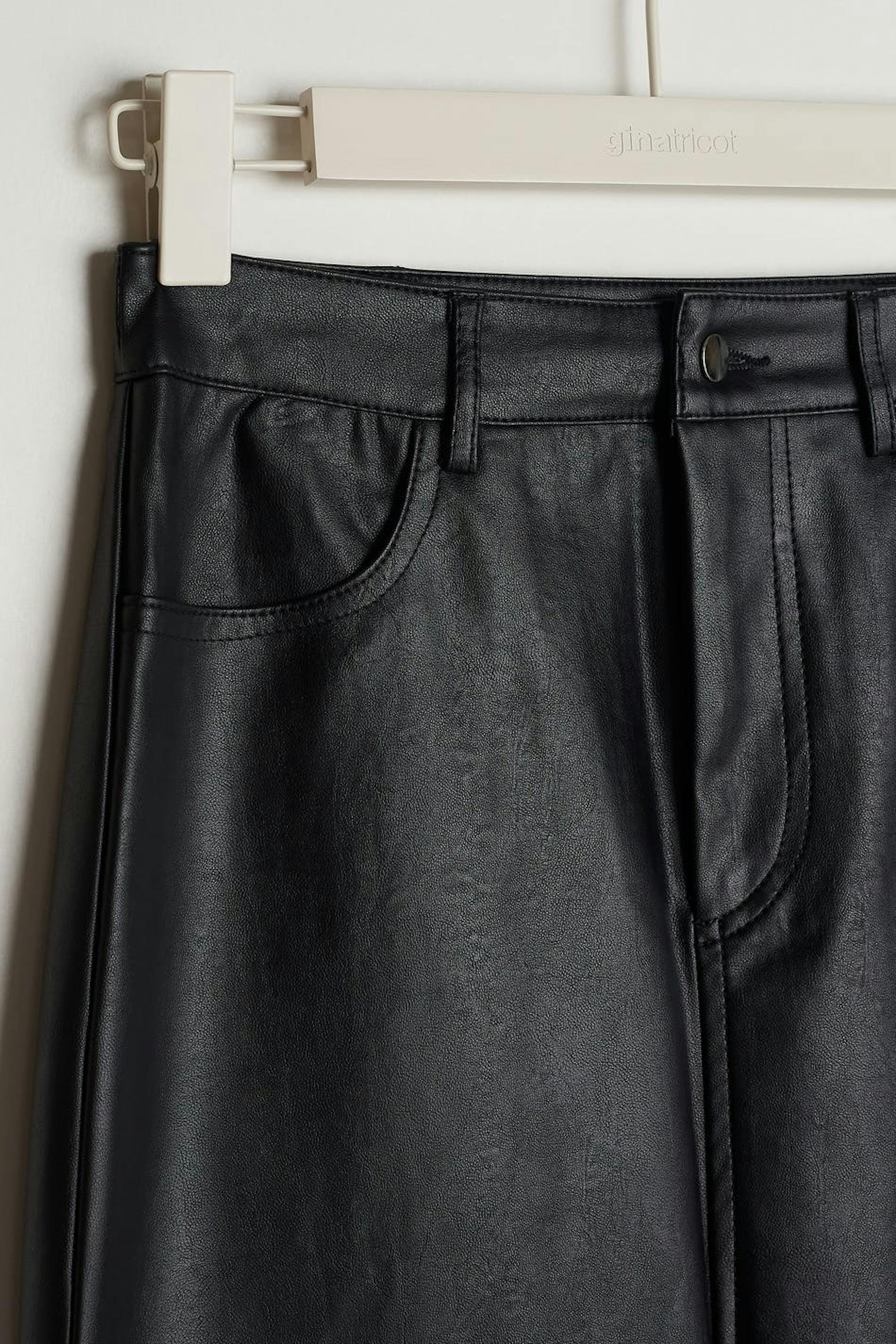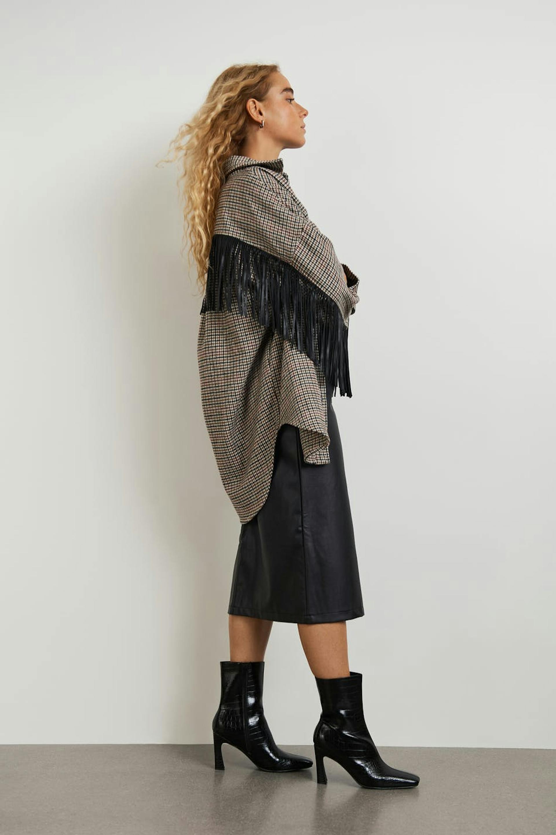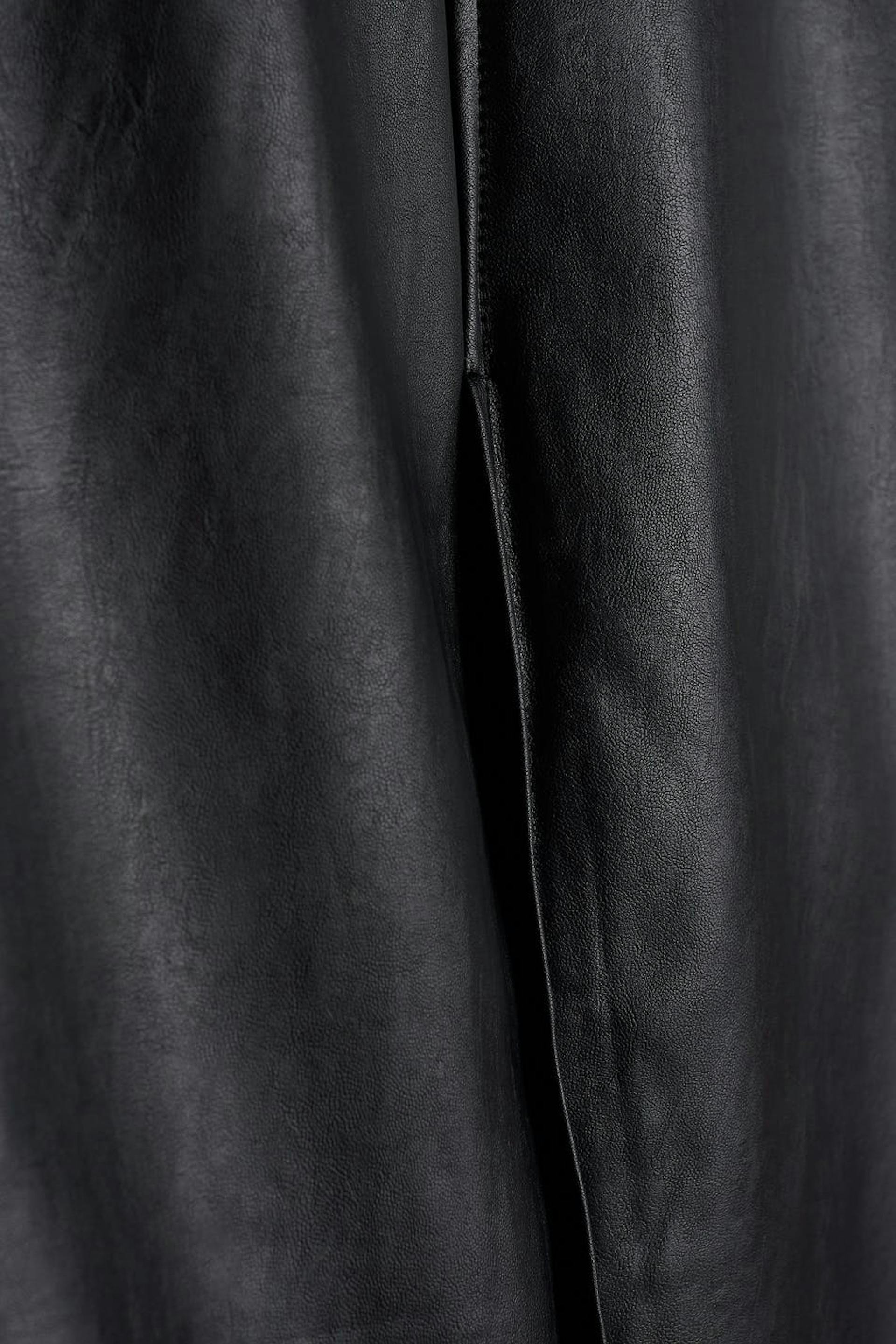 Midi skjørt med et fuskeskinnmateriale. Skjørtet er svart og har en splitt foran. Det har dekorative sømdetaljer og lommer på framsiden.