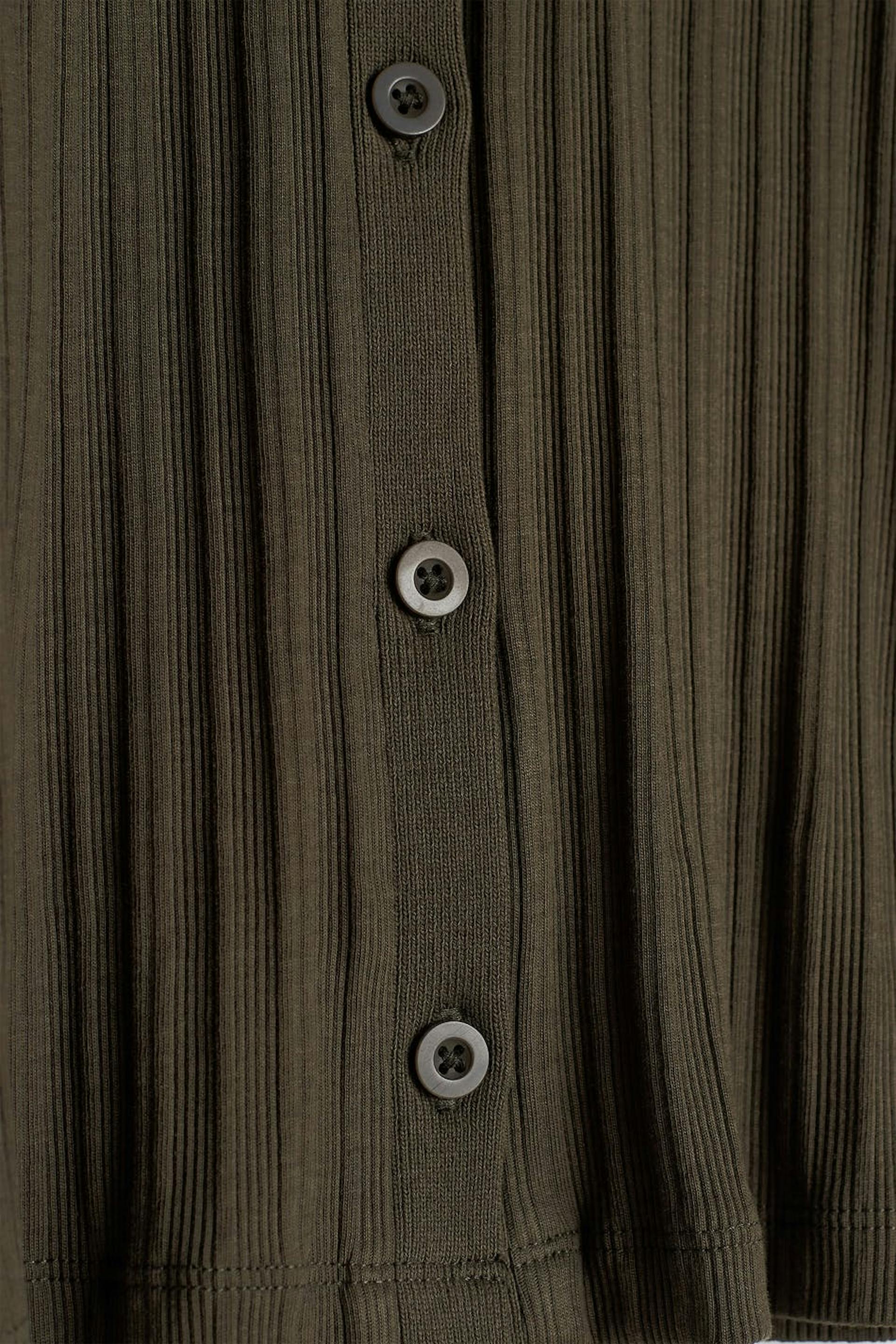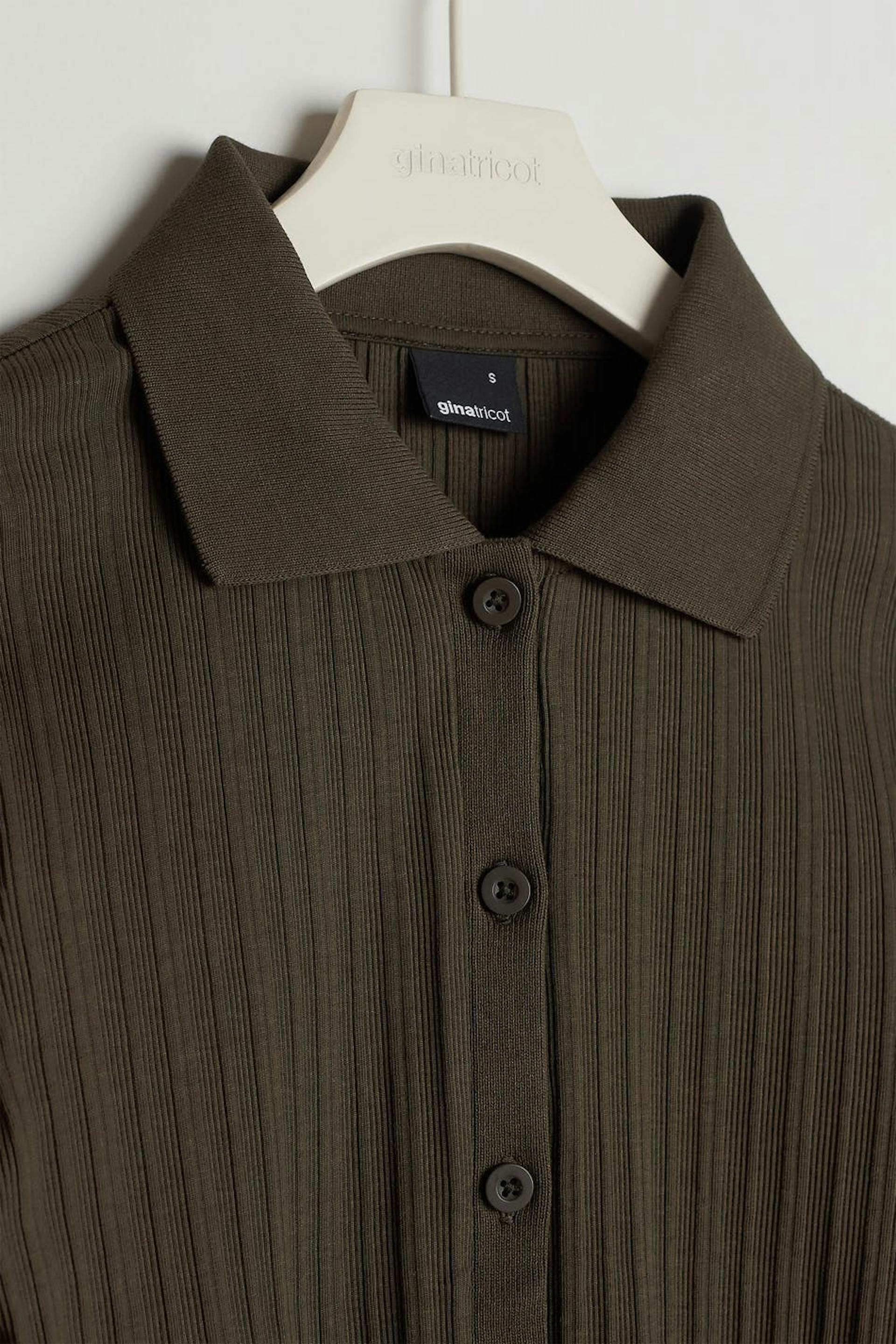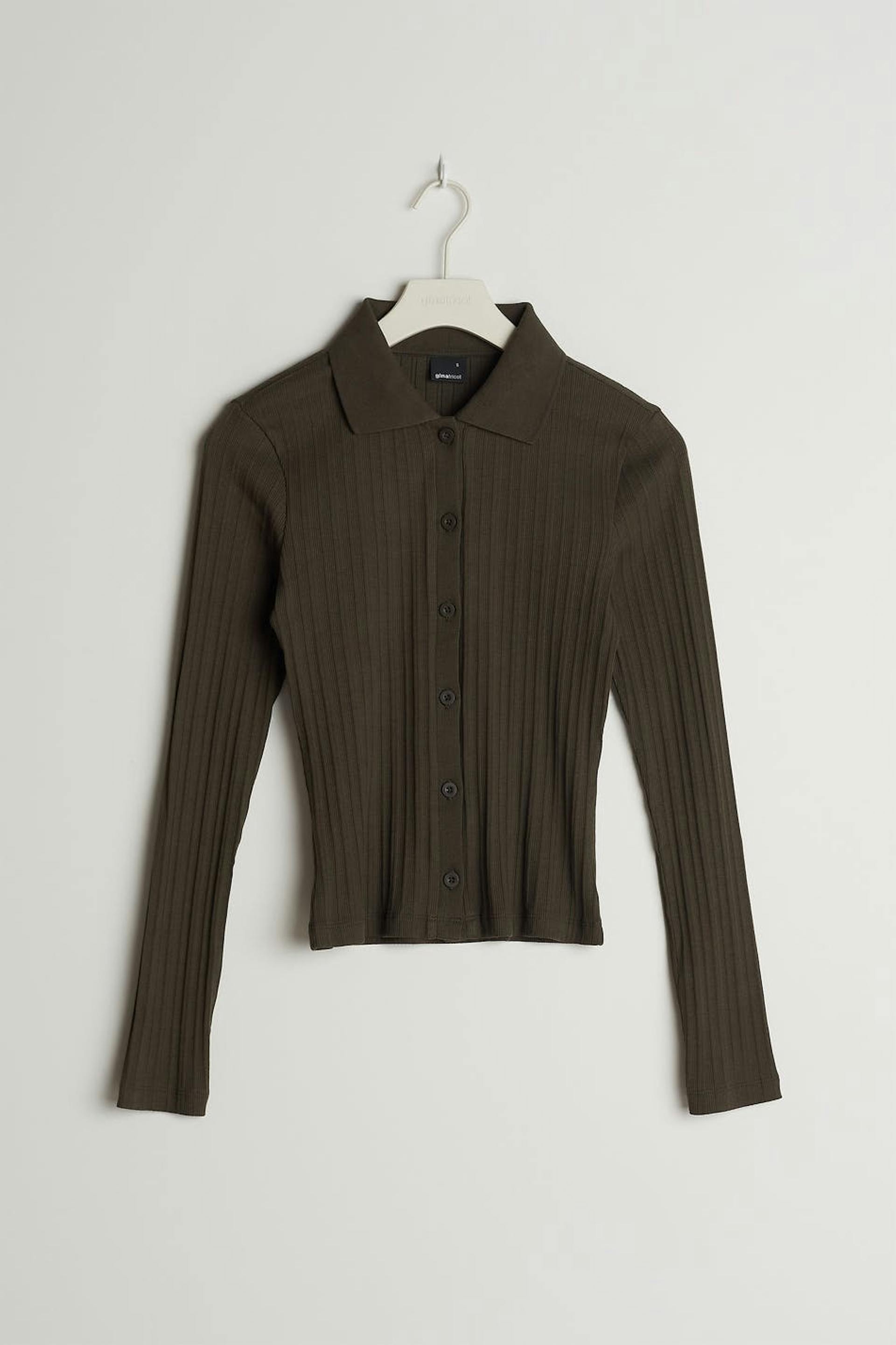 Ribbet topp med en tilpasset passform. Toppen er brun og langermet og har en v-hals. Den har en krage og en knappstolpe foran.