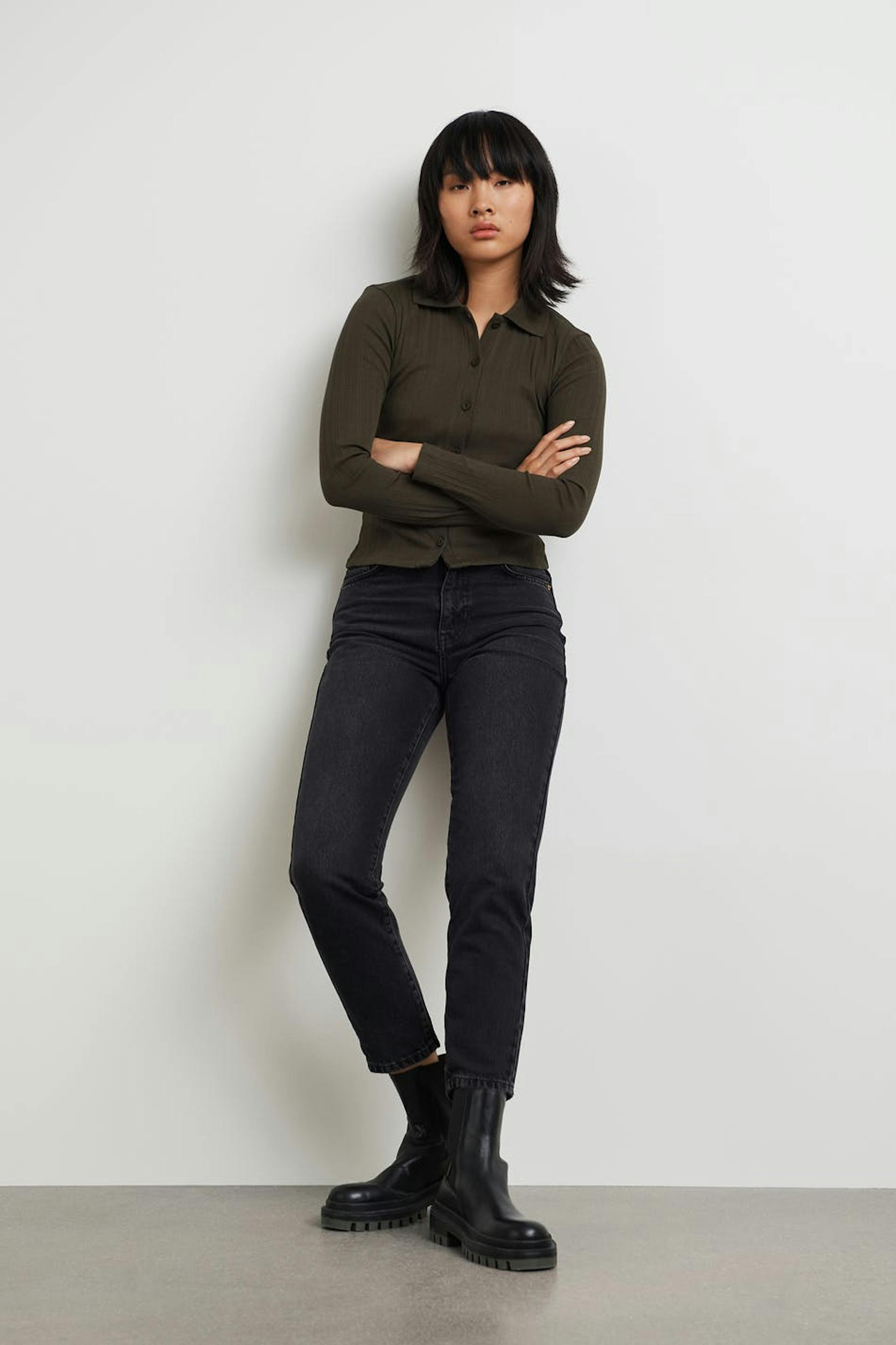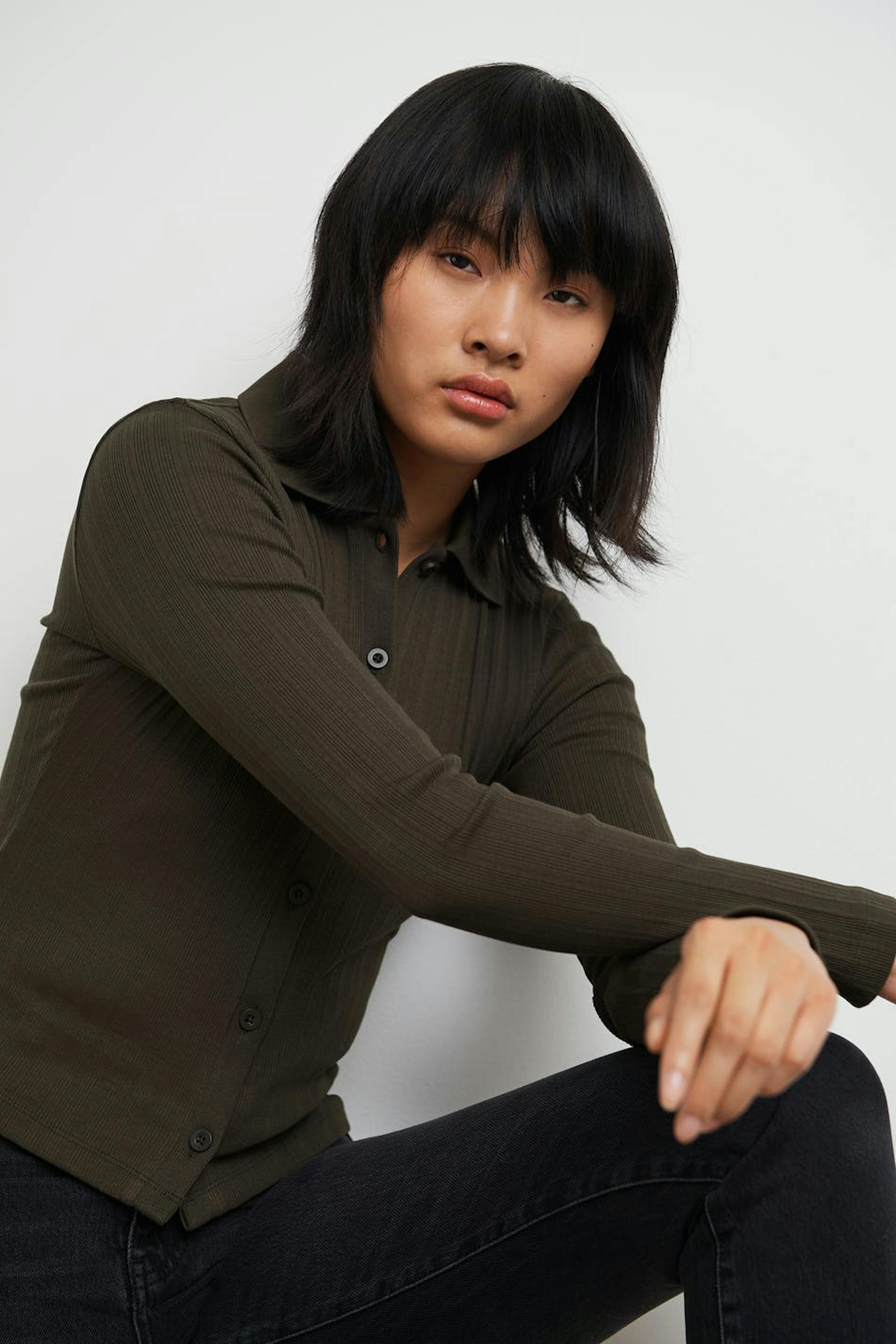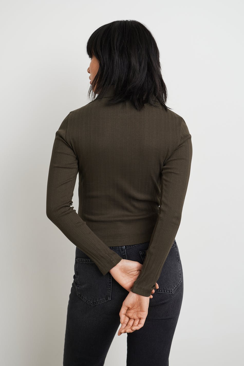 Ribbet topp med en tilpasset passform. Toppen er brun og langermet og har en v-hals. Den har en krage og en knappstolpe foran.