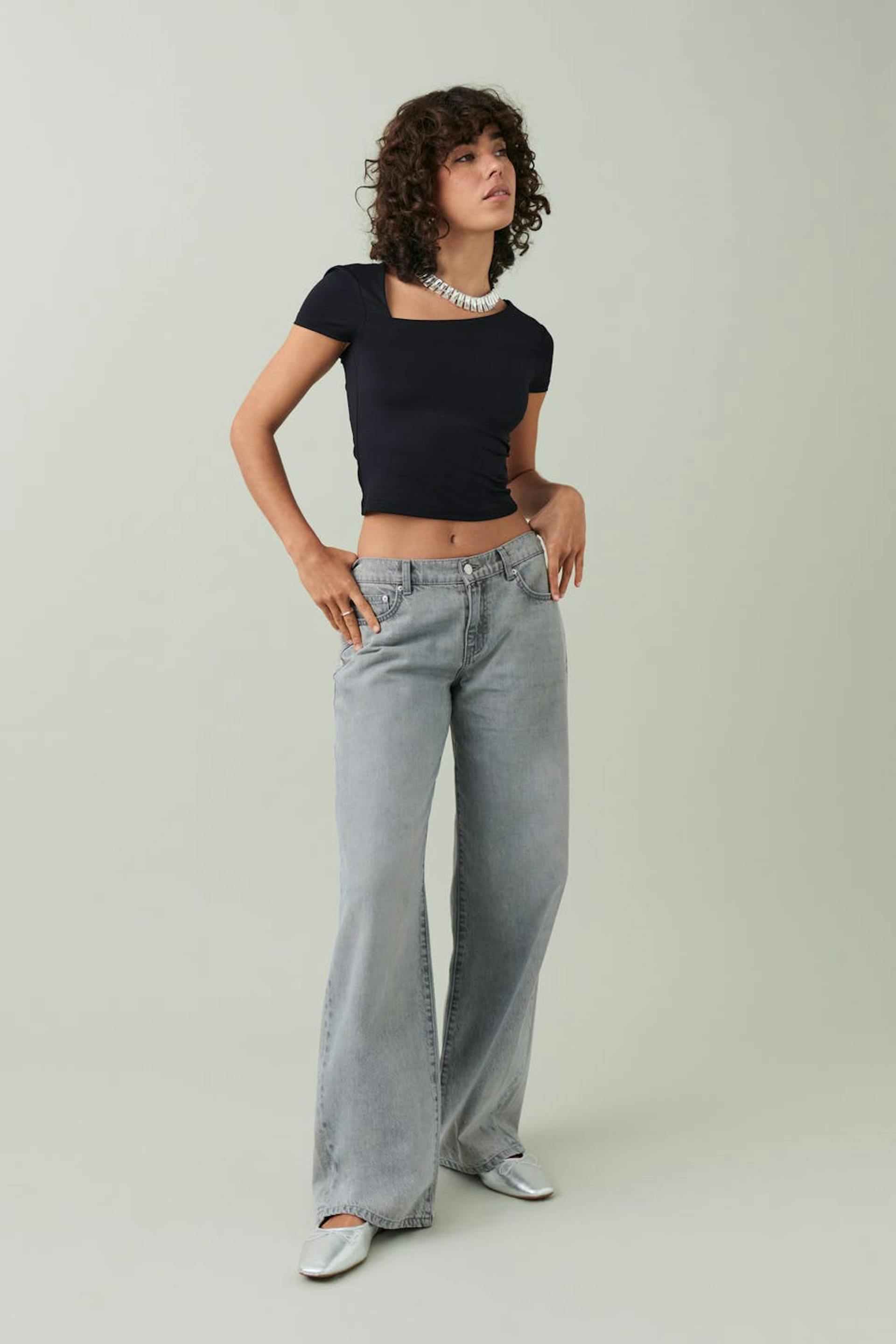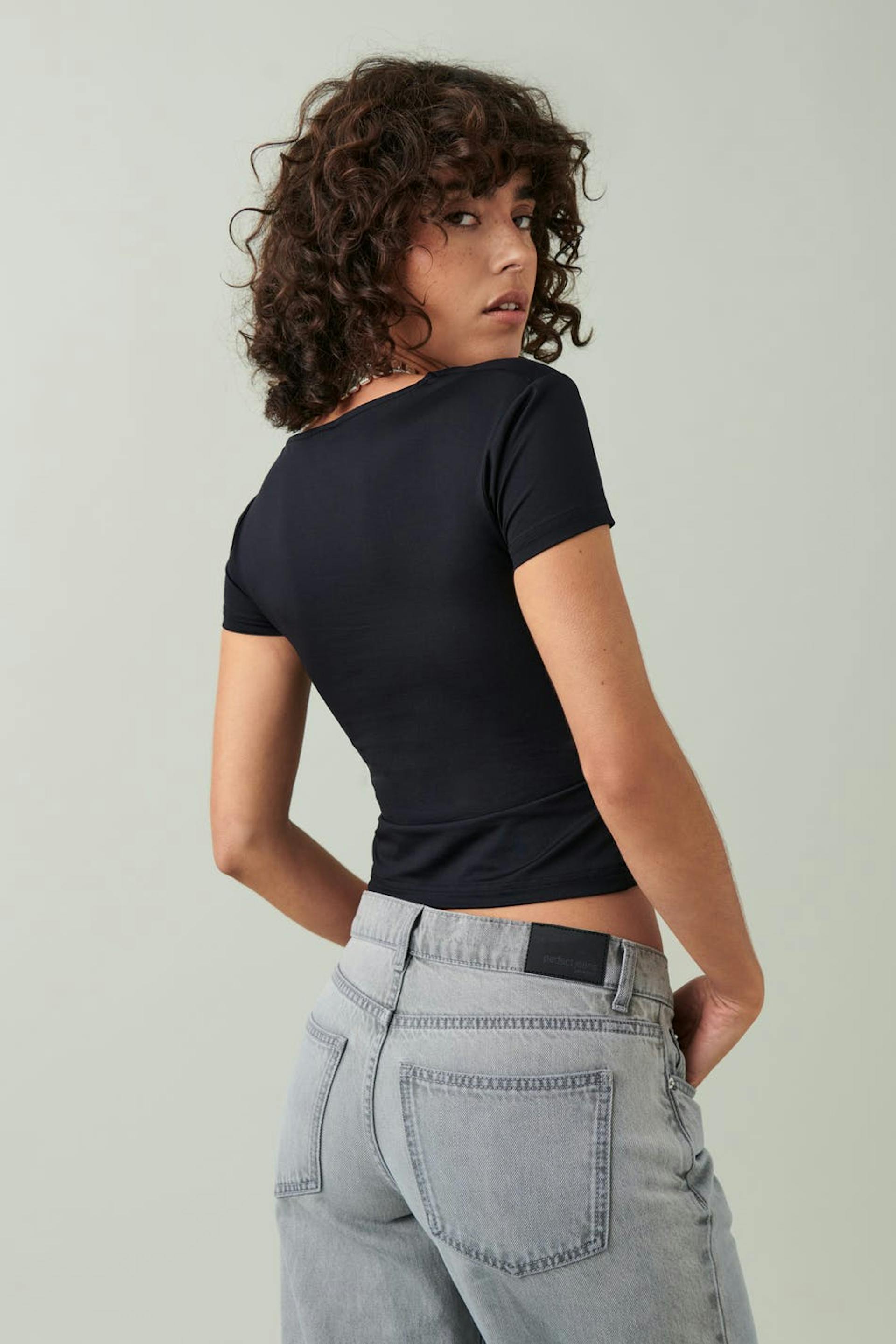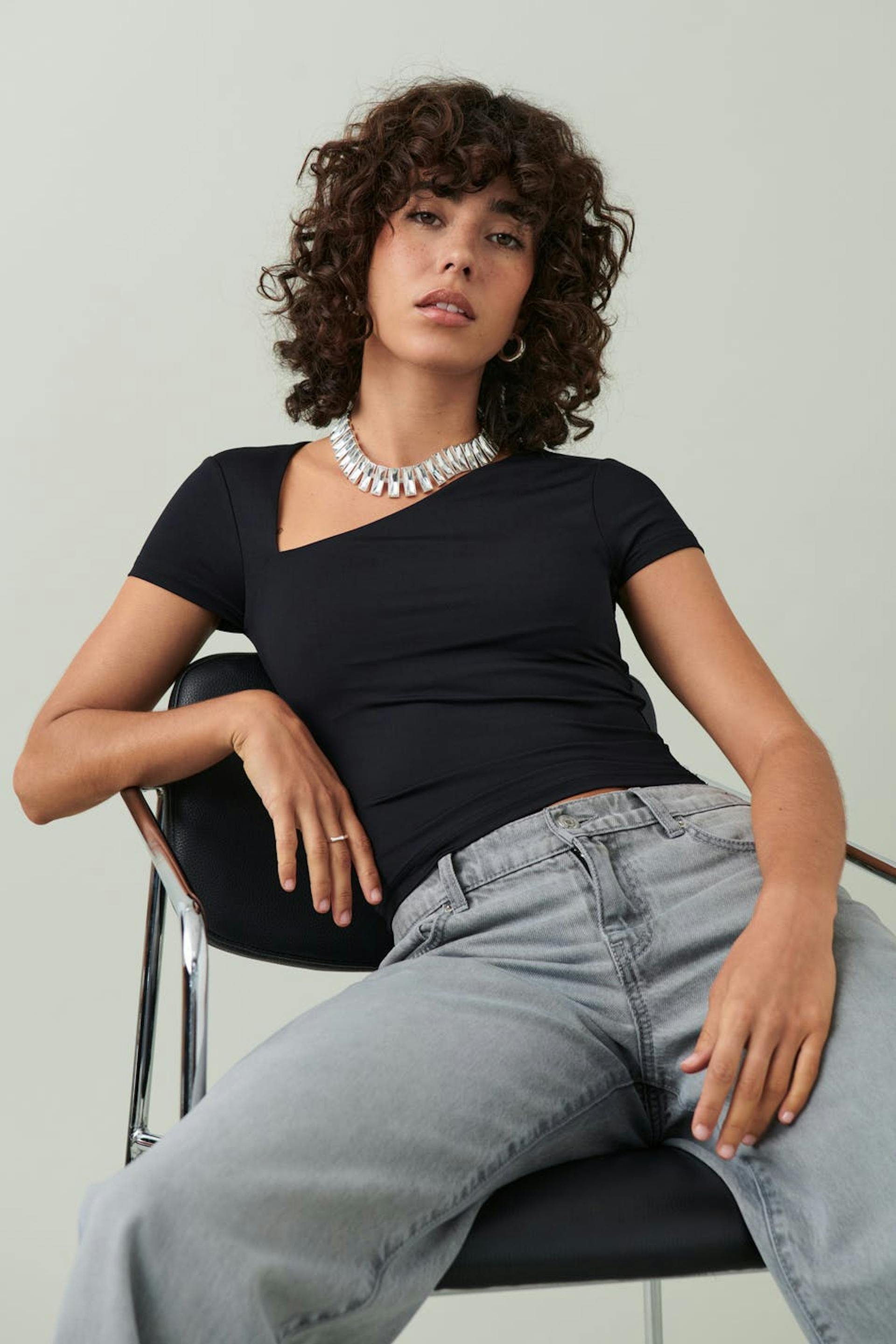 Kortermet topp med asymmetrisk hals. Toppen er svart og har figurnær passform.
