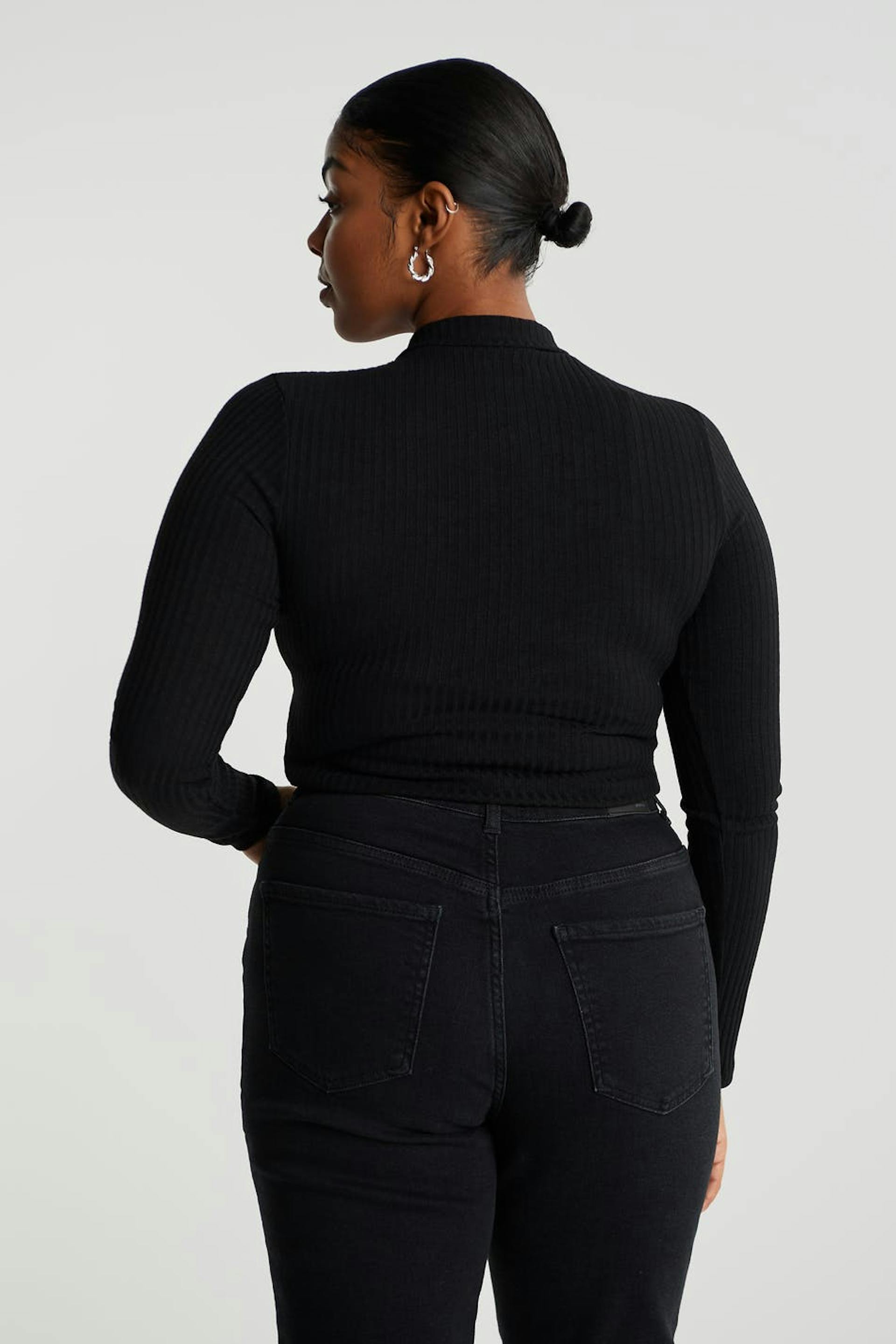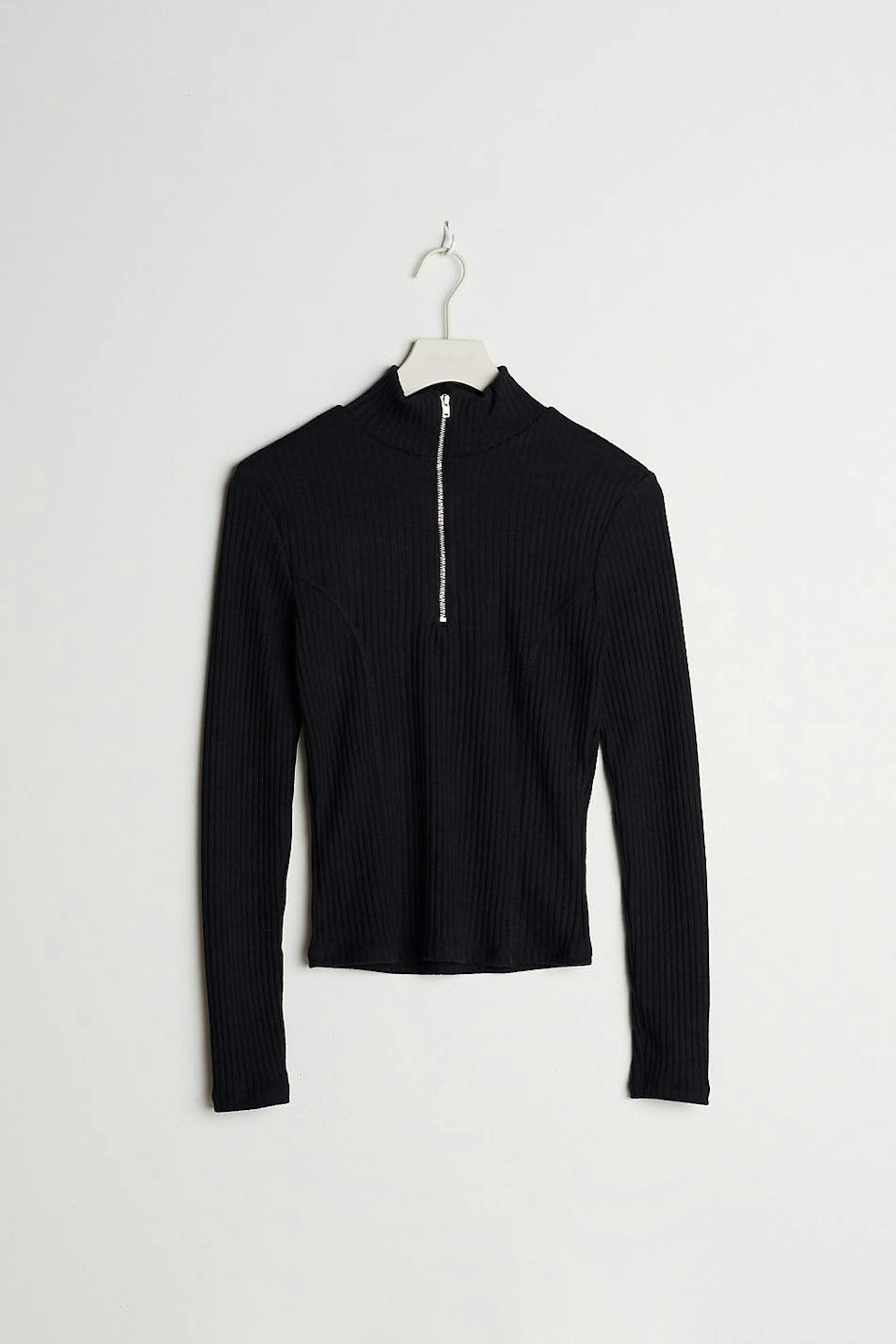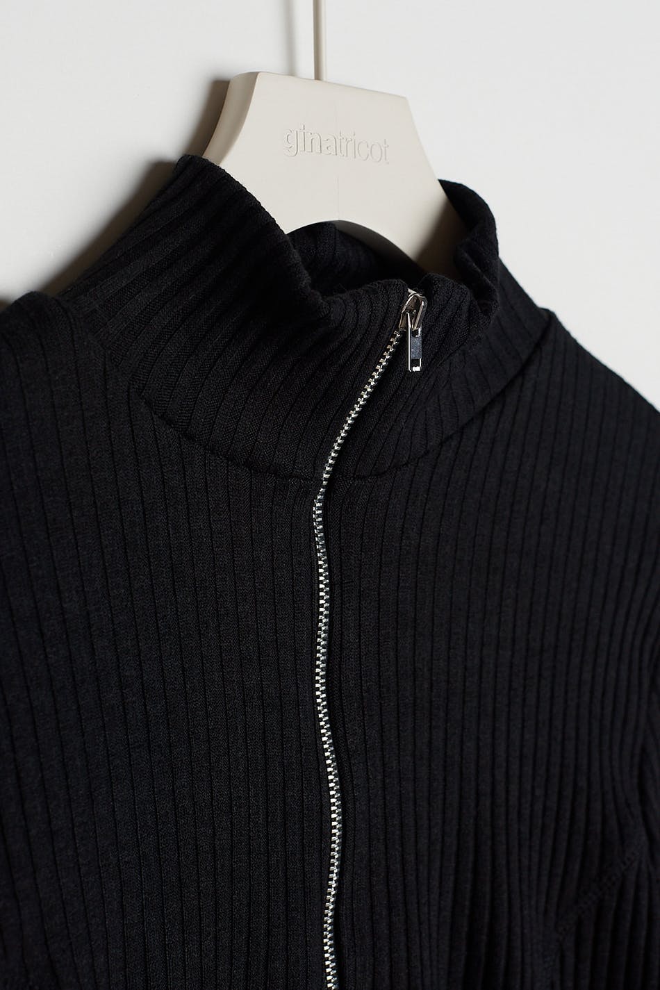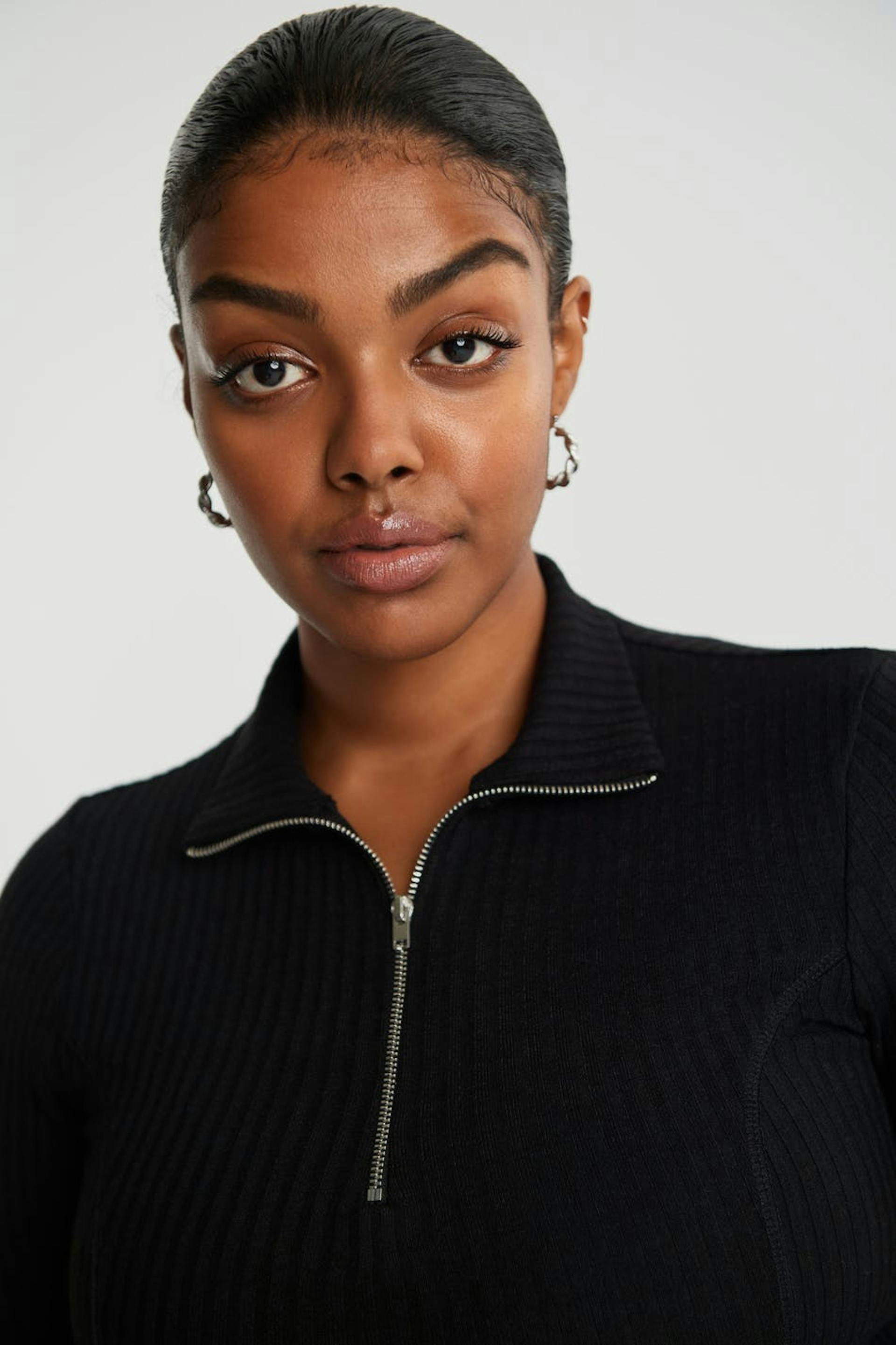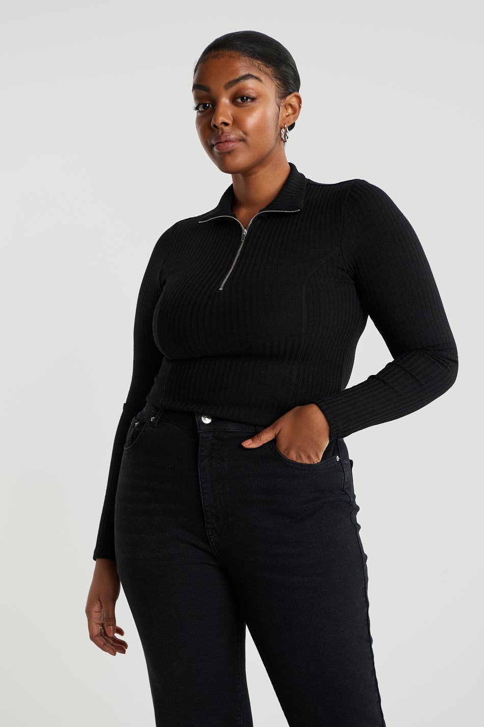 Langermet topp med en vanlig passform. Toppen er svart og ribbet og har en glidelås til halsen.
