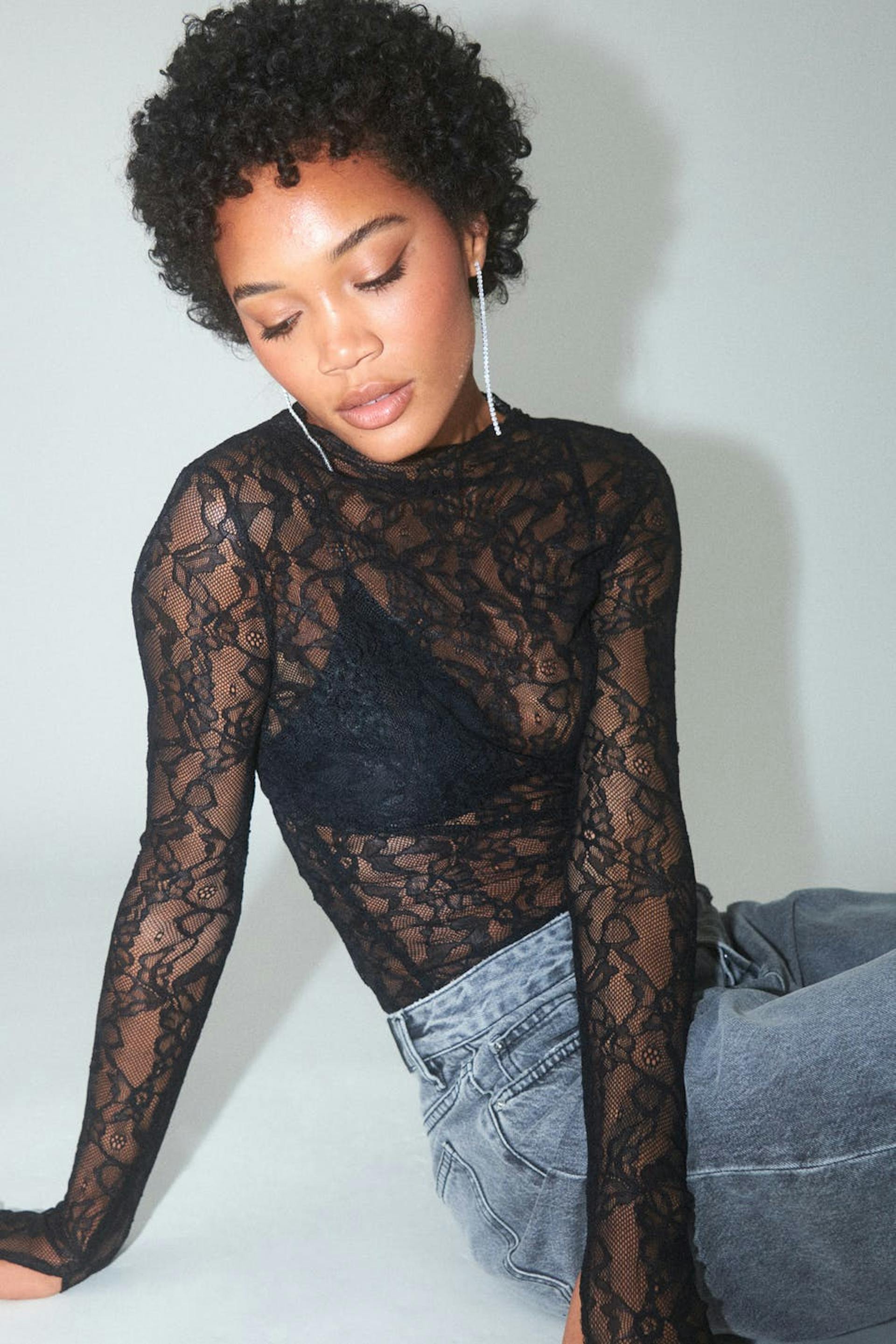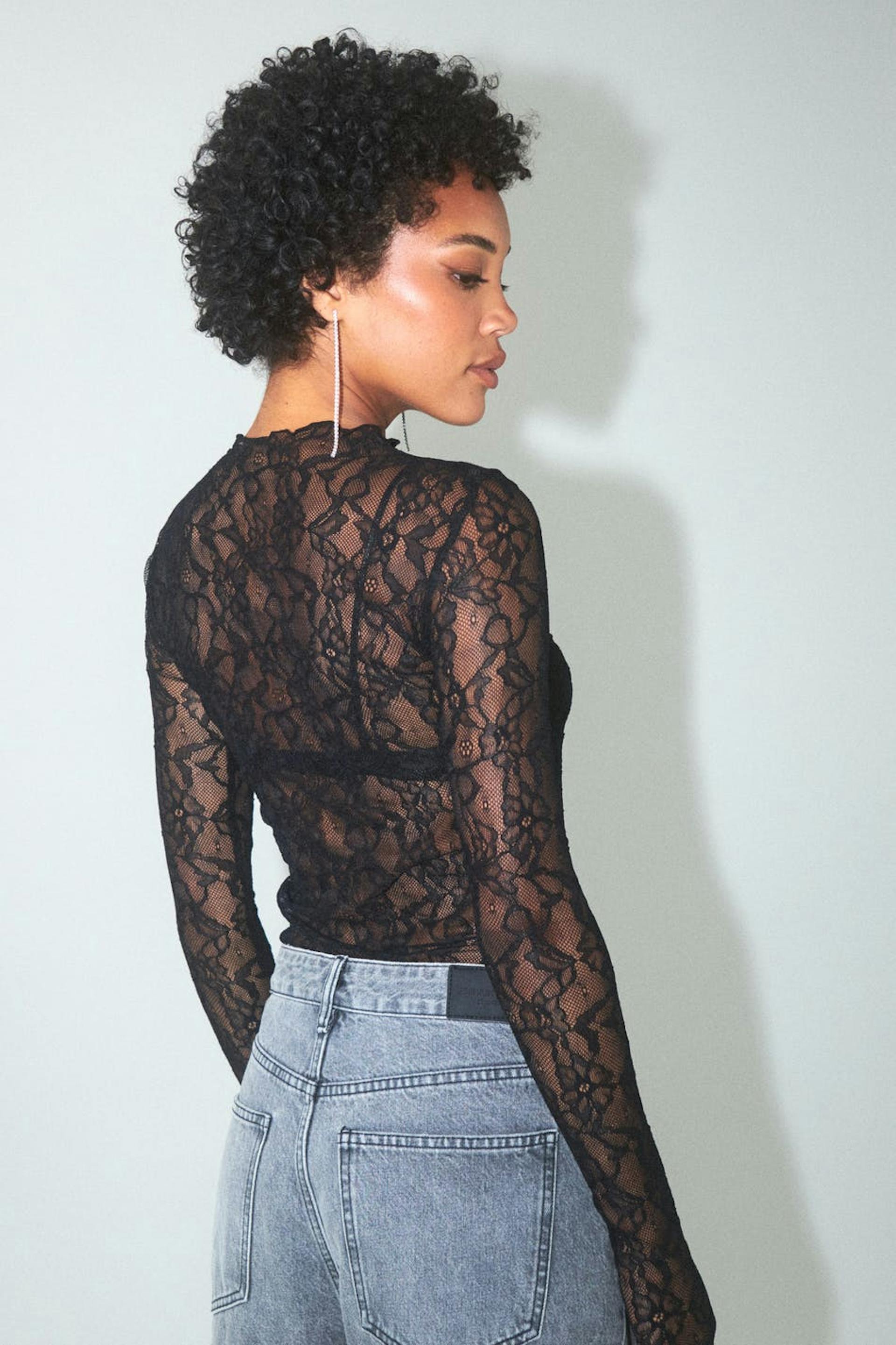 Langermet blondetopp med tommelhull på enden av ermene. Toppen er svart og har høy hals.