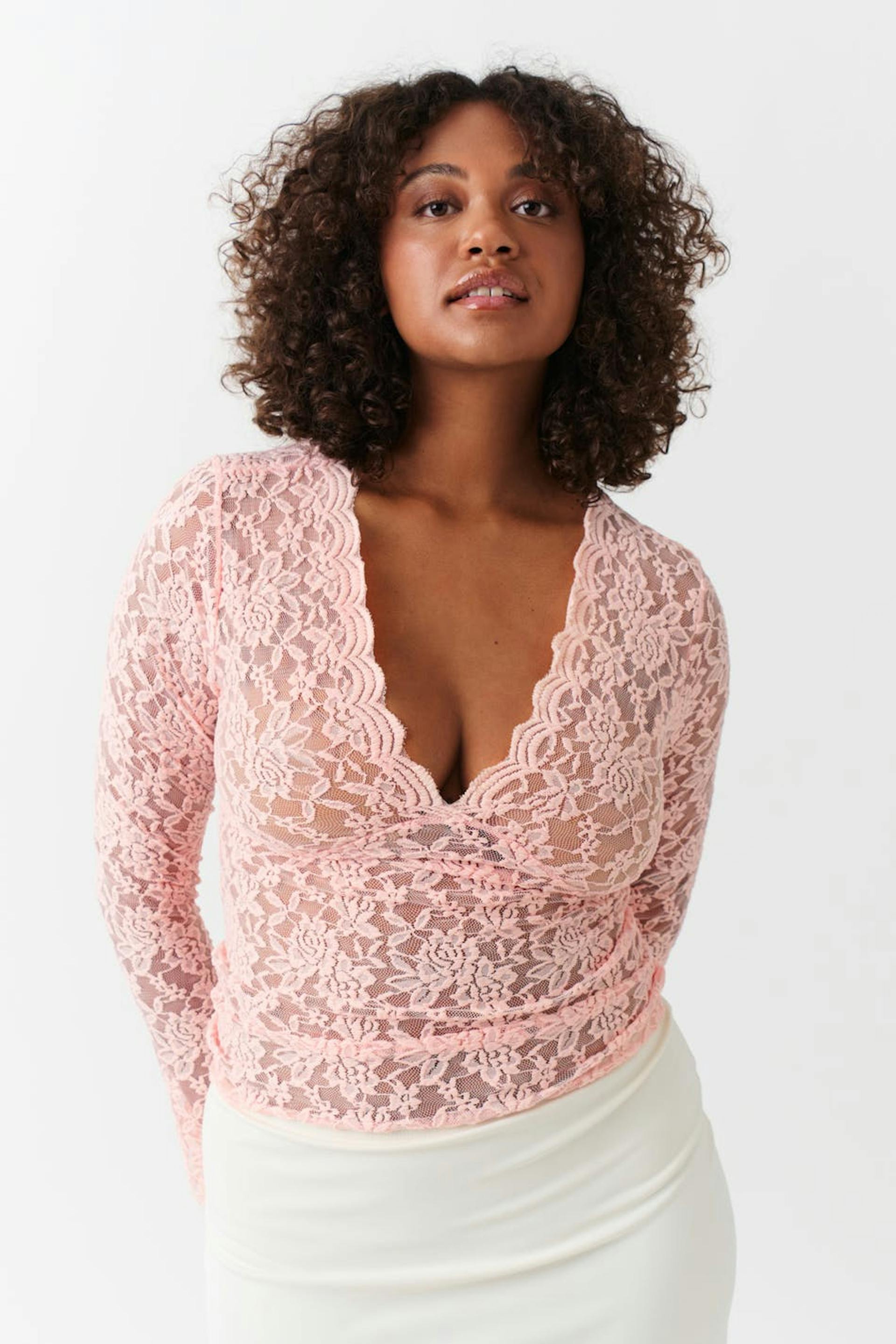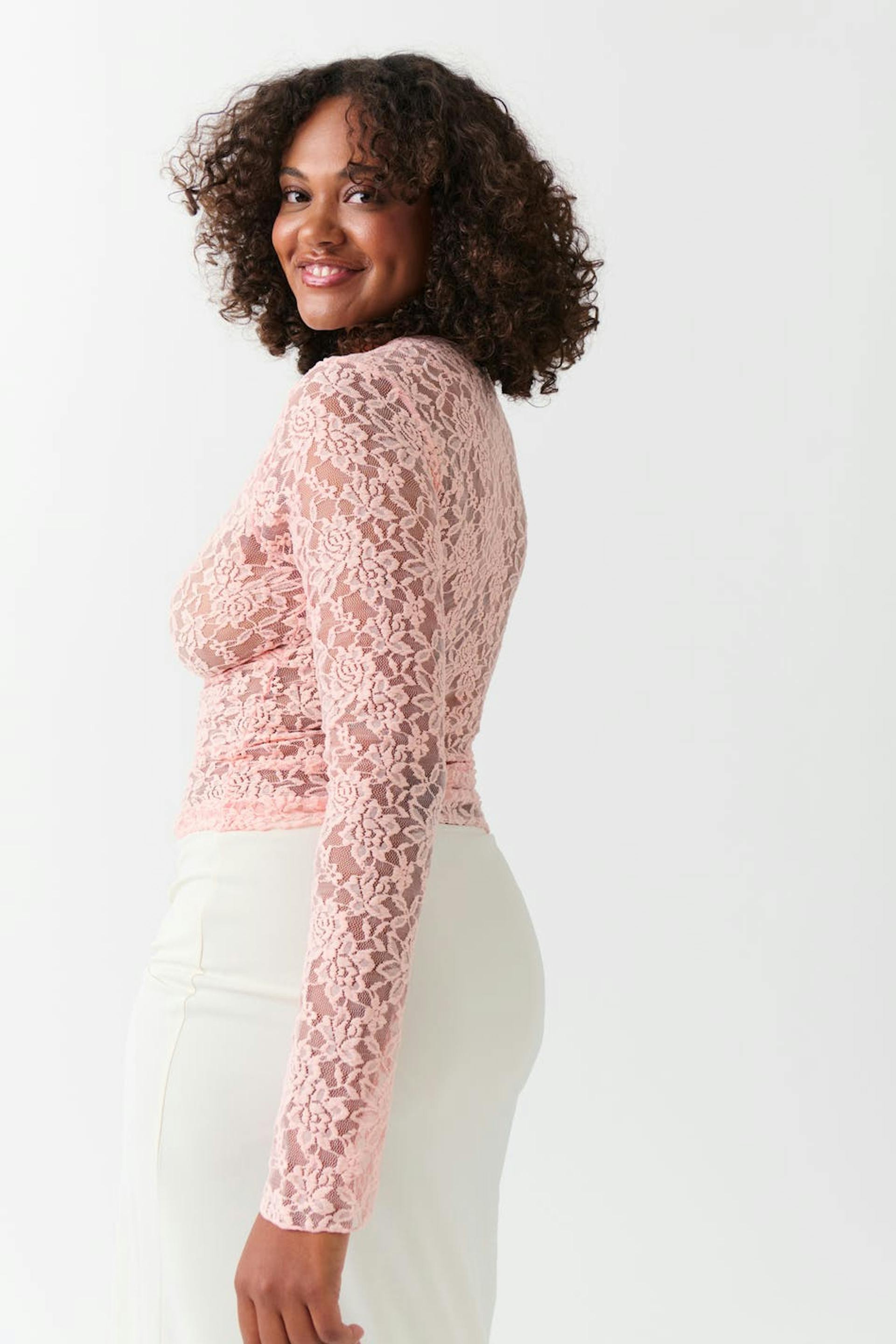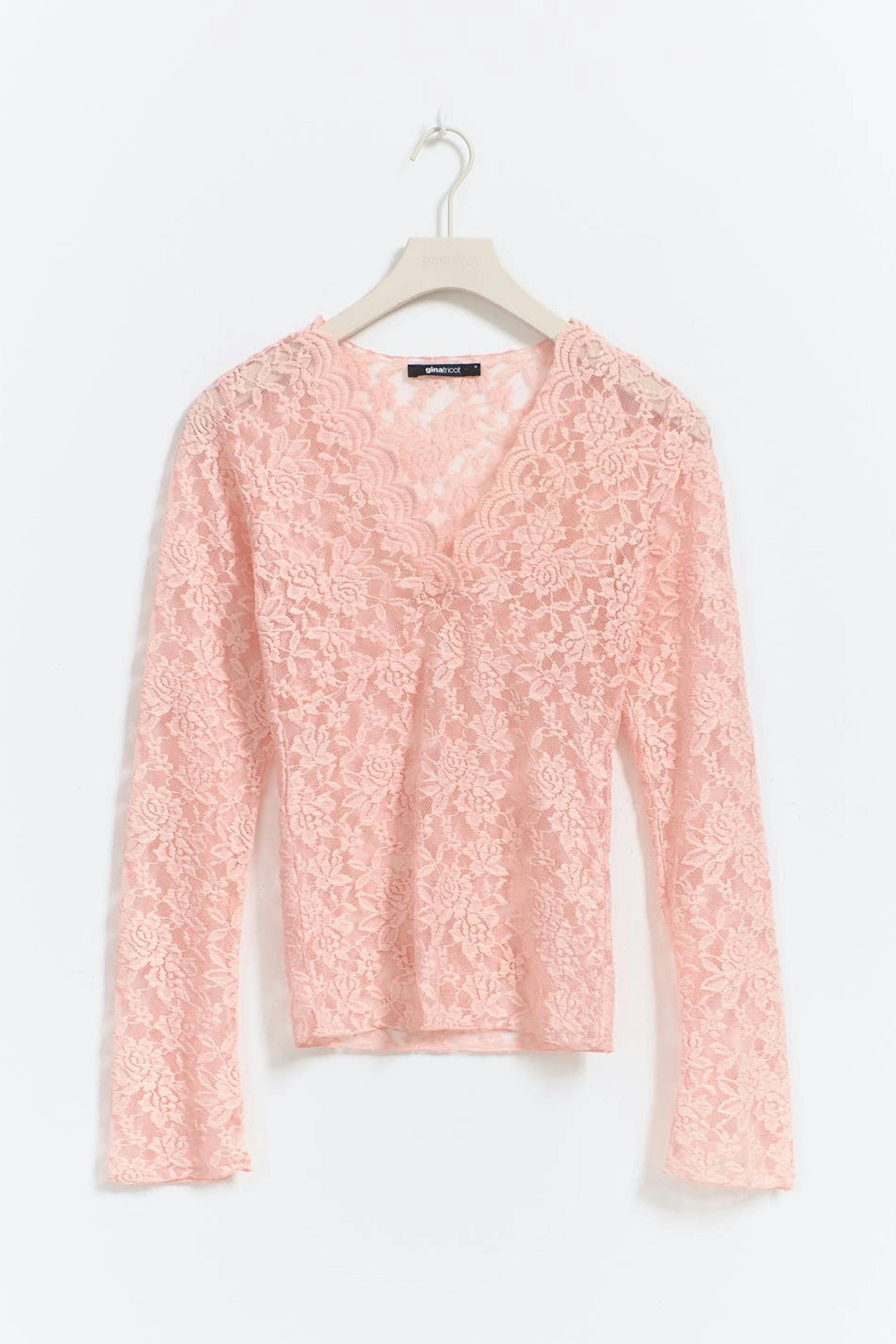 Langermet blondetopp med v-ringning. Toppen er rosa og har figurnær passform.