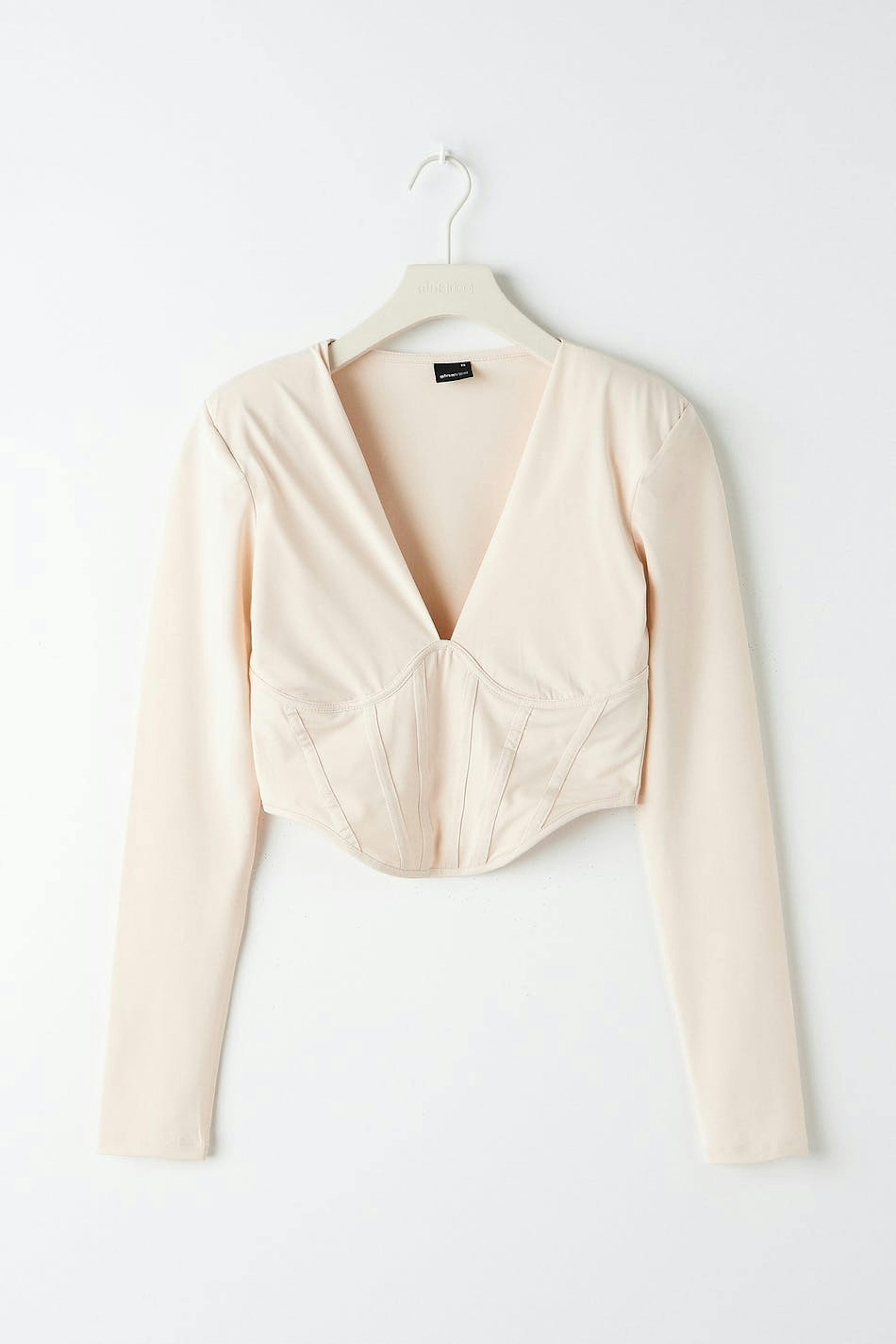 Langermet topp med dyp utringning. Toppen er beige og har en tilpasset passform. Den har skulderputer, avkortet lengde og dekorative sømdetaljer foran og nedenfor bysten.