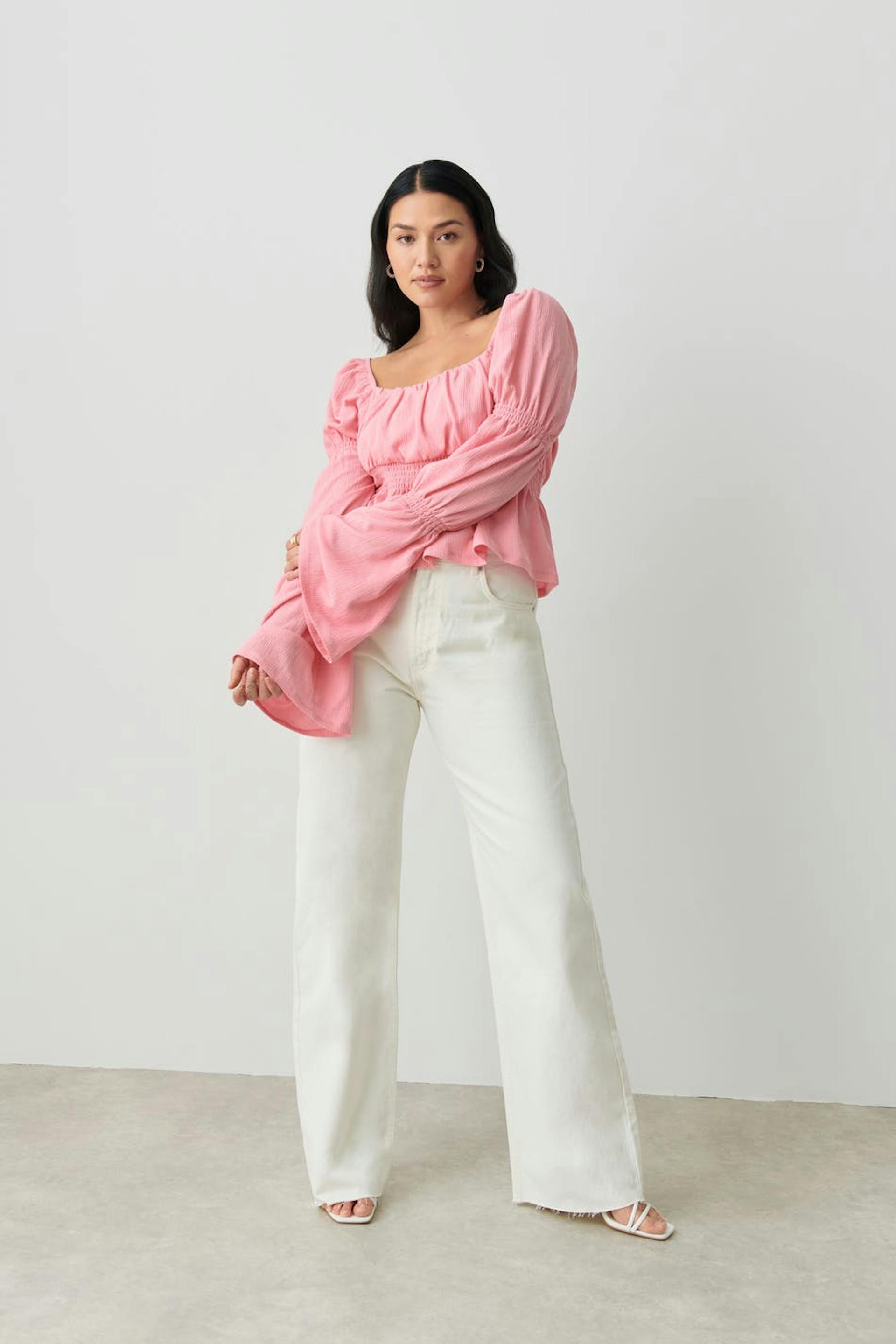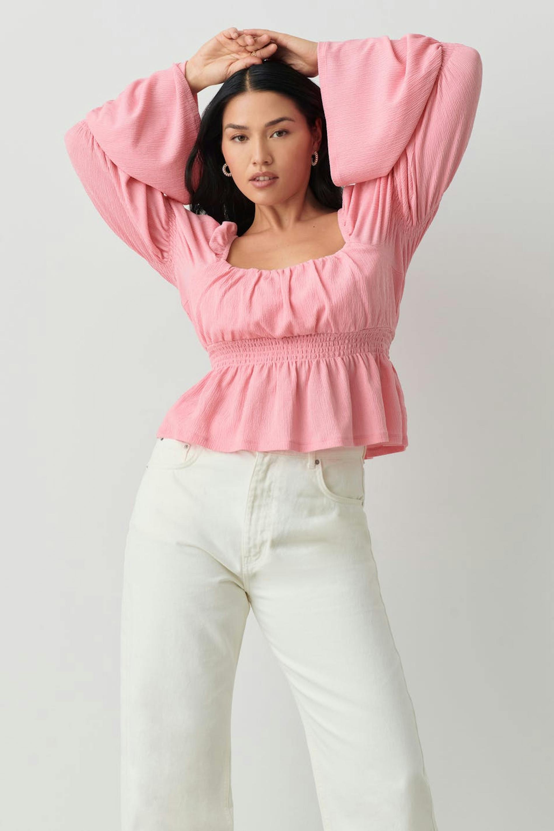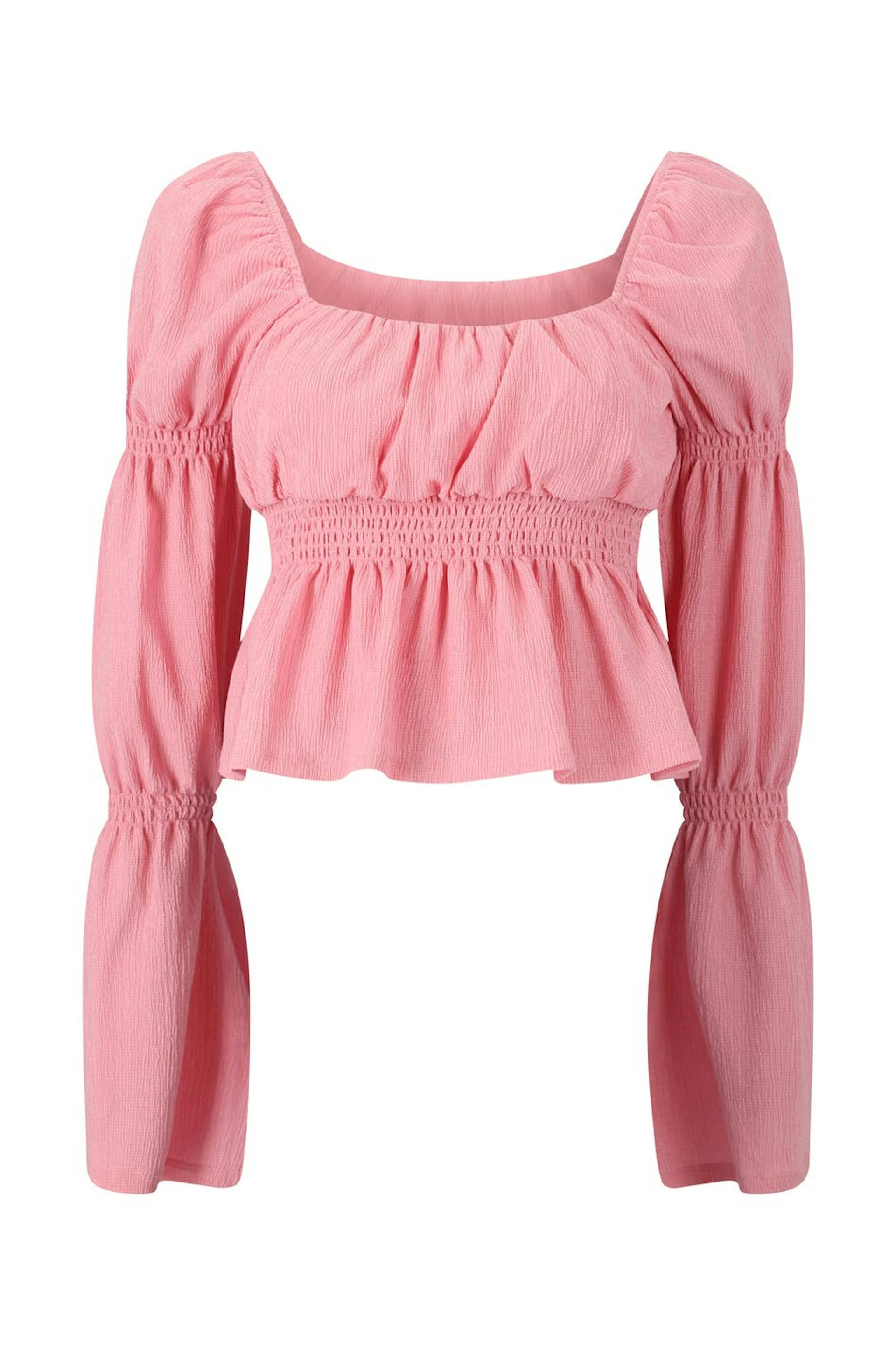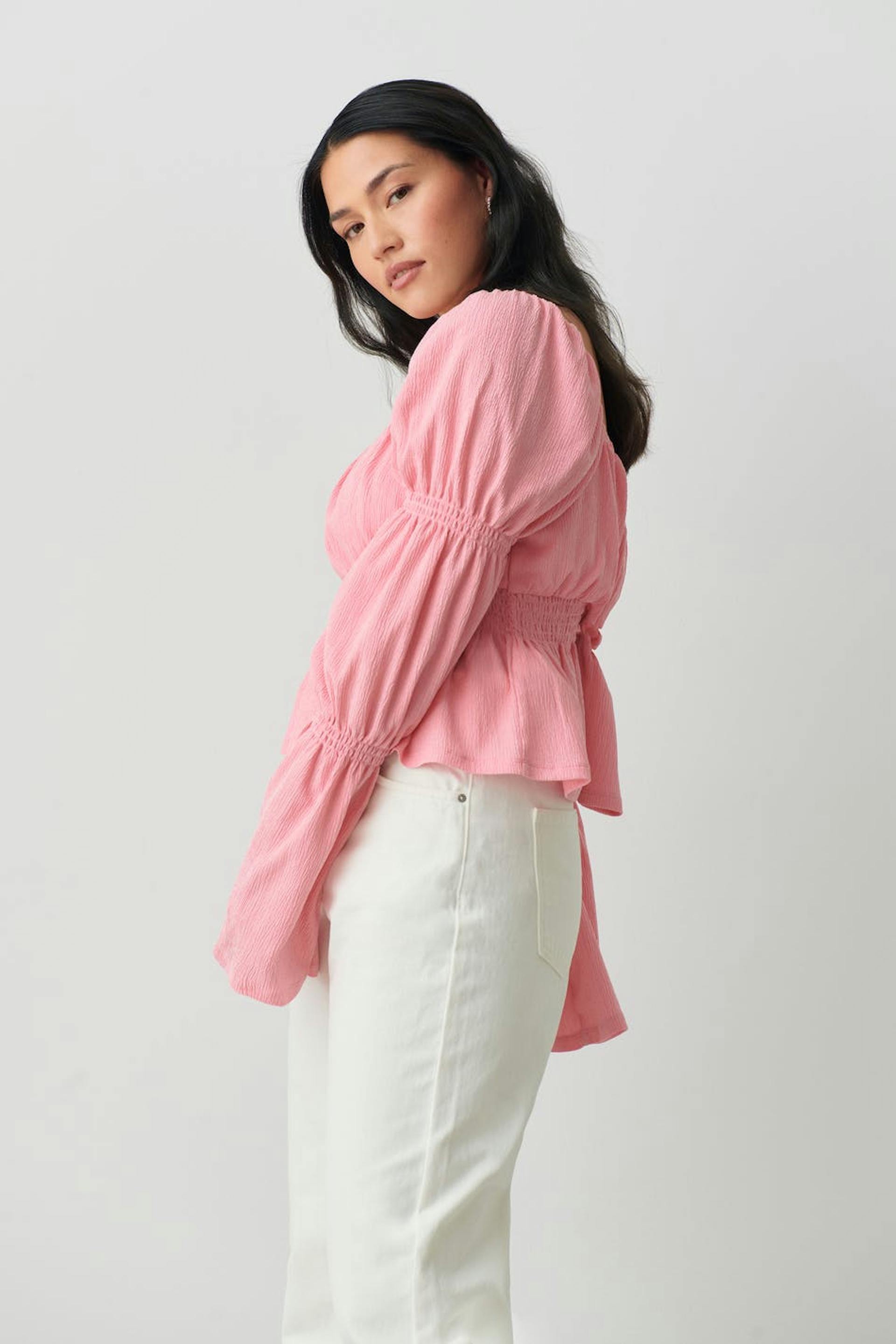 Langermet topp i jersey med voluminøse puffermer. Toppen er rosa og har firkantet hals. Den har rysjet bryst, gummistrikk ved midjen og volanger i nedre kant.