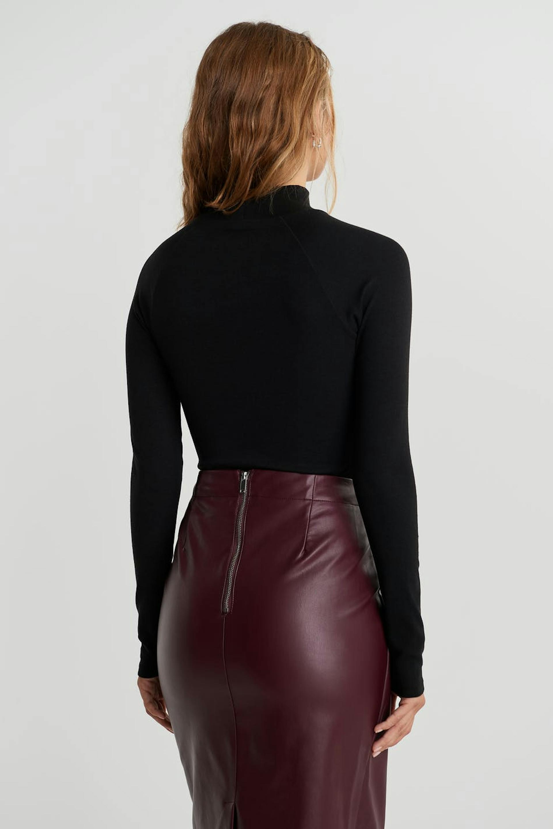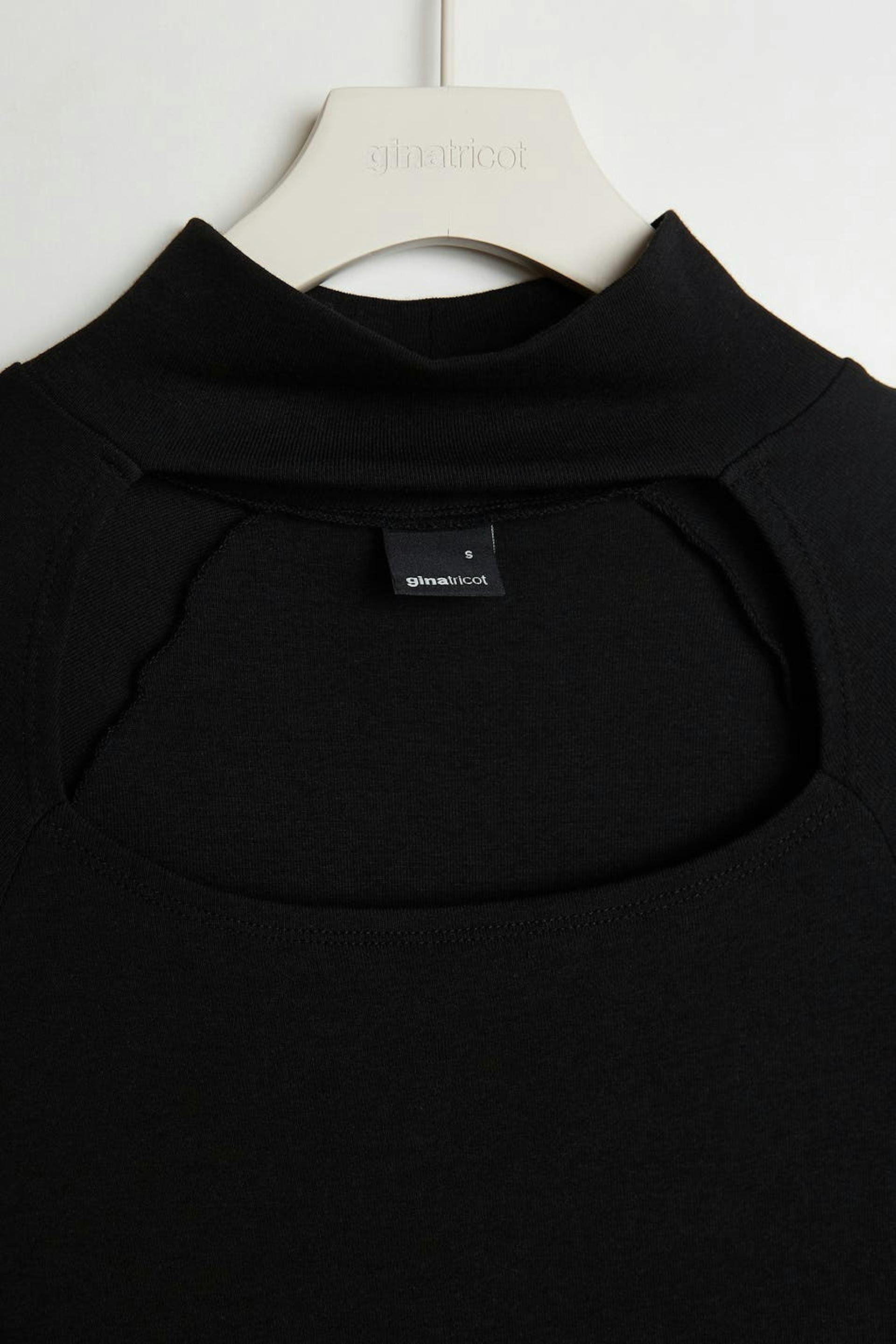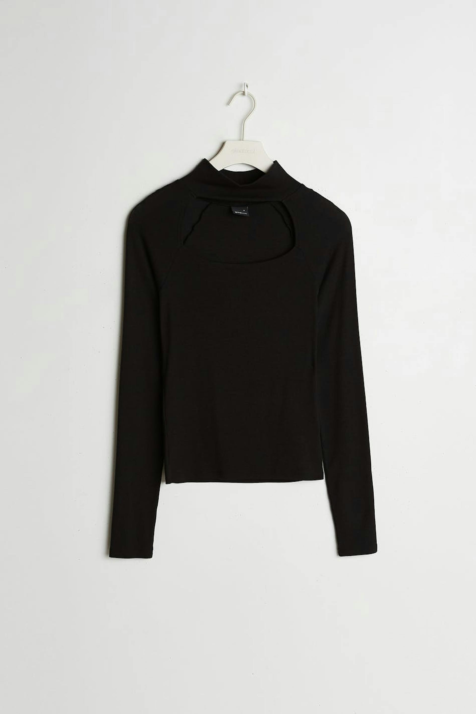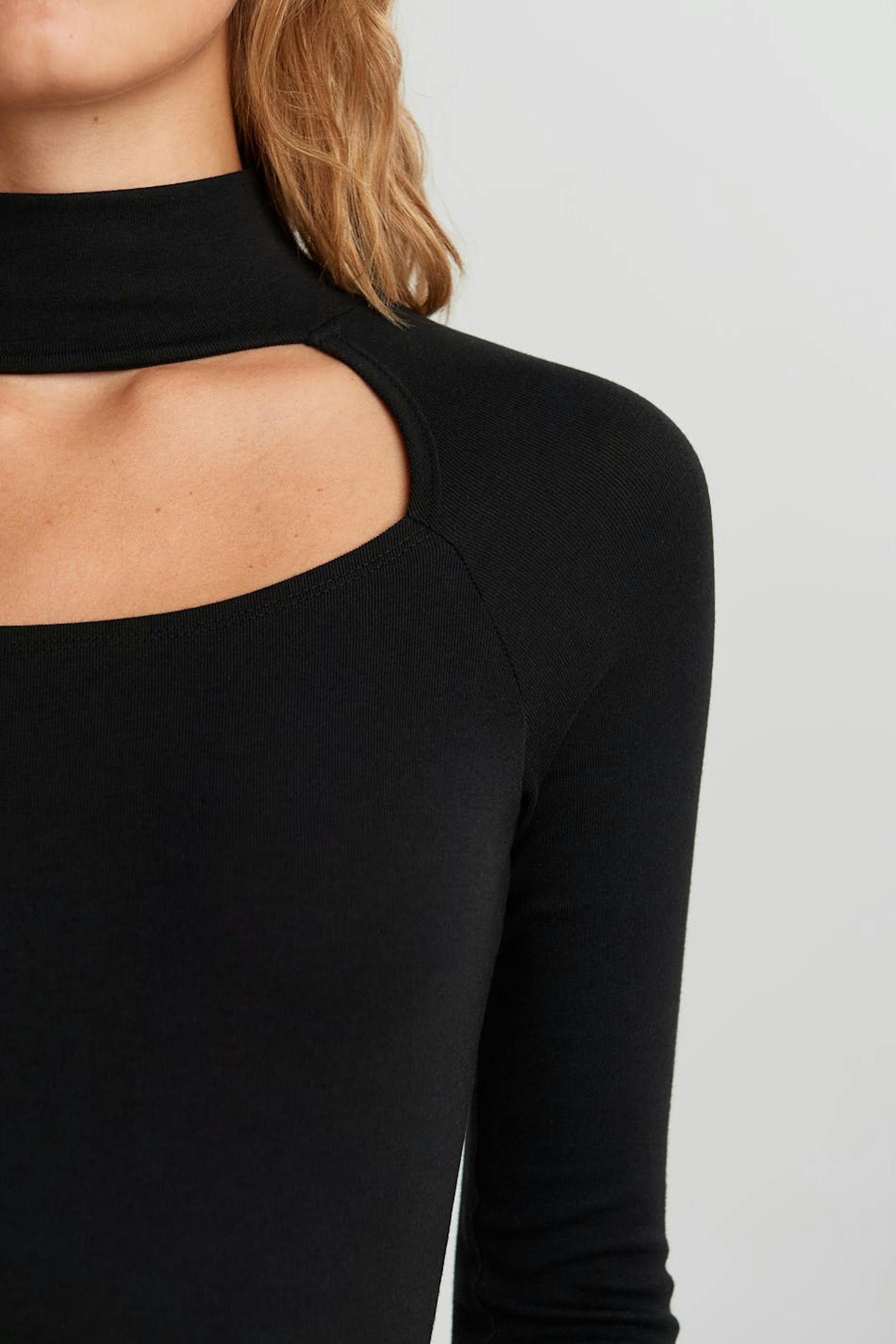 Langermet topp med en tilpasset passform. Toppen er svart og har en polokrage. Den er laget av jersey og har en detalj på brystet med et utsnittet.