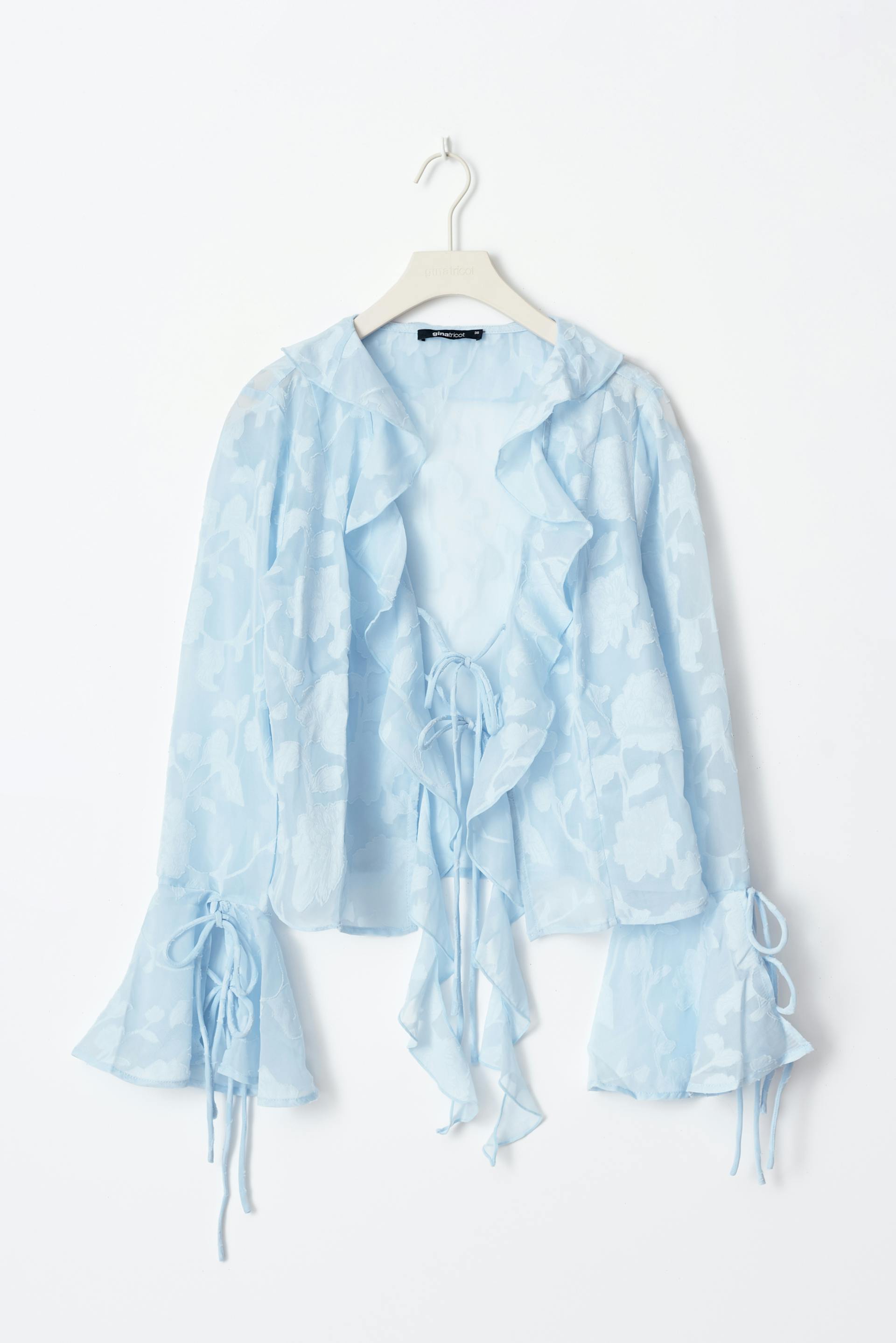 FIT: Regular fit. V-neck width wide cuffs. QUALITY: See through fabric with flowers. Quality: Sheer woven, chiffon Details: wrap at front, frill/flounce at sleeve ends, neckline and hem Quality: 50% recycled polyester Supplier:Nantong D&J Fashion Co, Limited Production unit: Donghai Yiting fashion Co. Ltd