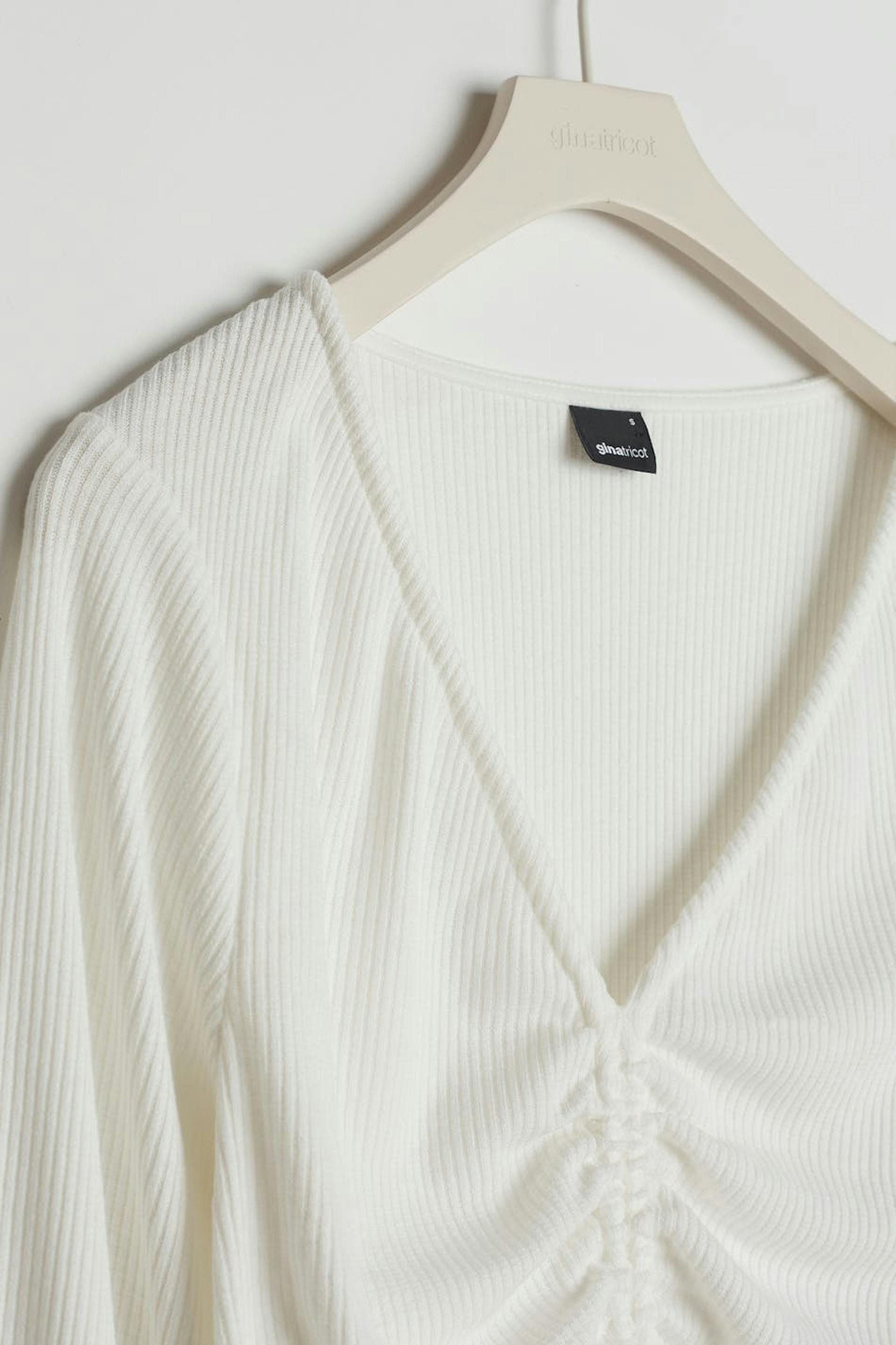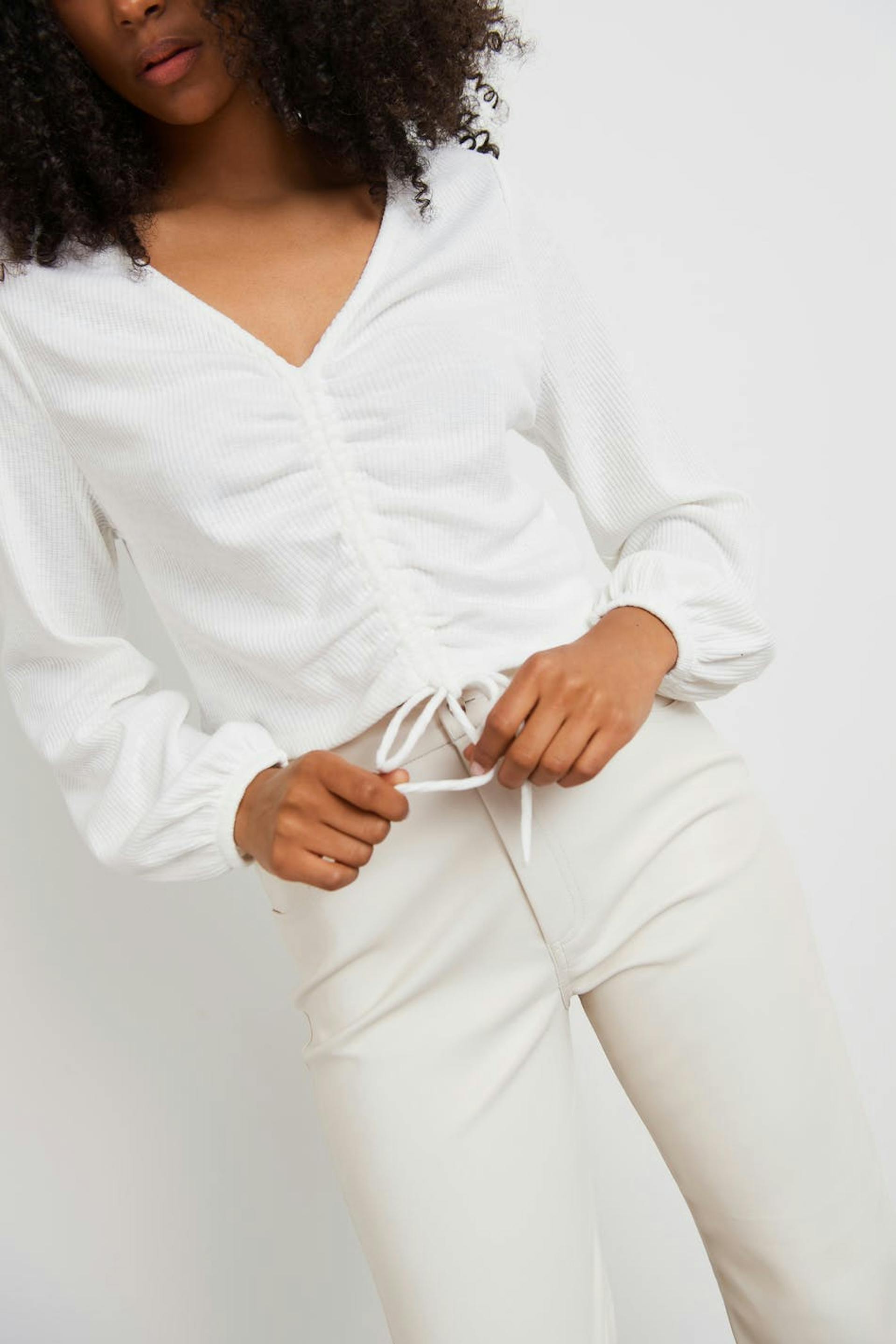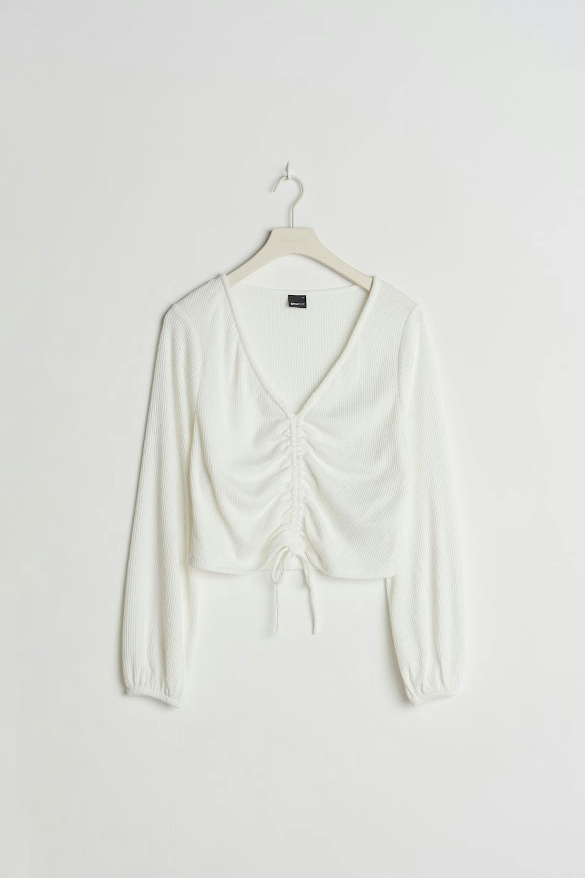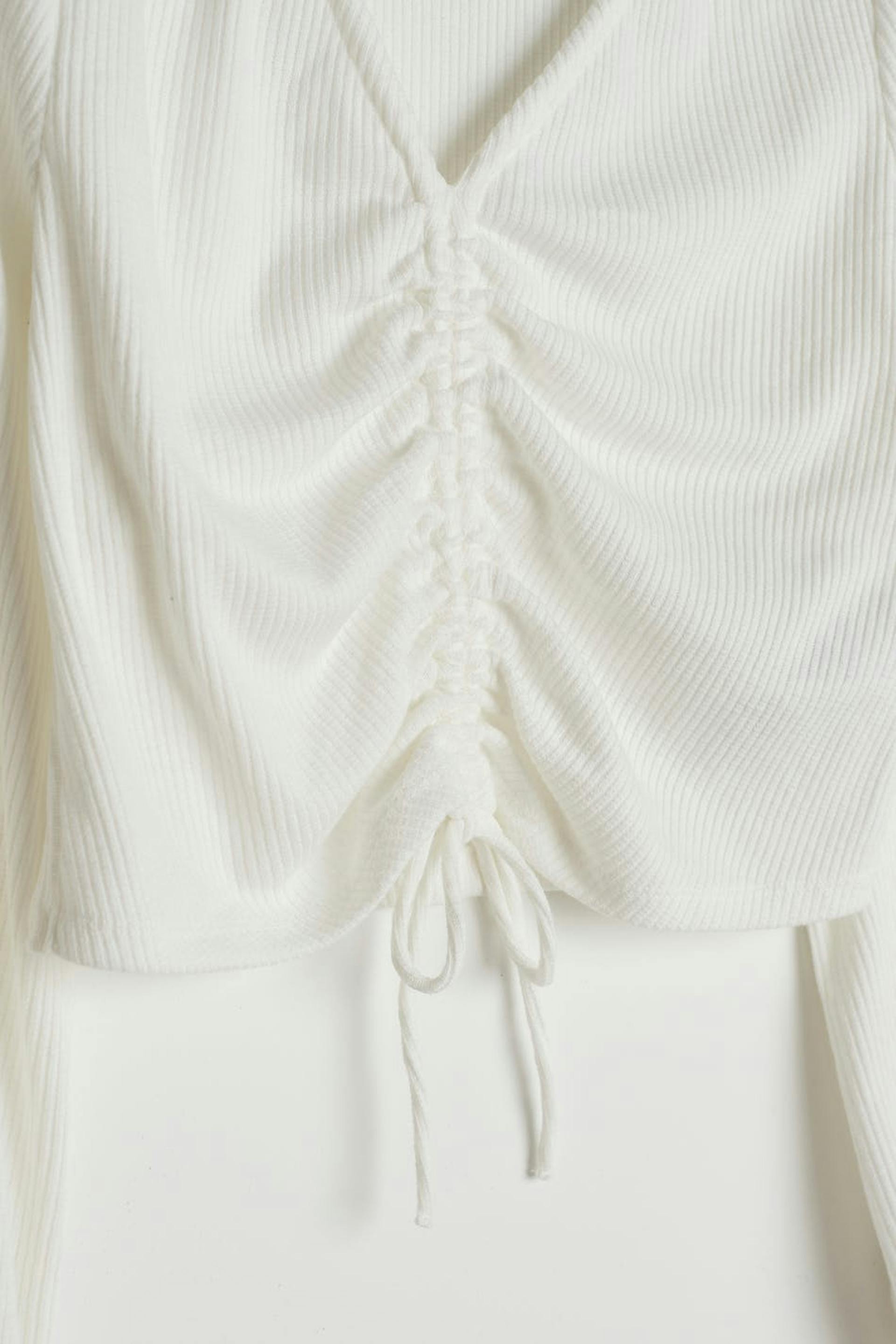 Ribbet topp med en oversized passform. Toppen er hvit, langermet og avkortet. Den har en dyp utringning, samlede detaljer foran og en justerbar snøring med en knyting på nedre linning.