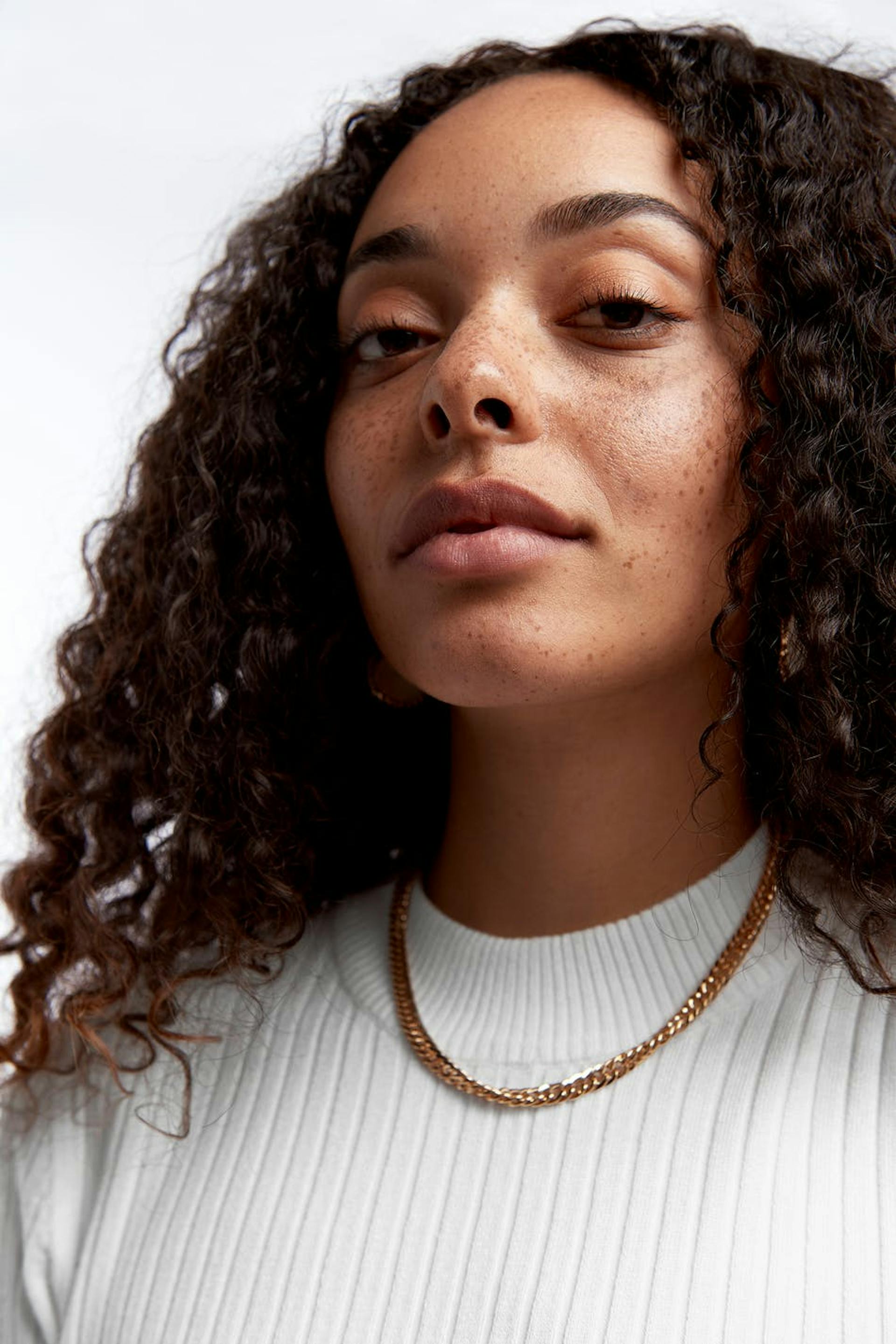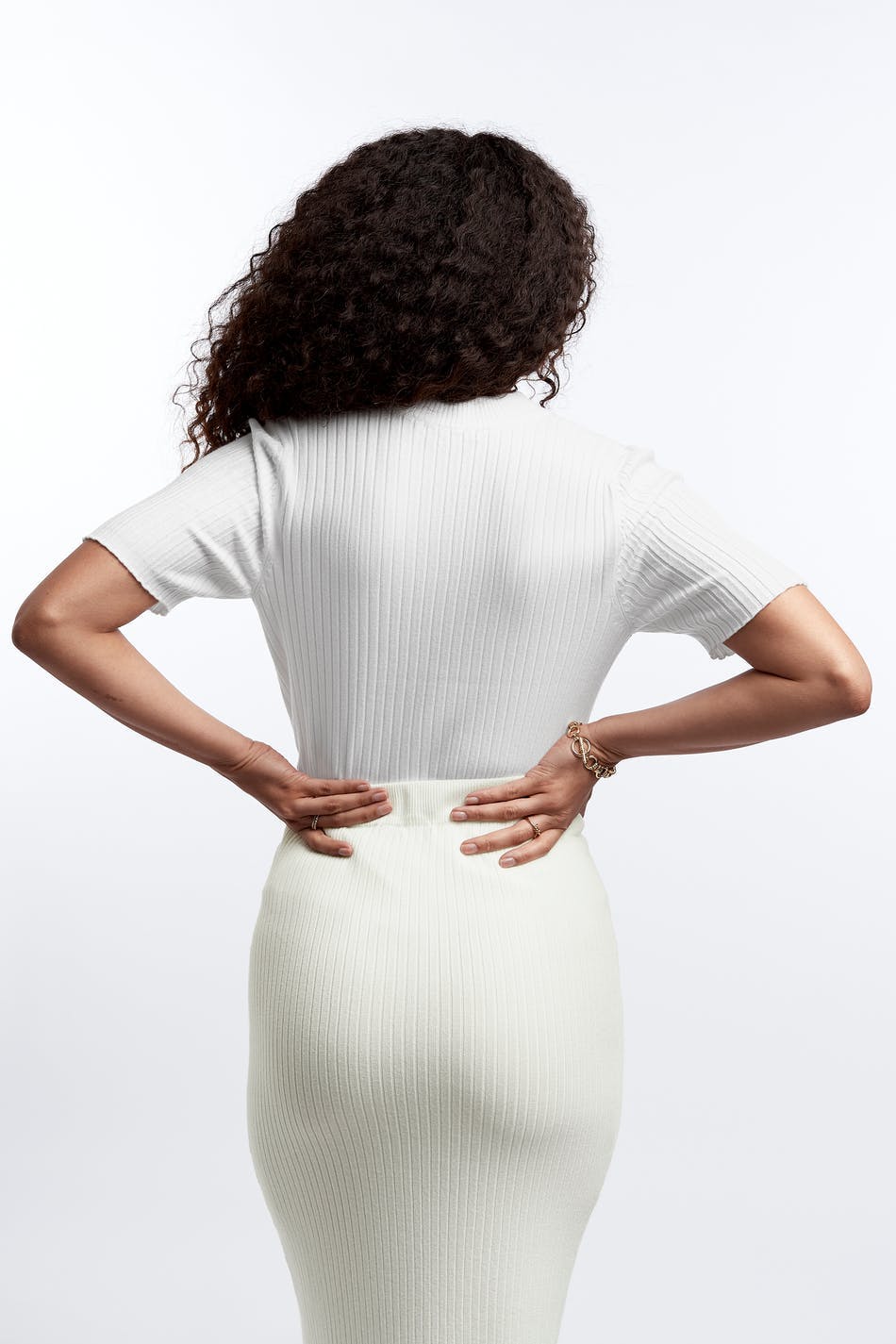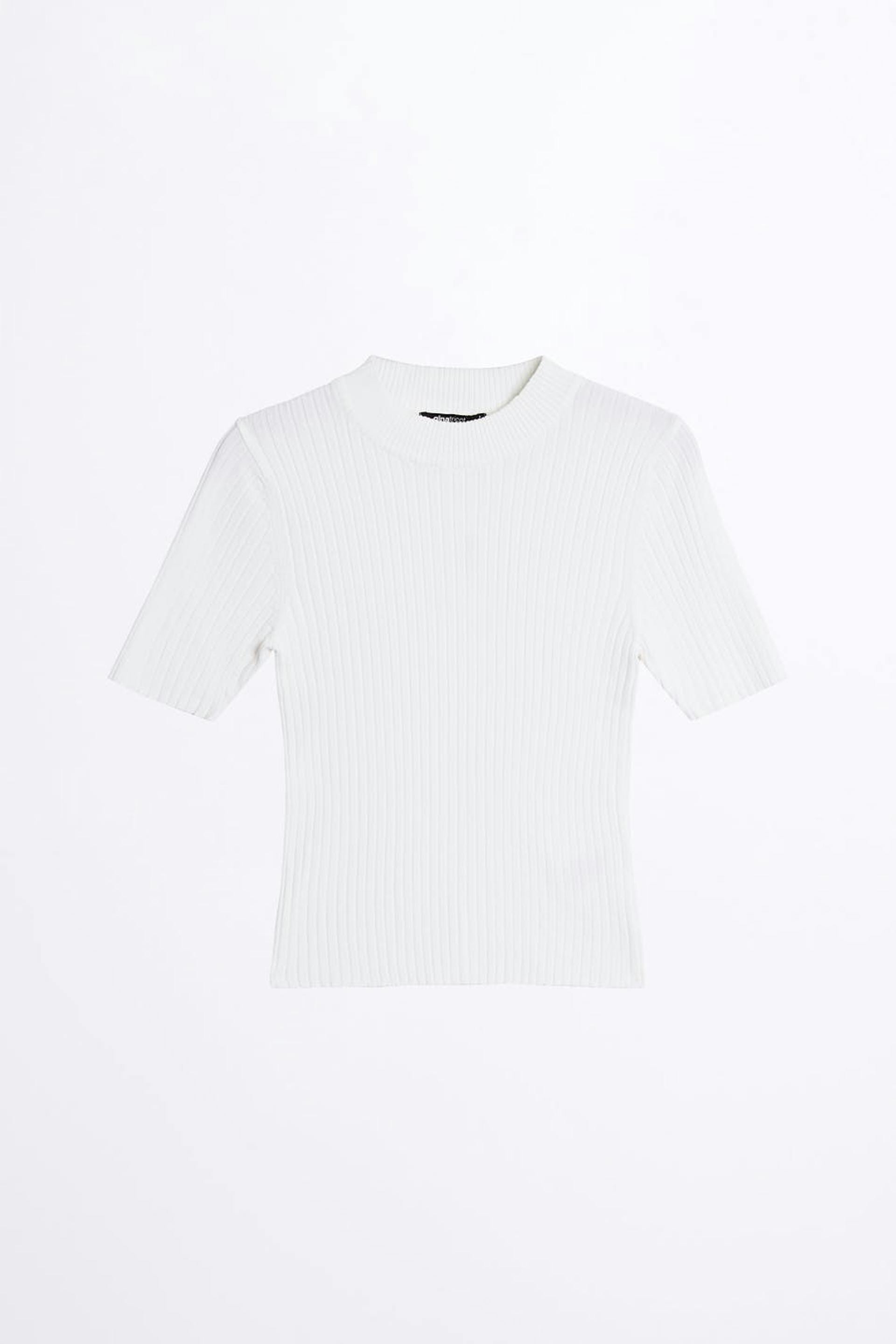 Finstrikket topp med en ribbet mansjett på halslinjen. Toppen er hvit, ribbet og kortermet.
