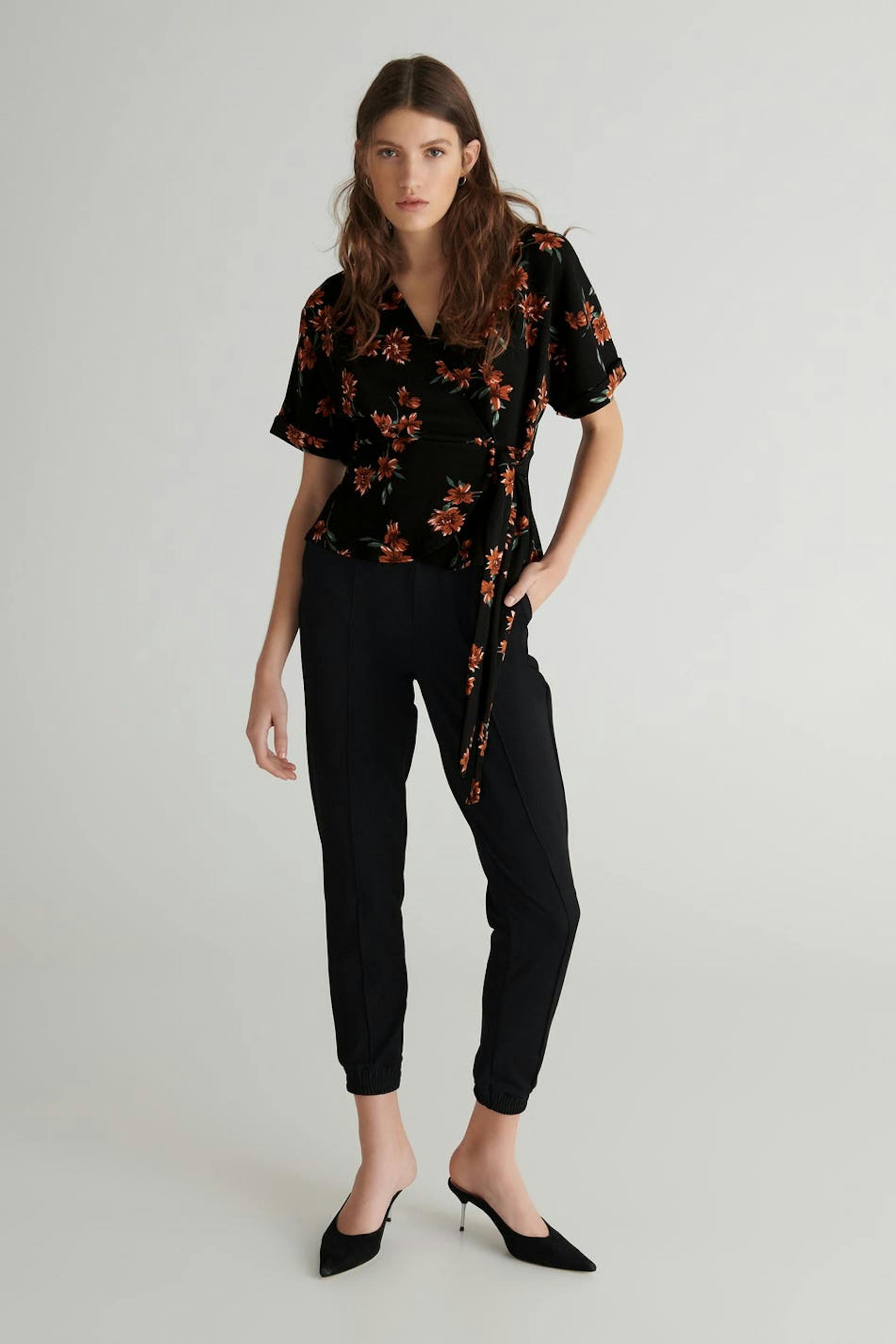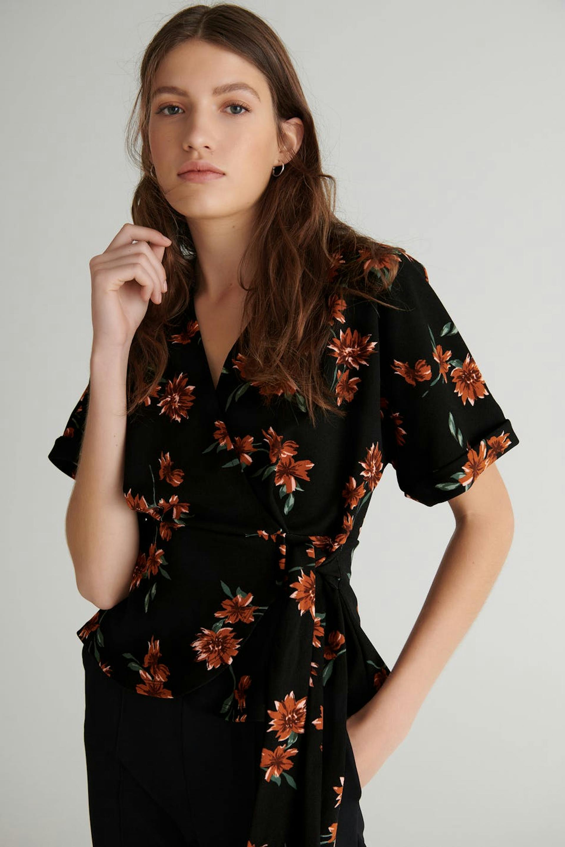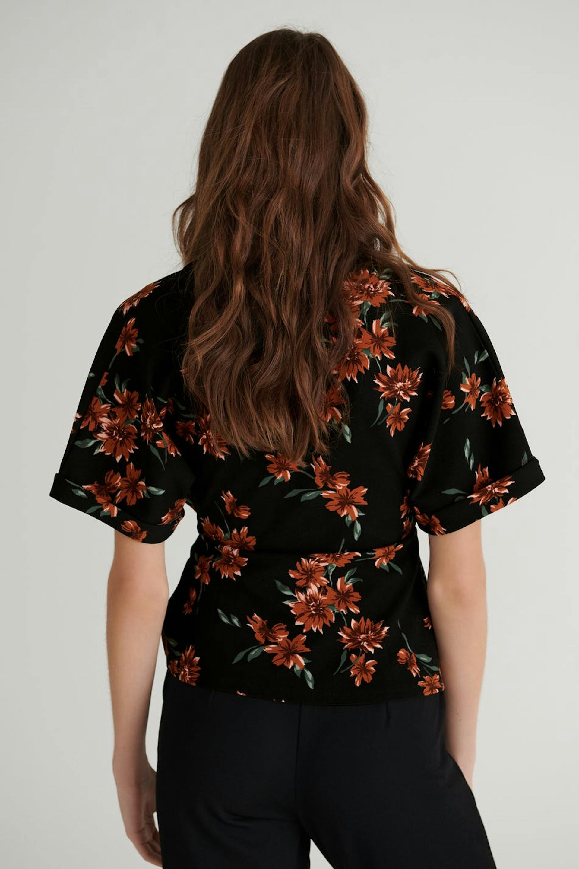 Blomstret omslagstopp med en vanlig passform. Toppen er svart og har ermer i kimonostil. Den har en knyting ved midjen.