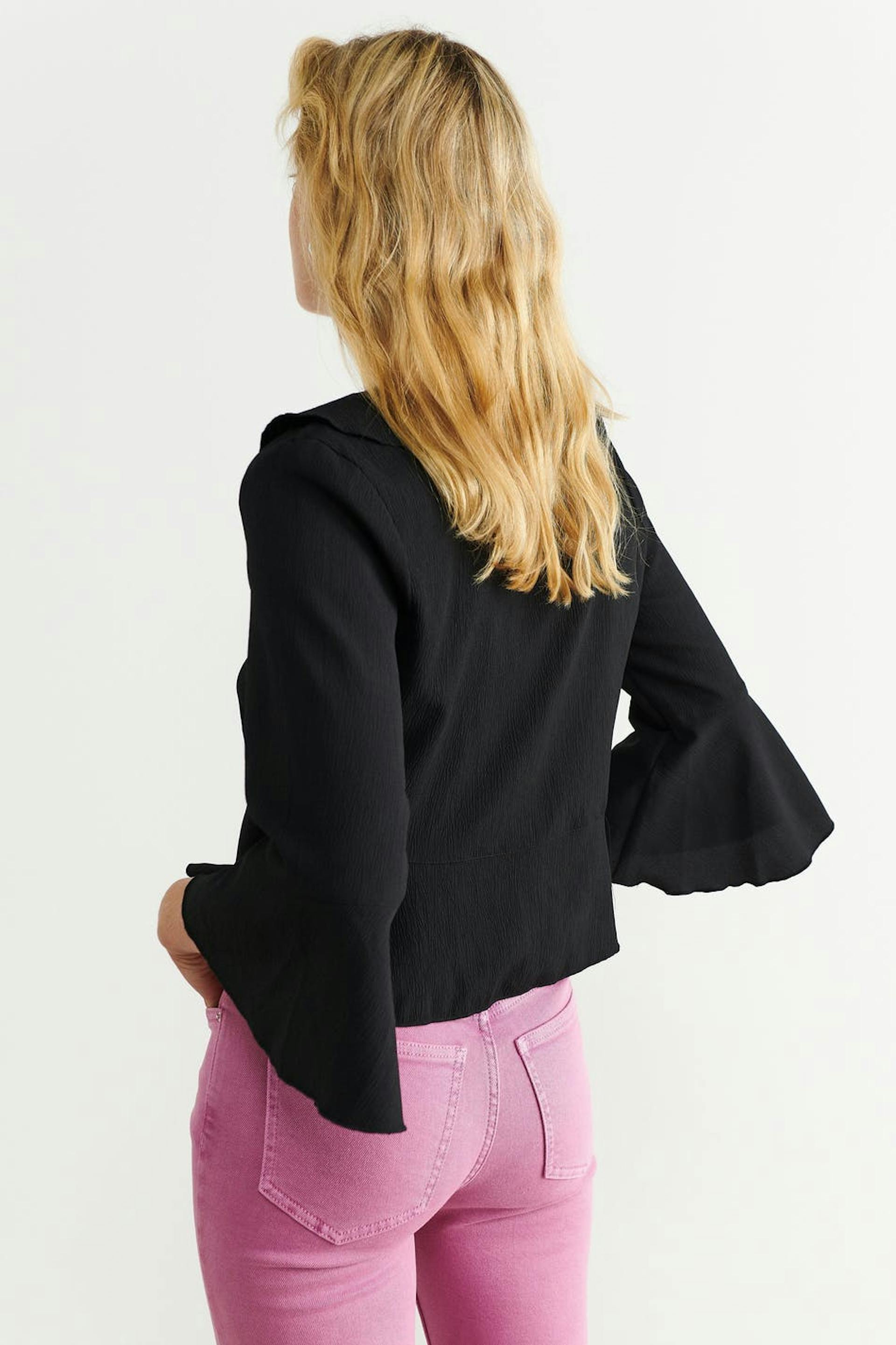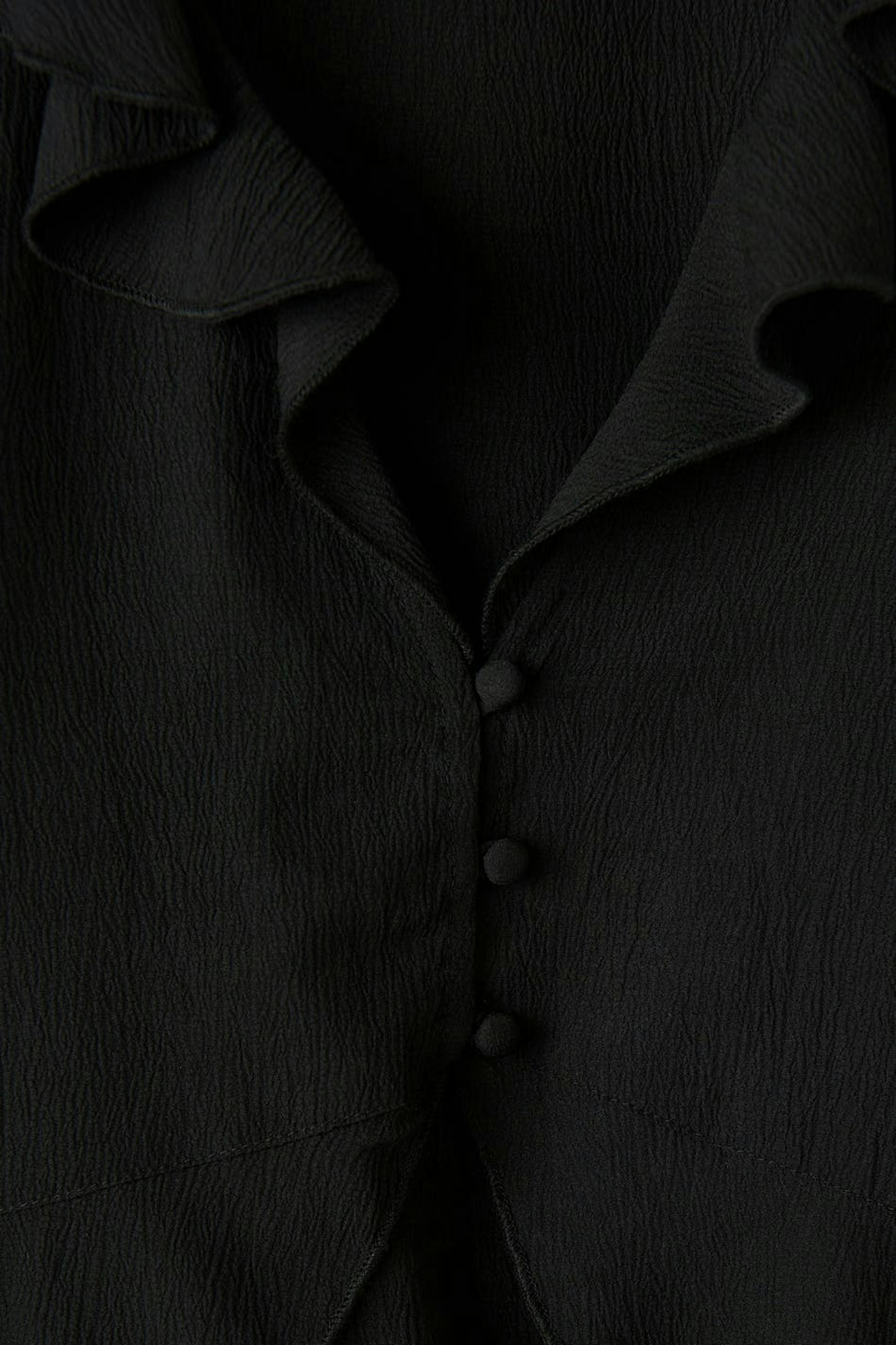 Langermet topp med dyp utringning. Toppen er svart og har en tilpasset passform. Den har trekvartermer, knappelukking foran og volanger foran, ved ermeslutten og i nedre kant.
