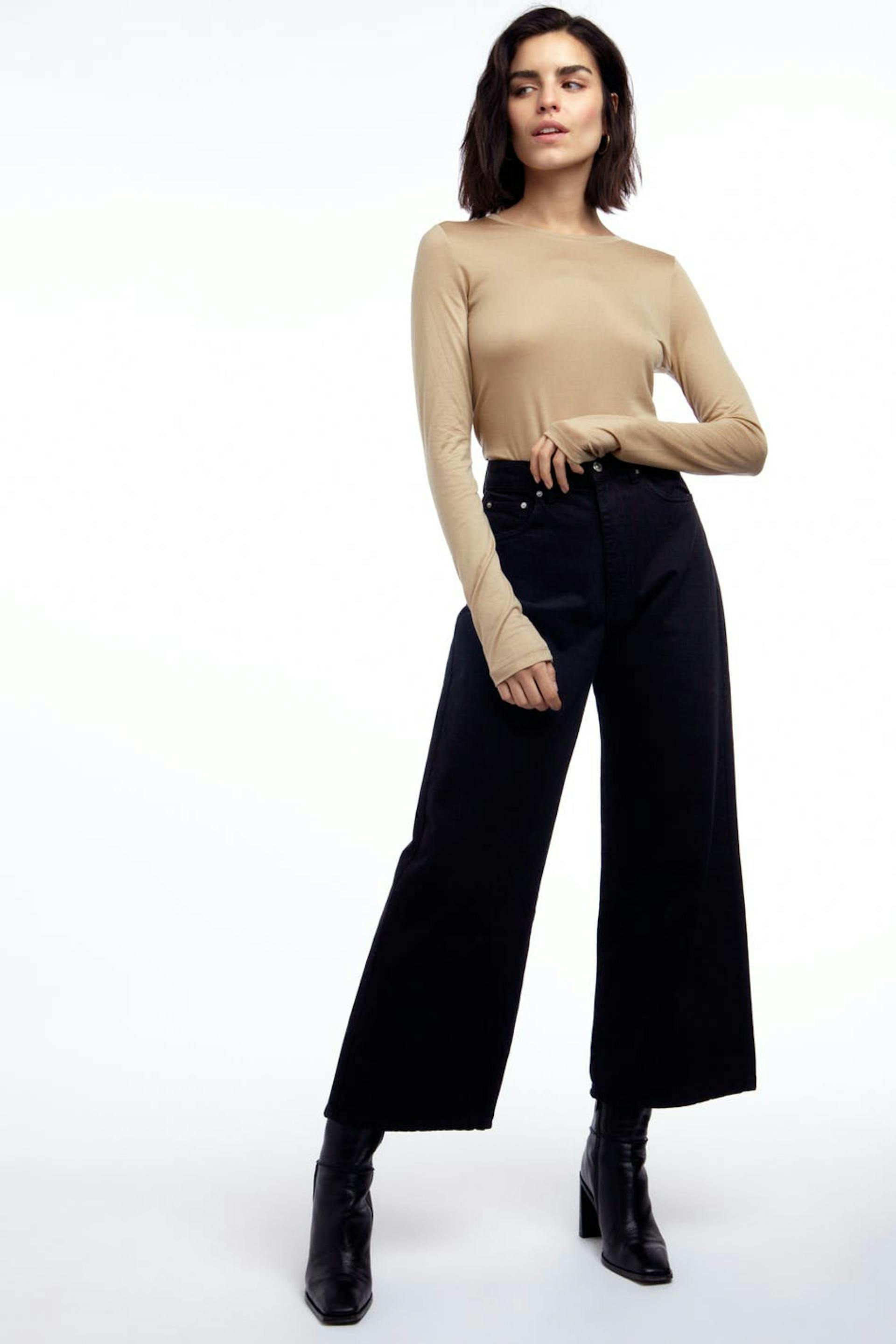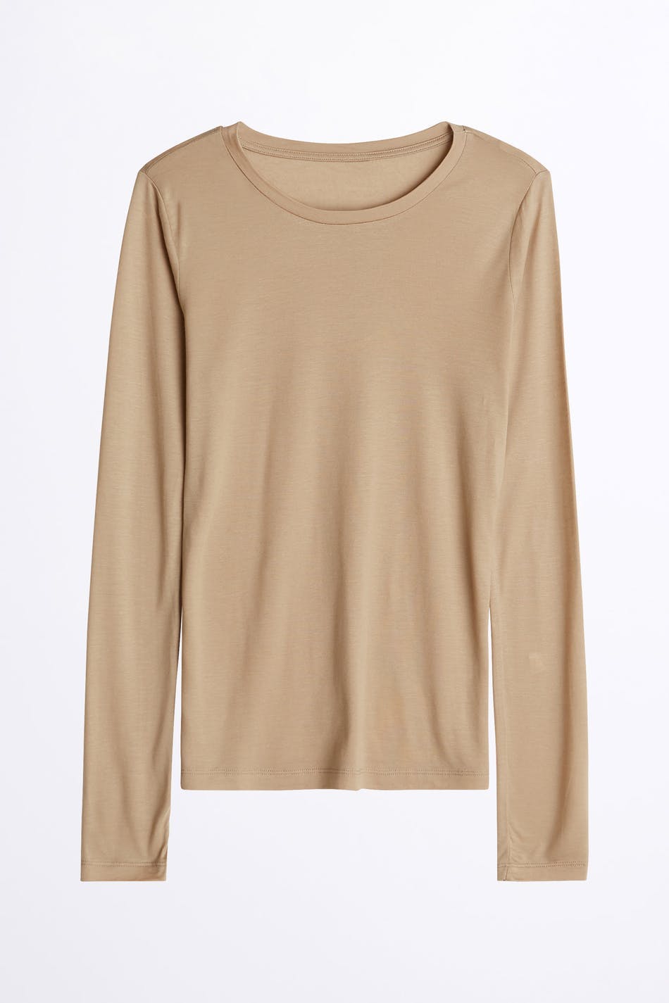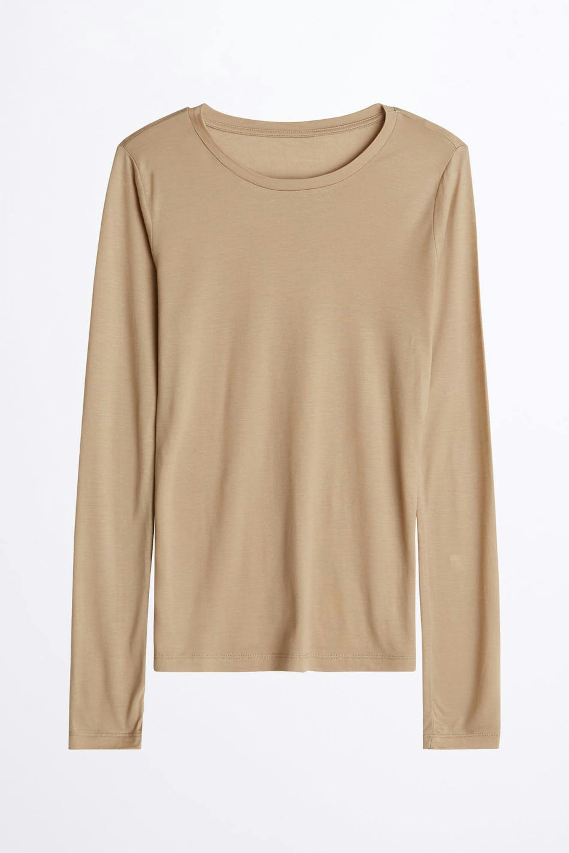 Myk topp med en vanlig passform. Toppen er beige, rett og langermet. Den er laget av jersey.
