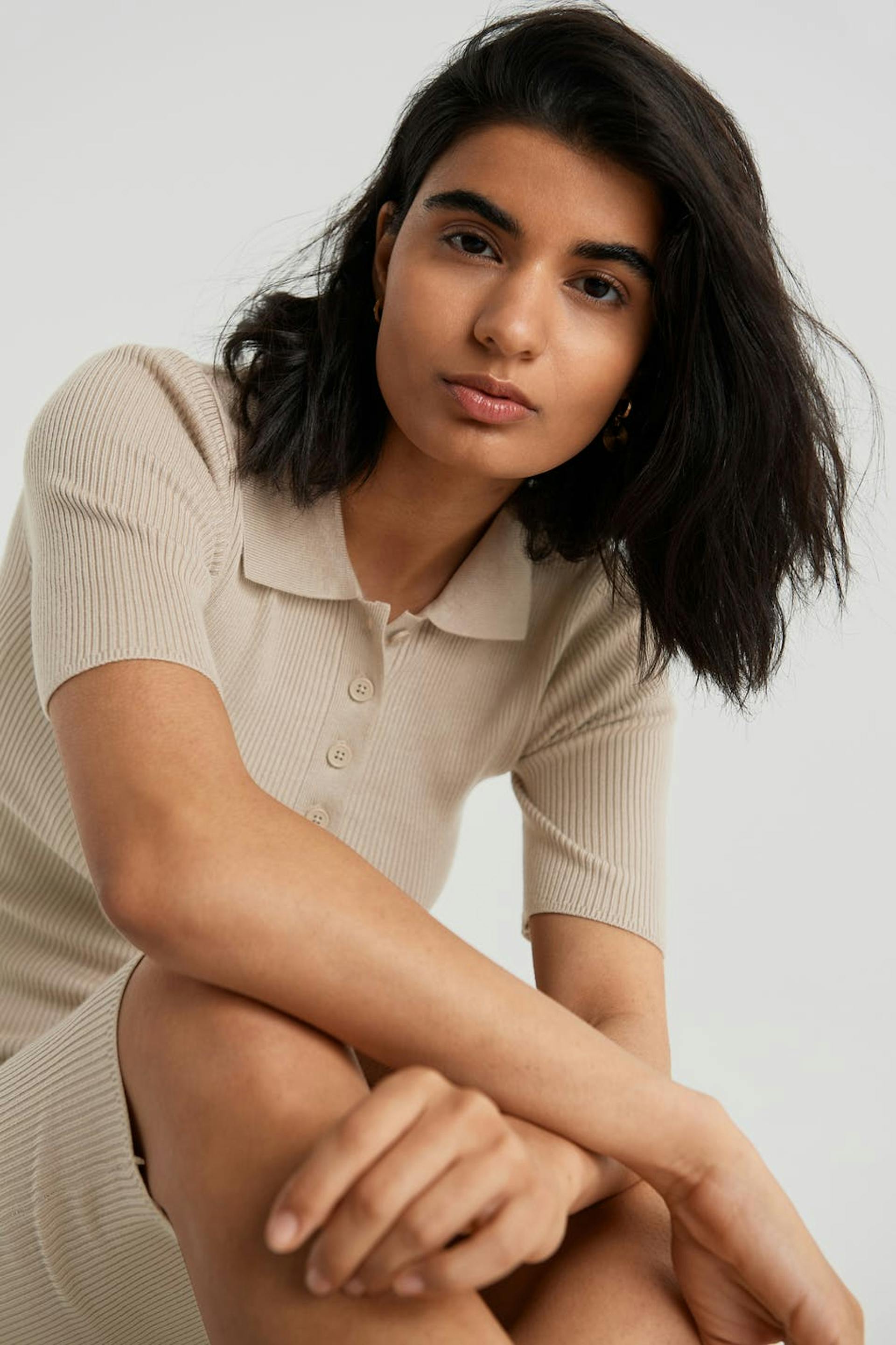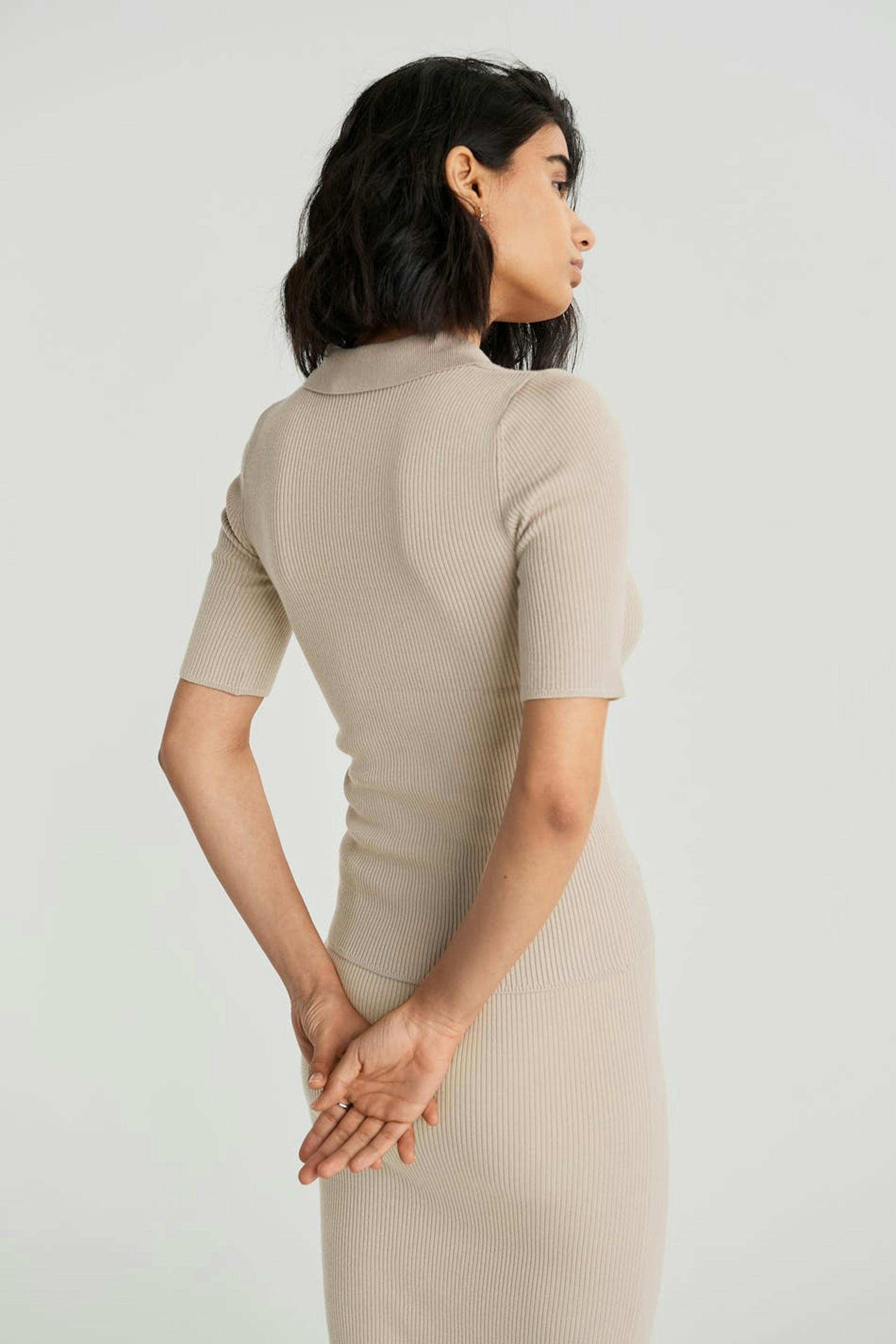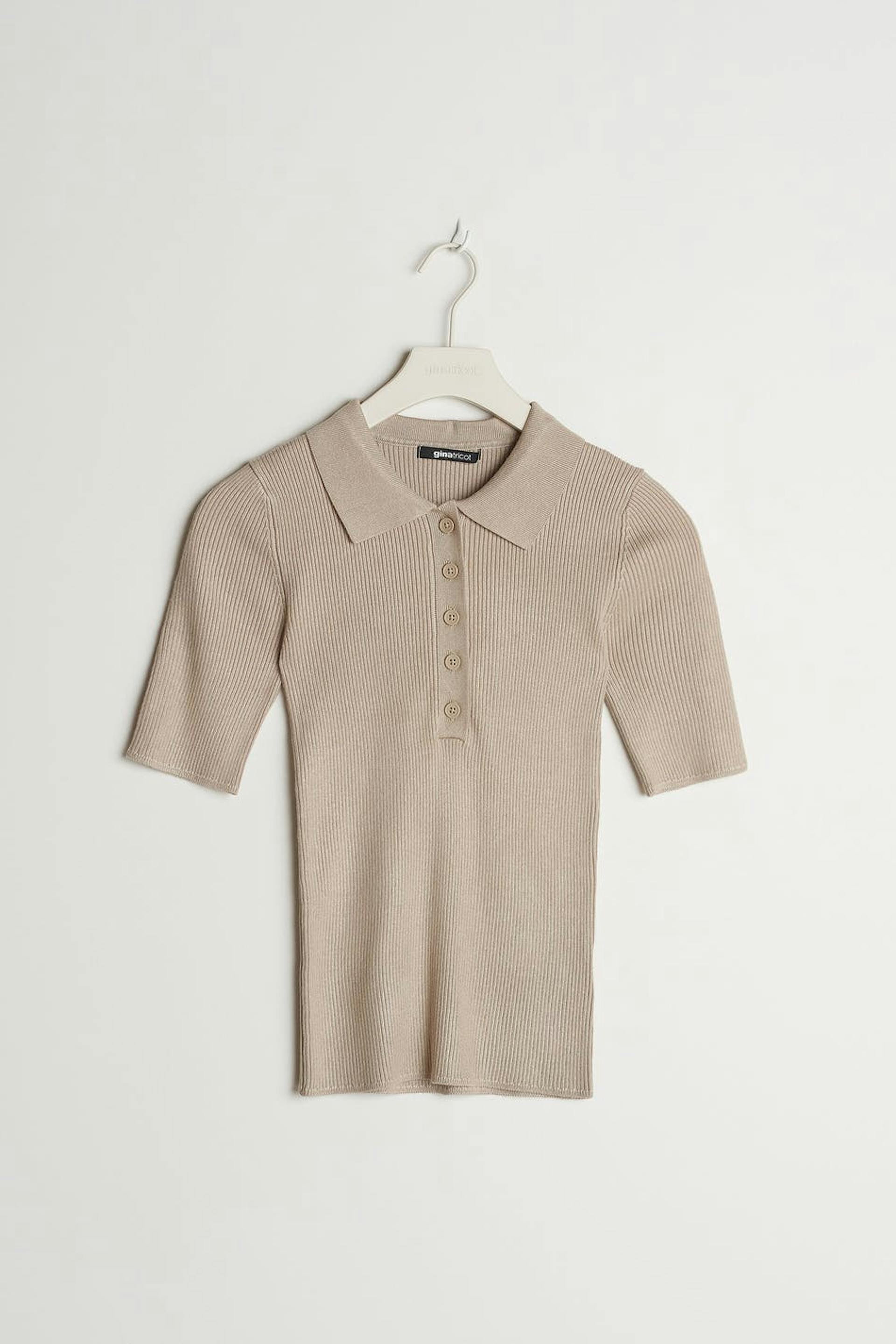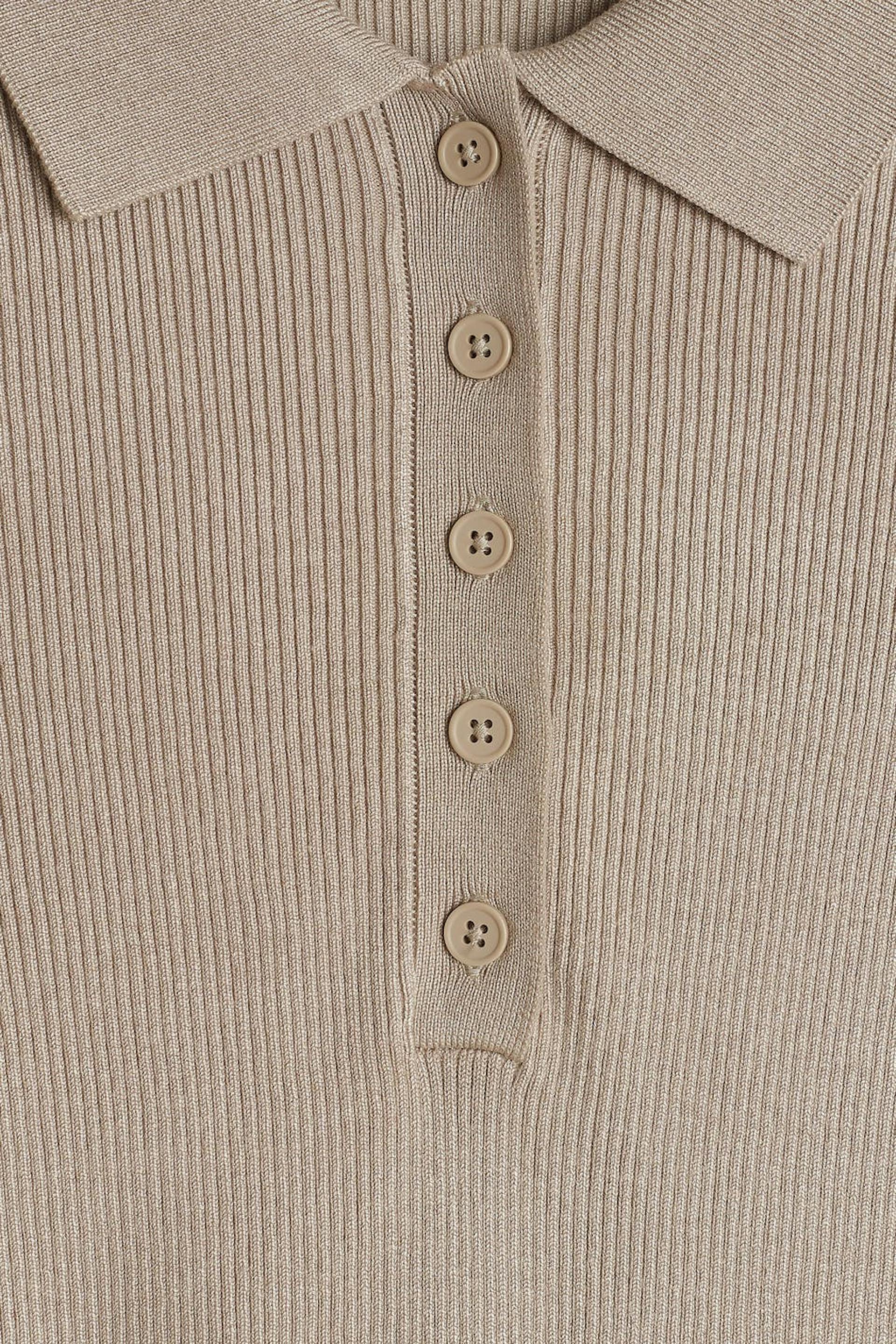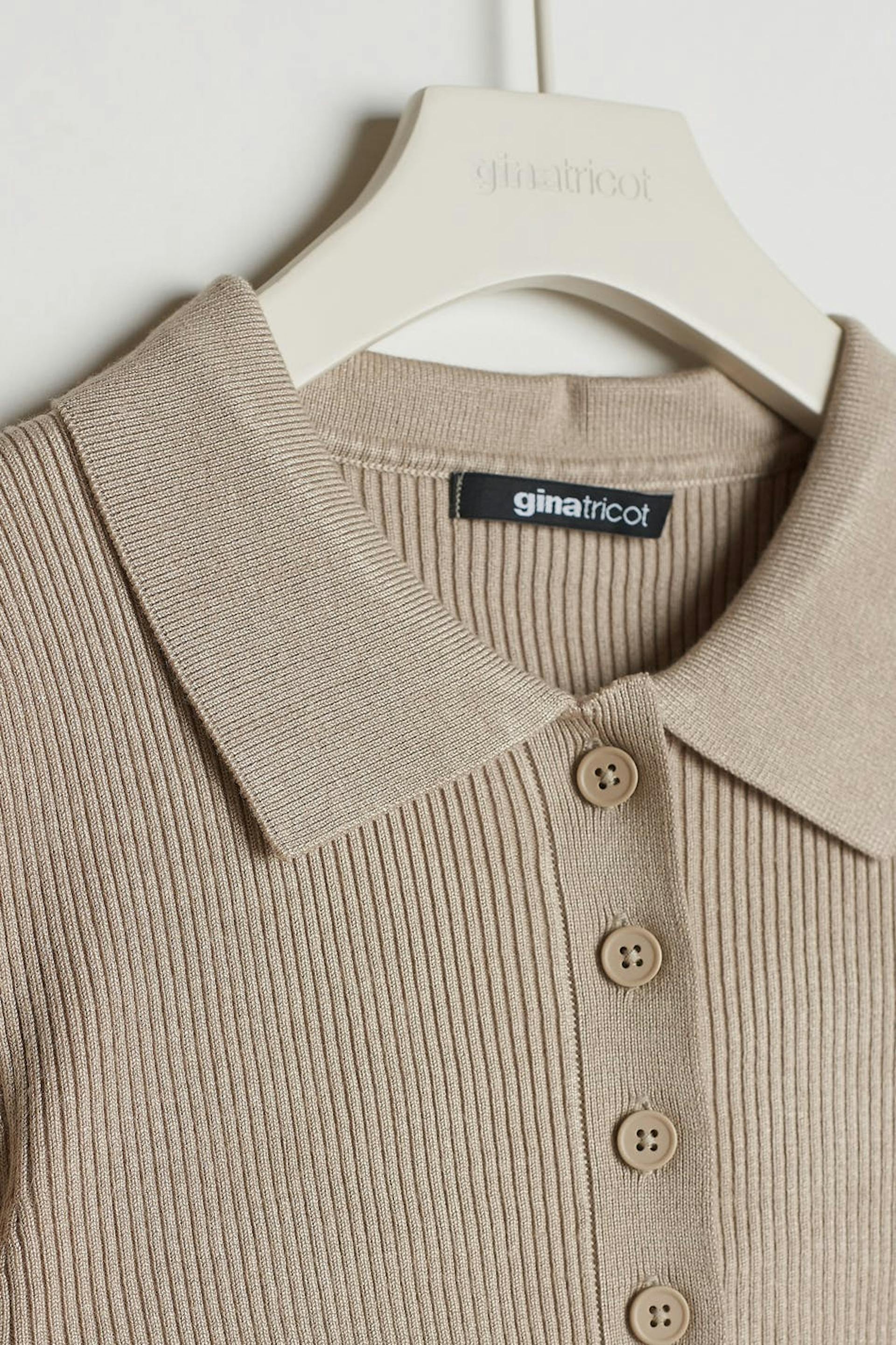 Kortermet topp med en krage. Toppen er beige og ribbestrikket og har en hals med knapper.