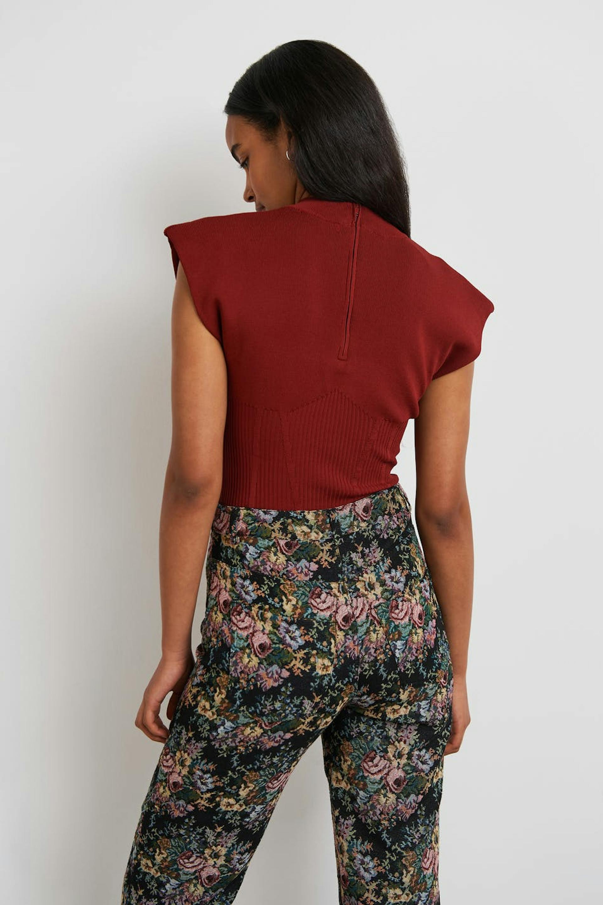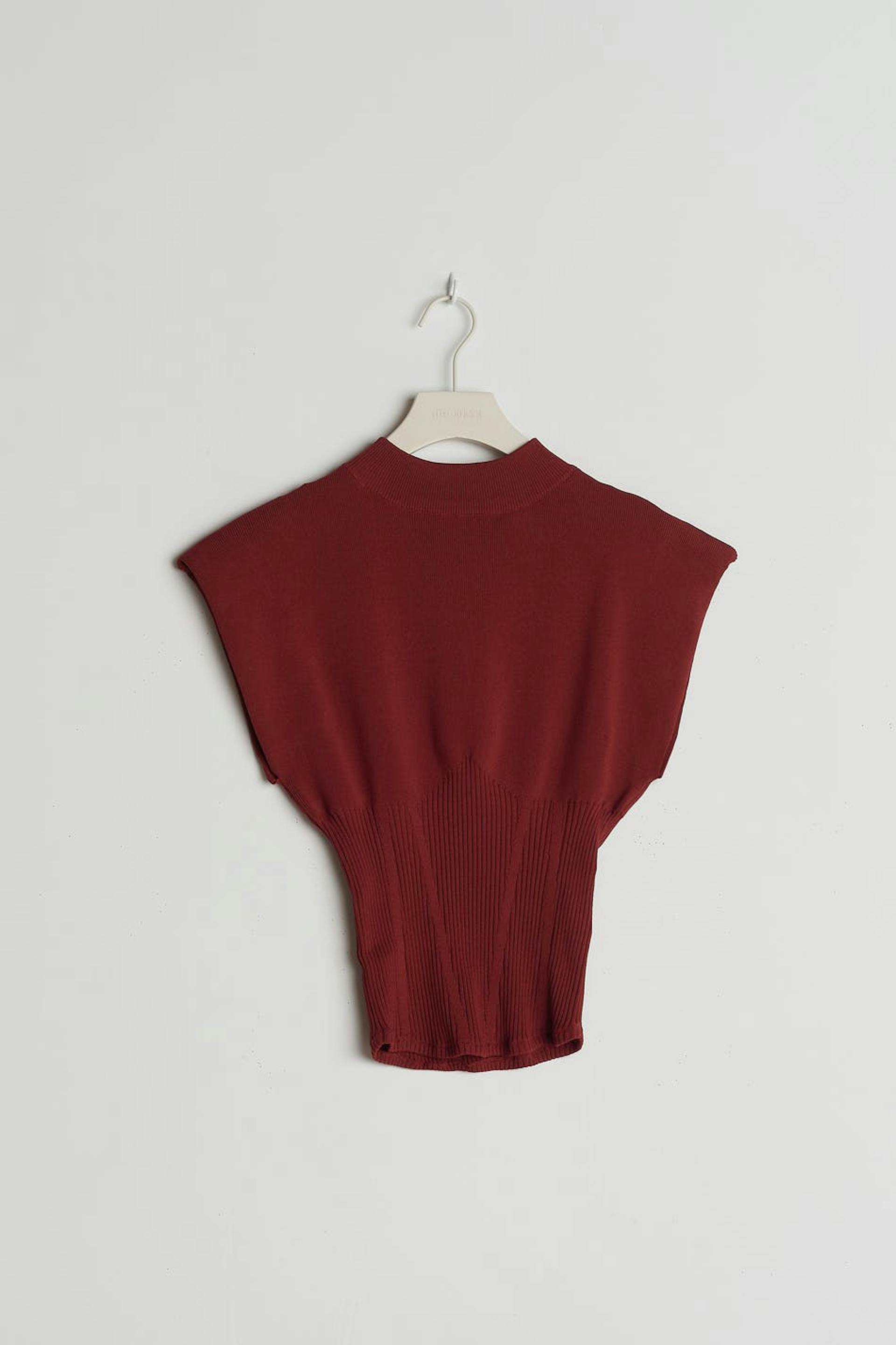 Finstrikket vest med ribbet detaljer. Vesten er rød og har en høy hals. Den har en tilpasset midje og en glidelås i ryggen.