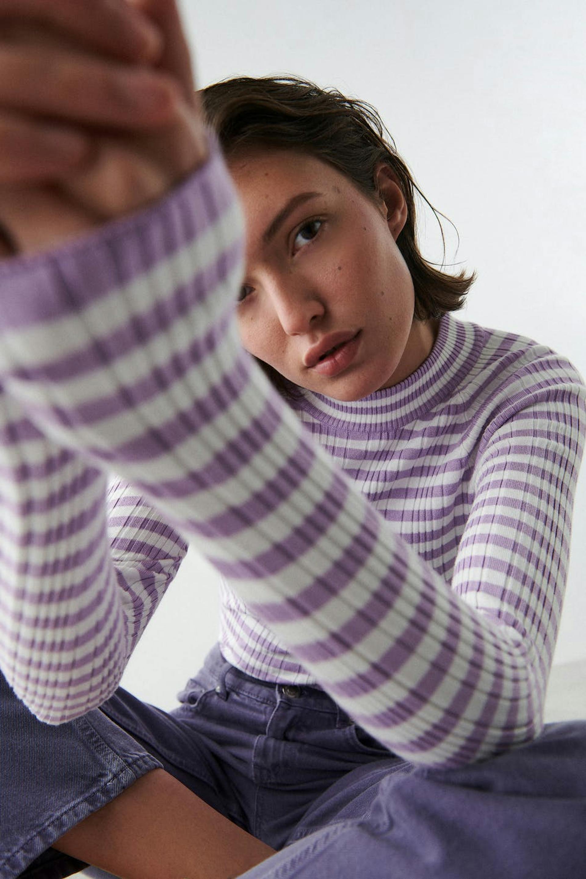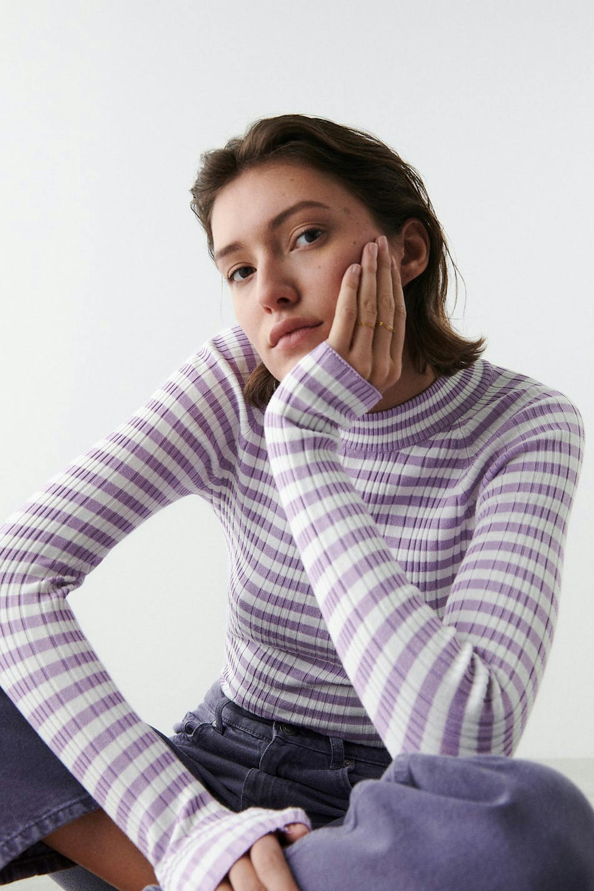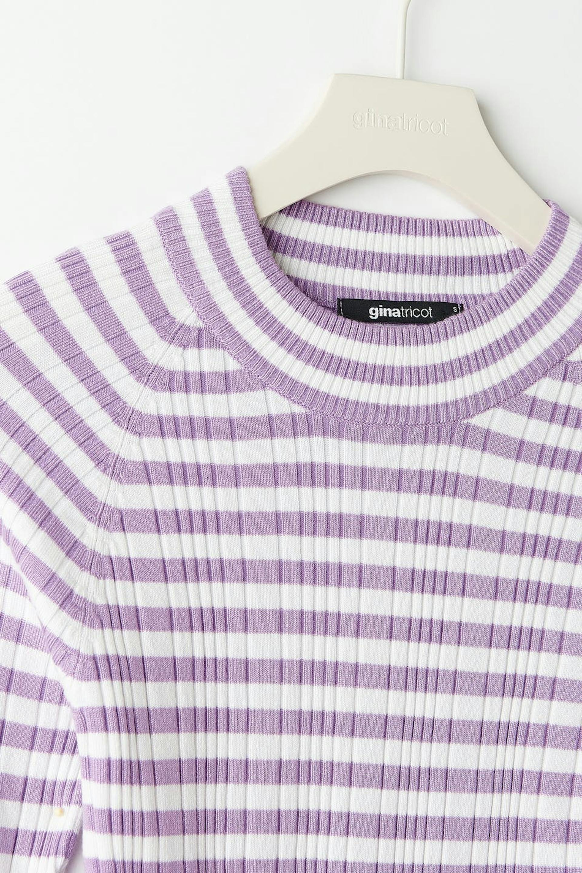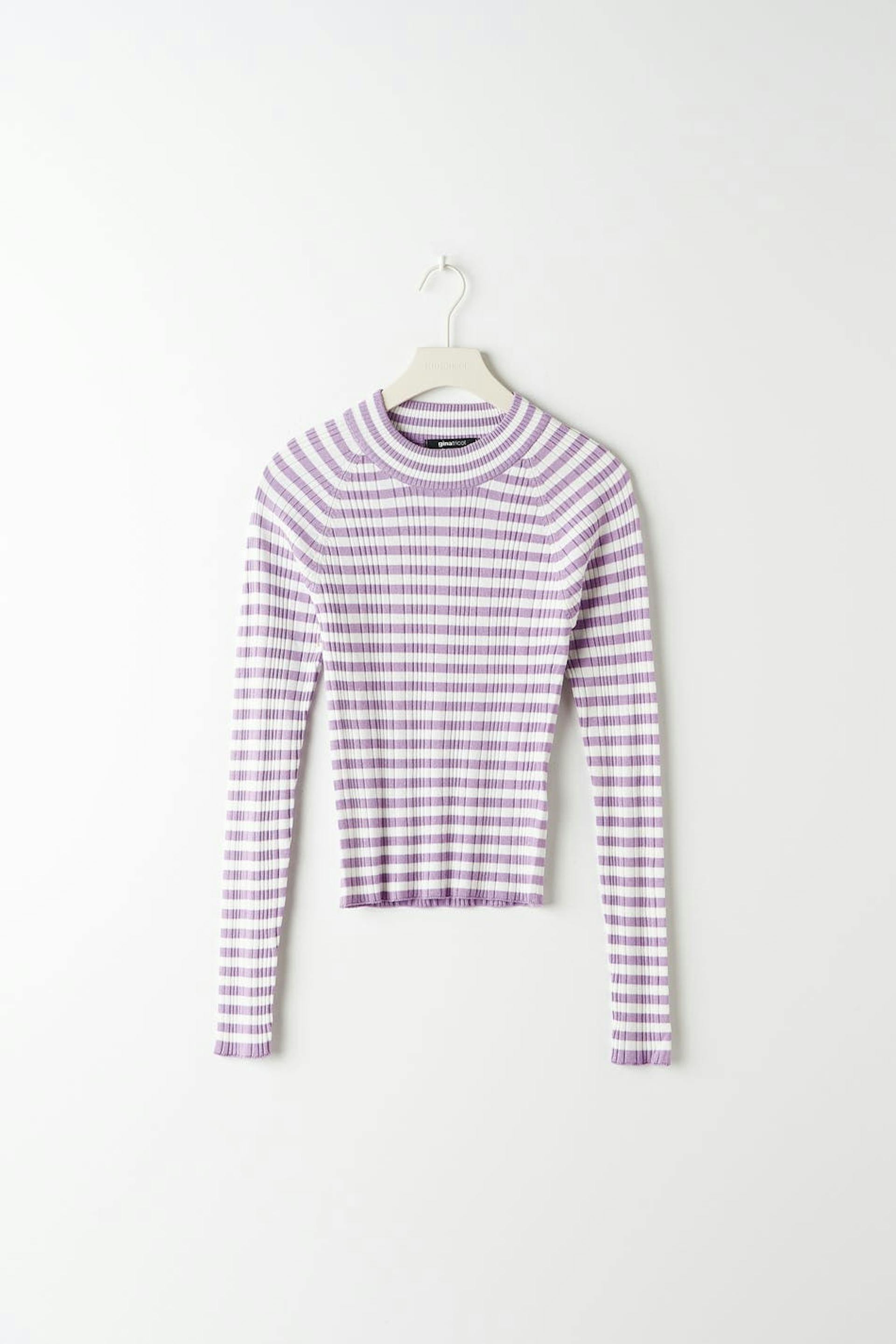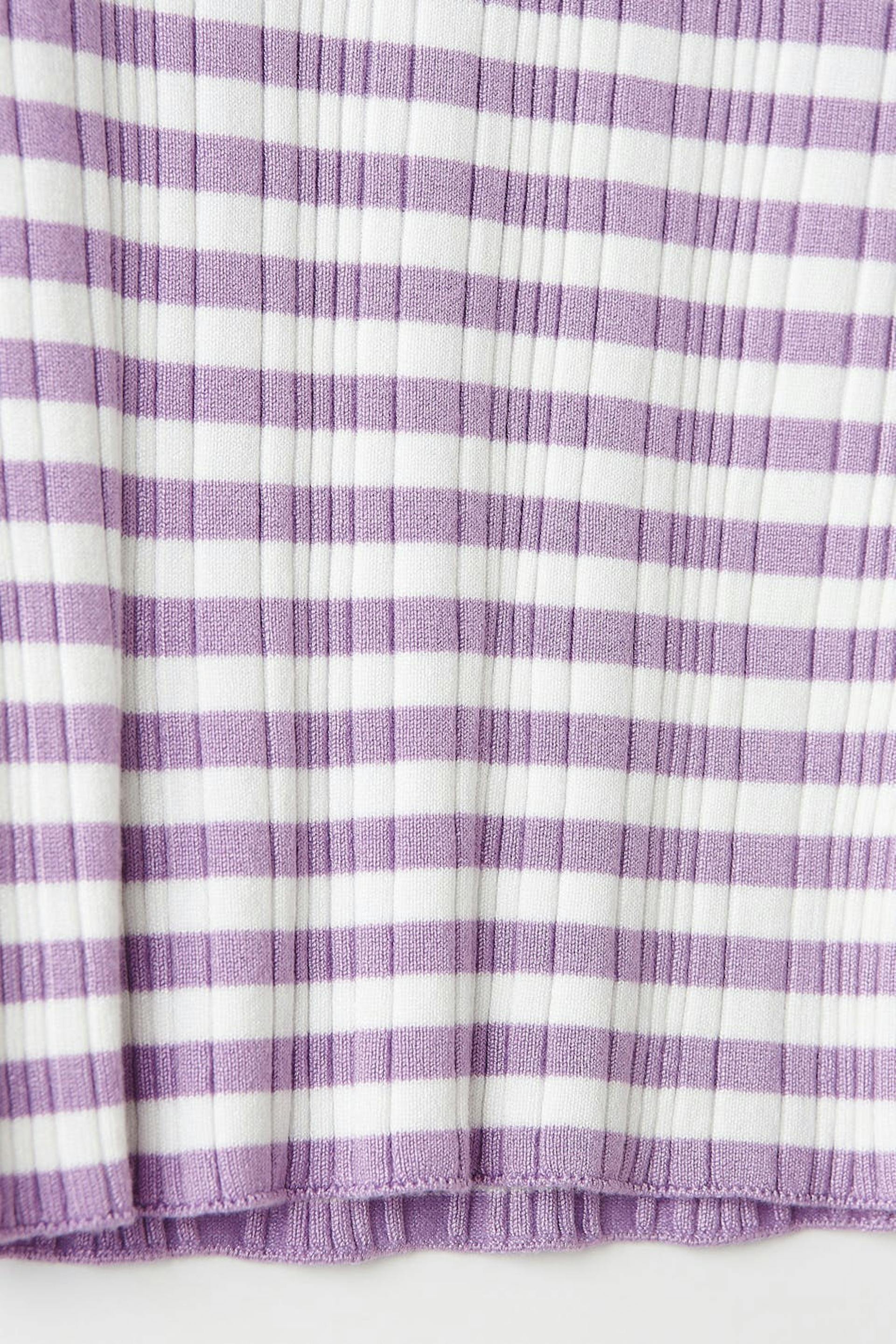 Stripete topp med tilpasset passform. Toppen er lilla, hvit og strikket. Den har en uregelmessig ribbestrikket design, høy hals og lange ermer.