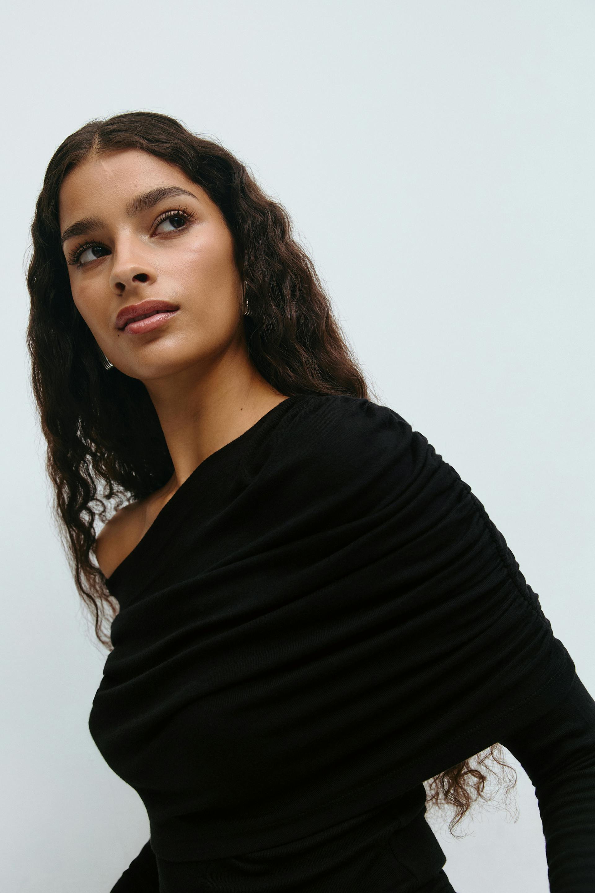 Sloped shoulder cape top