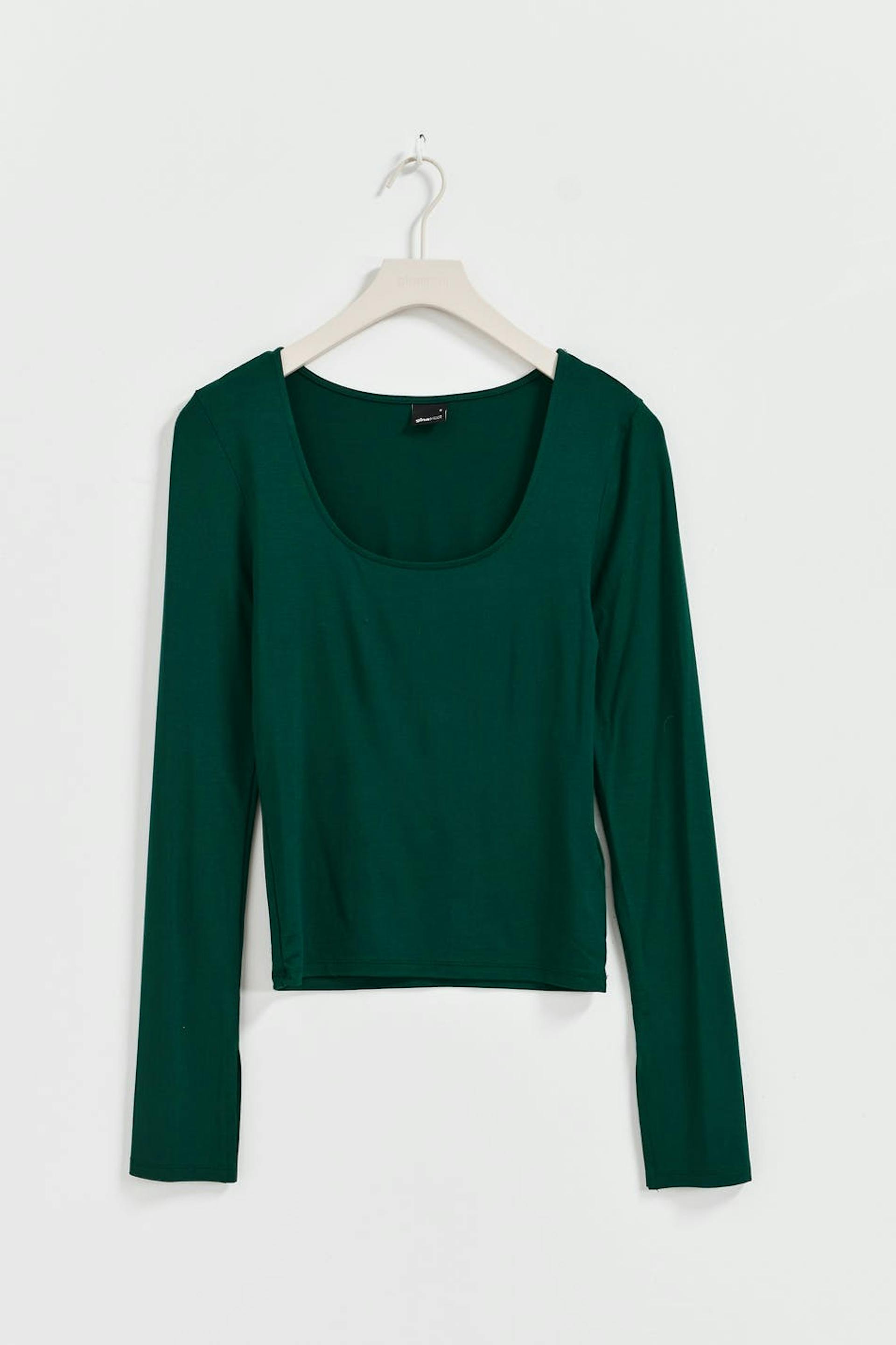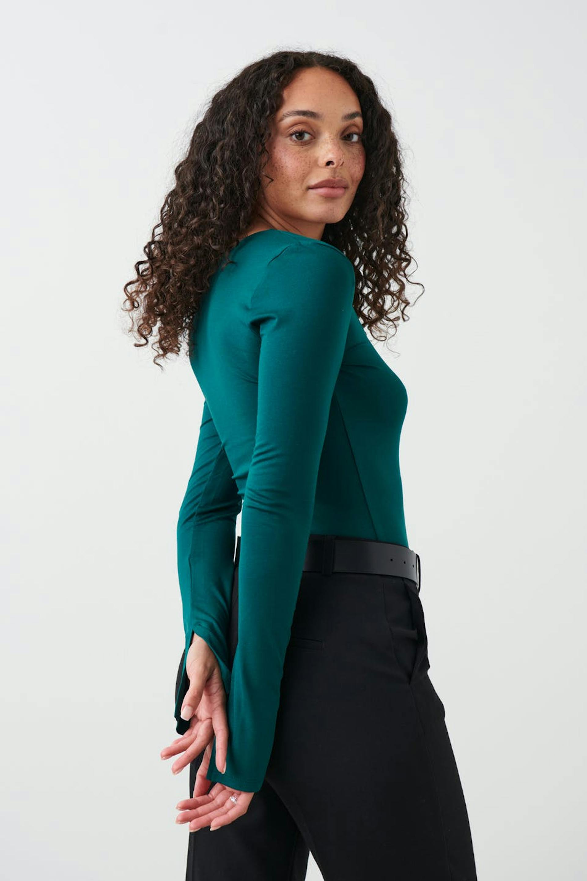 Soft touch – second skin comfort. Langermet topp i myk viskose med en vanlig passform. Toppen er grønn og har tilpasset passform. Den har rund halsutringning og lange ermer med splitt på enden av ermene.