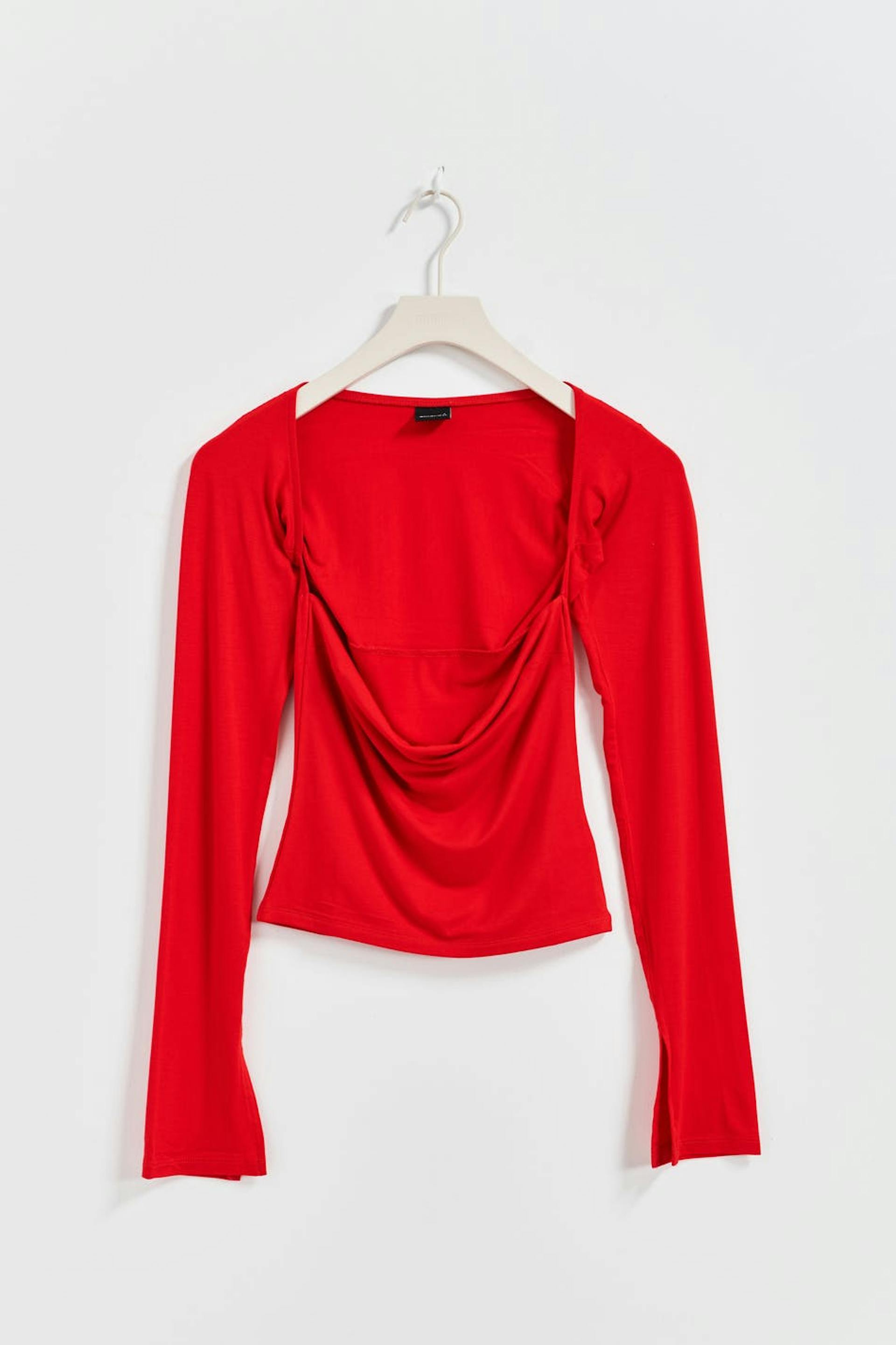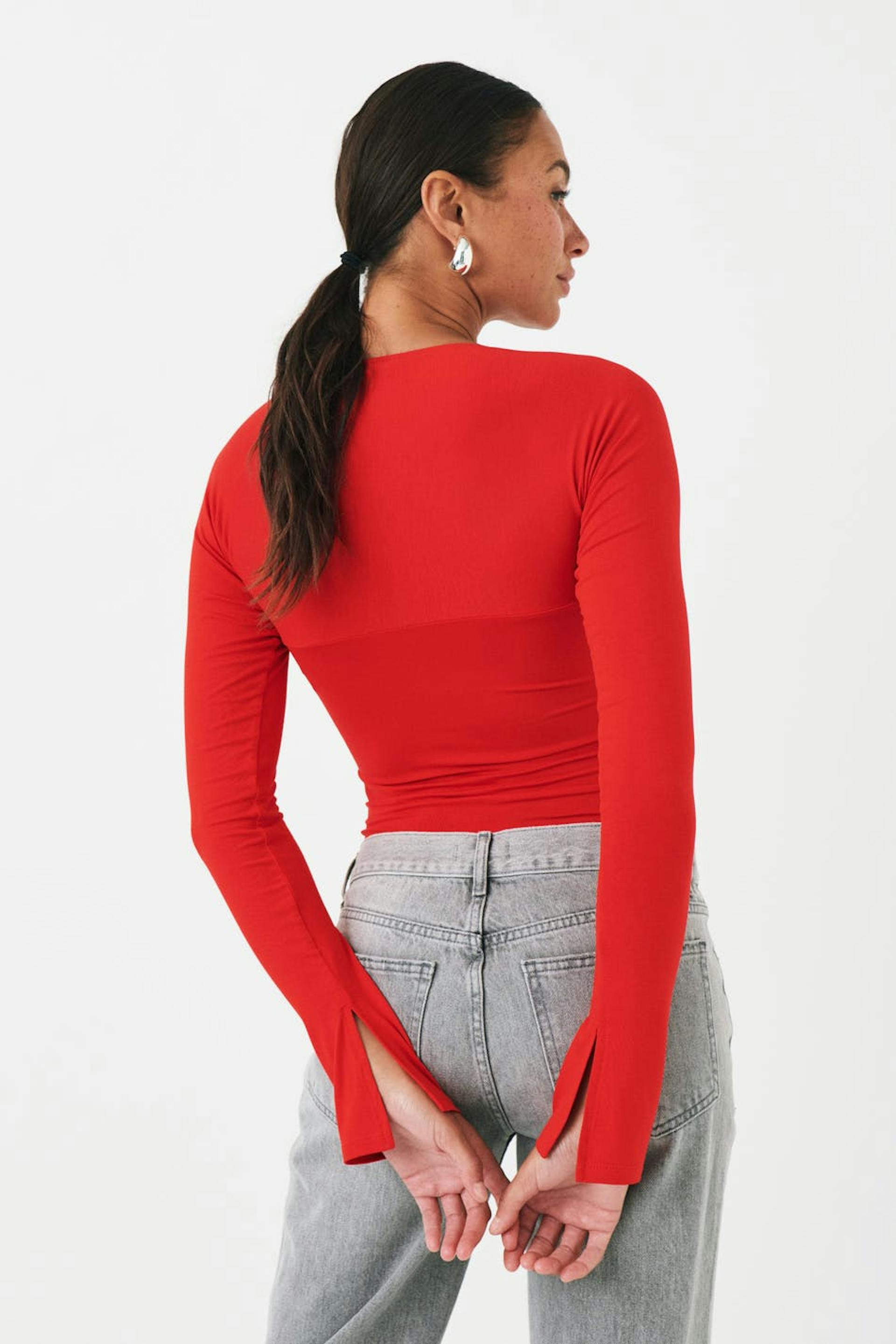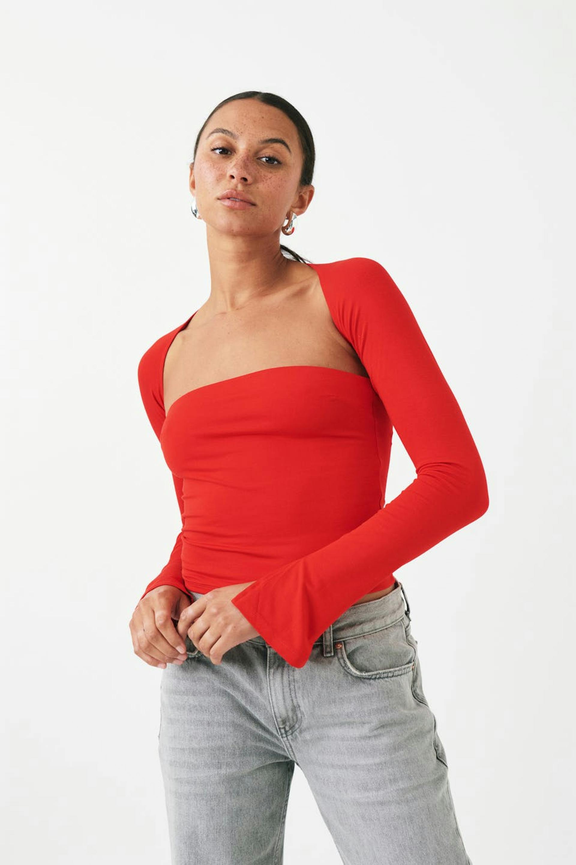 Soft touch – second skin comfort. Langermet topp i boleromodell med firkantet hals. Toppen er rød og har figurnær passform. Den har splitt på enden av ermene og avkortet lengde.