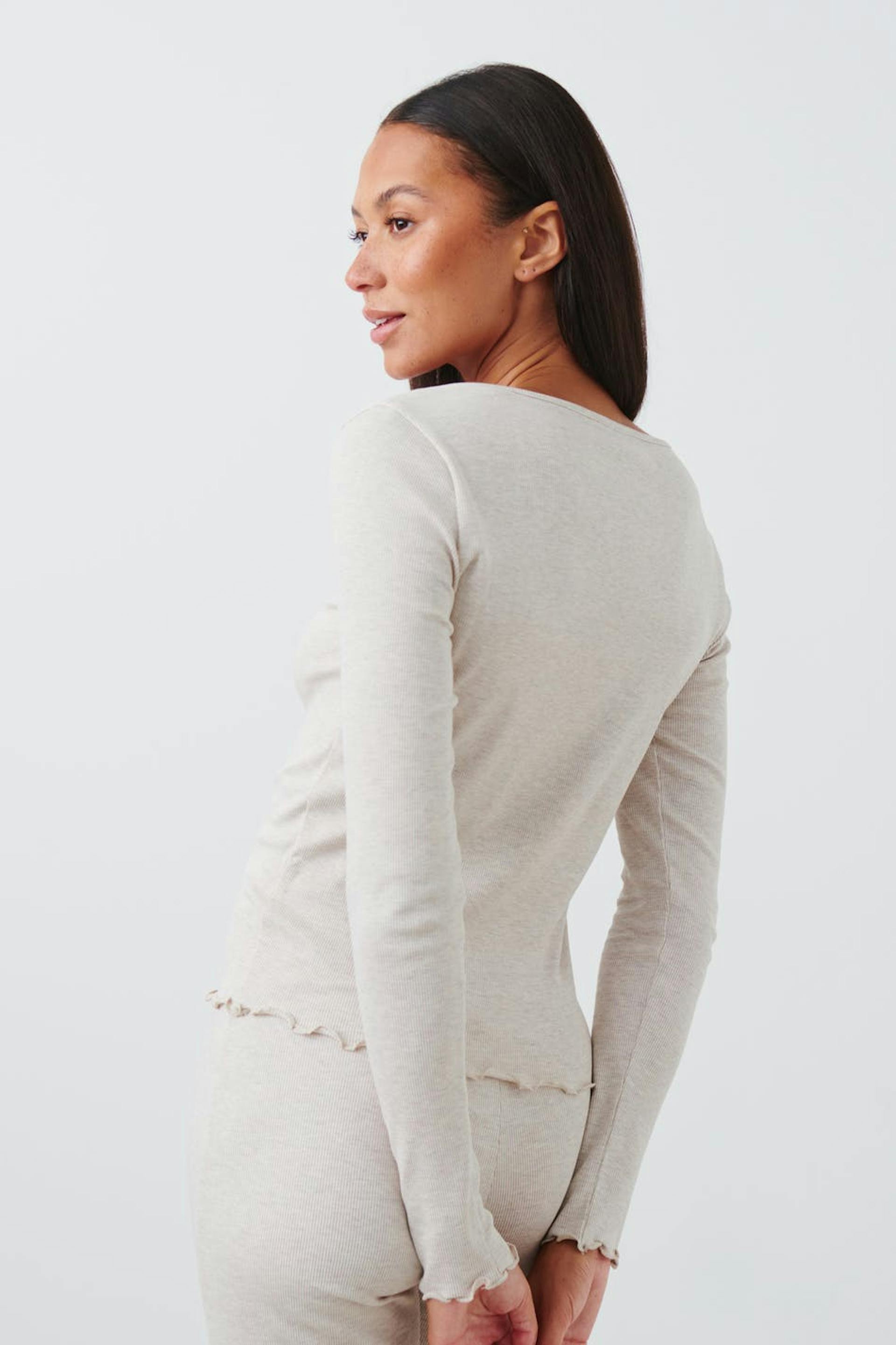 Langermet topp i jersey med myk, ribbet kvalitet. Toppen er beige og har firkantet hals. Den har vanlig passform og rullefald ved ermeslutten og i nedre kant.