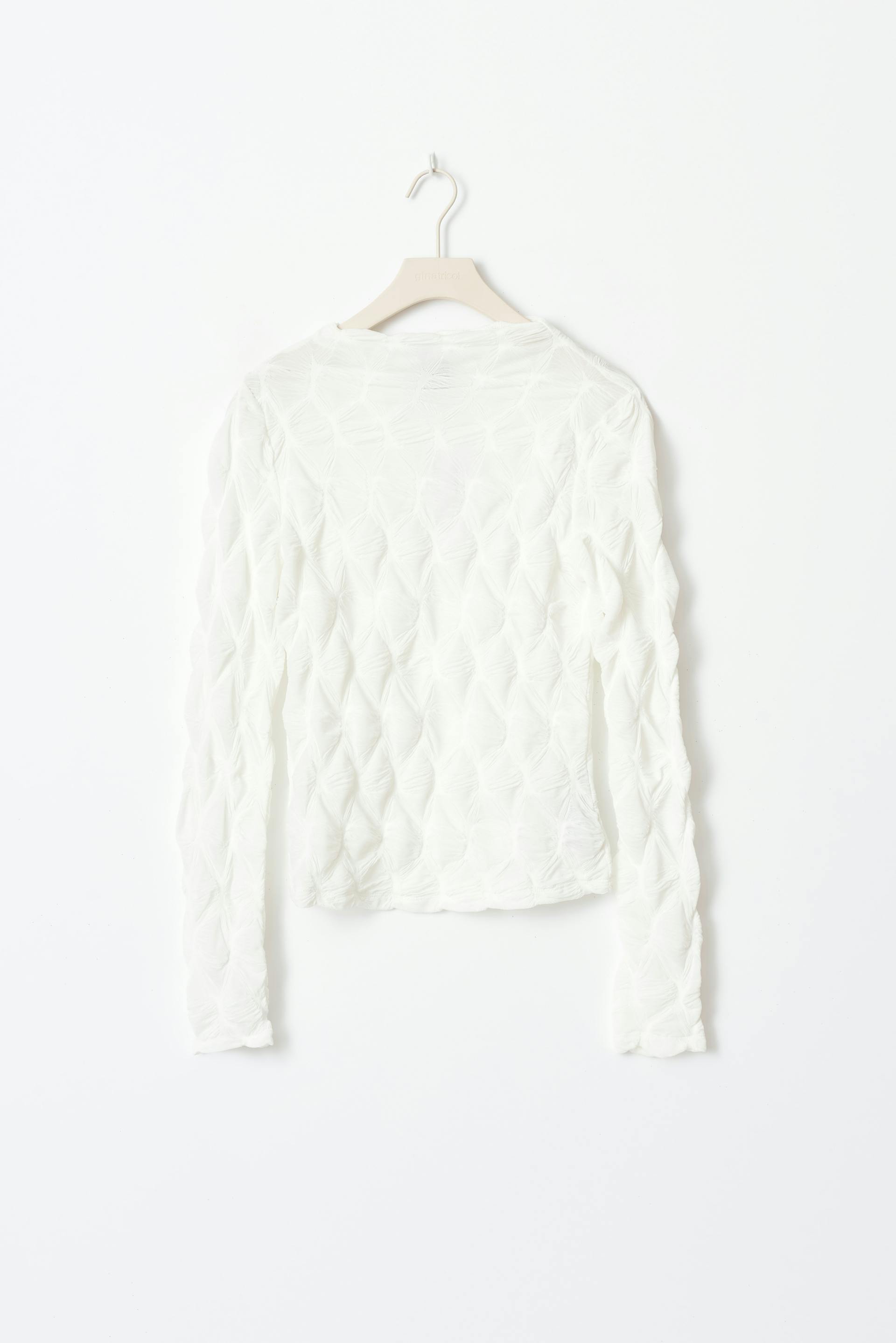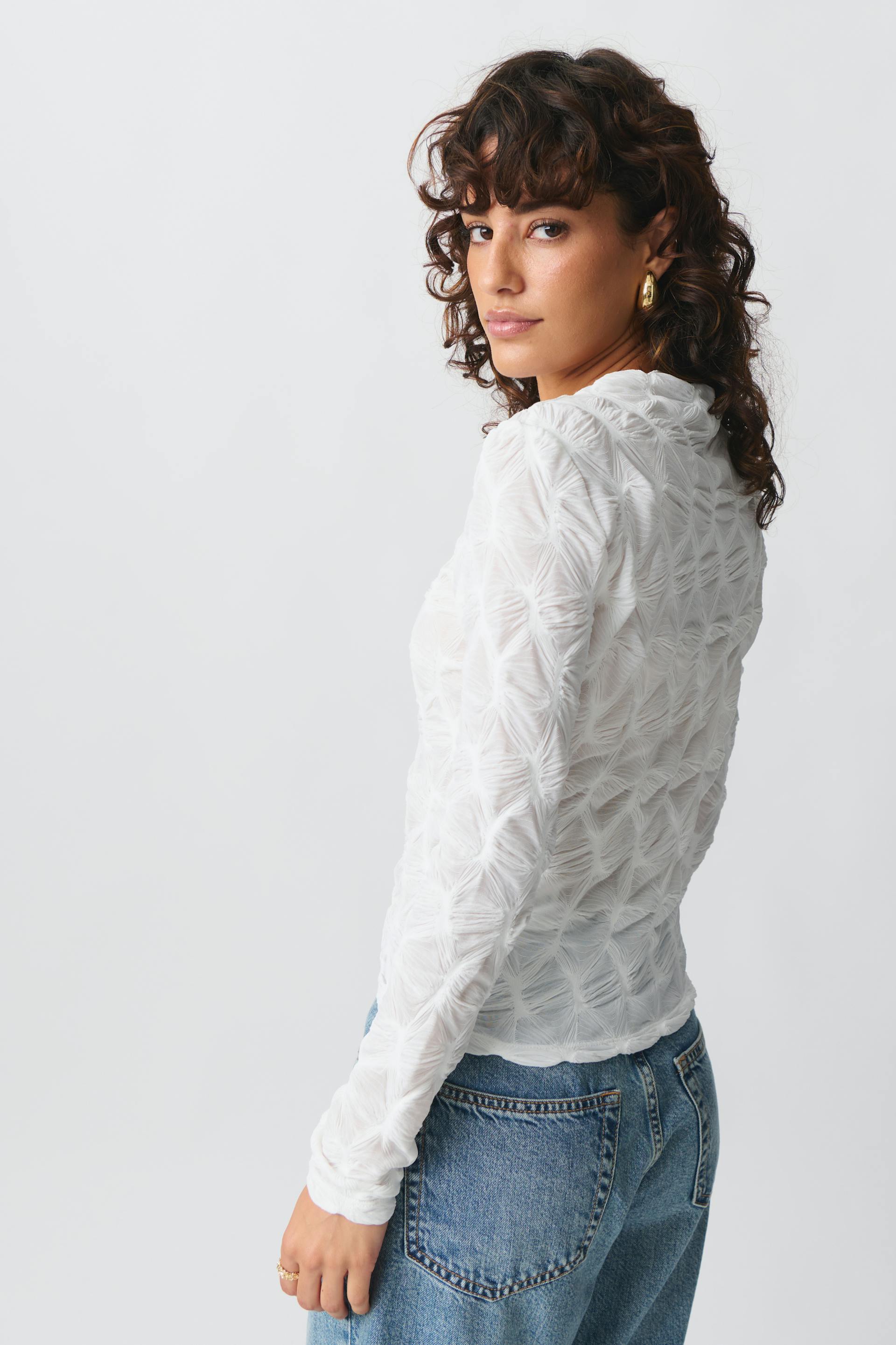 Strukturert topp med traktkrage. Toppen er hvit og har figurnær passform. Den har langt erme og normal lengde.