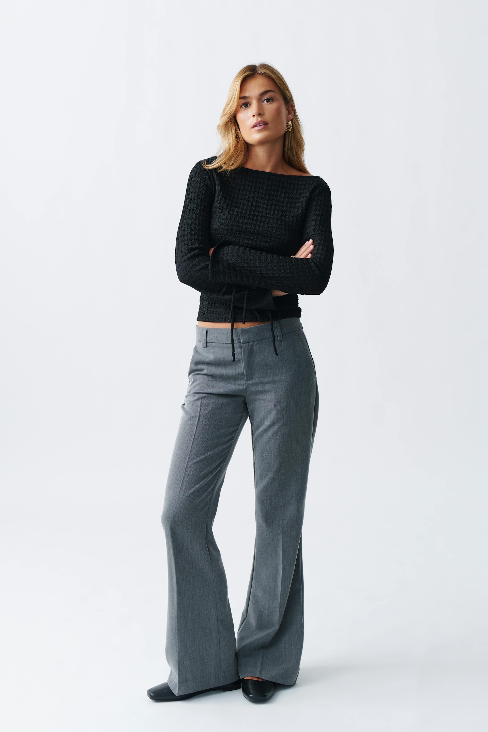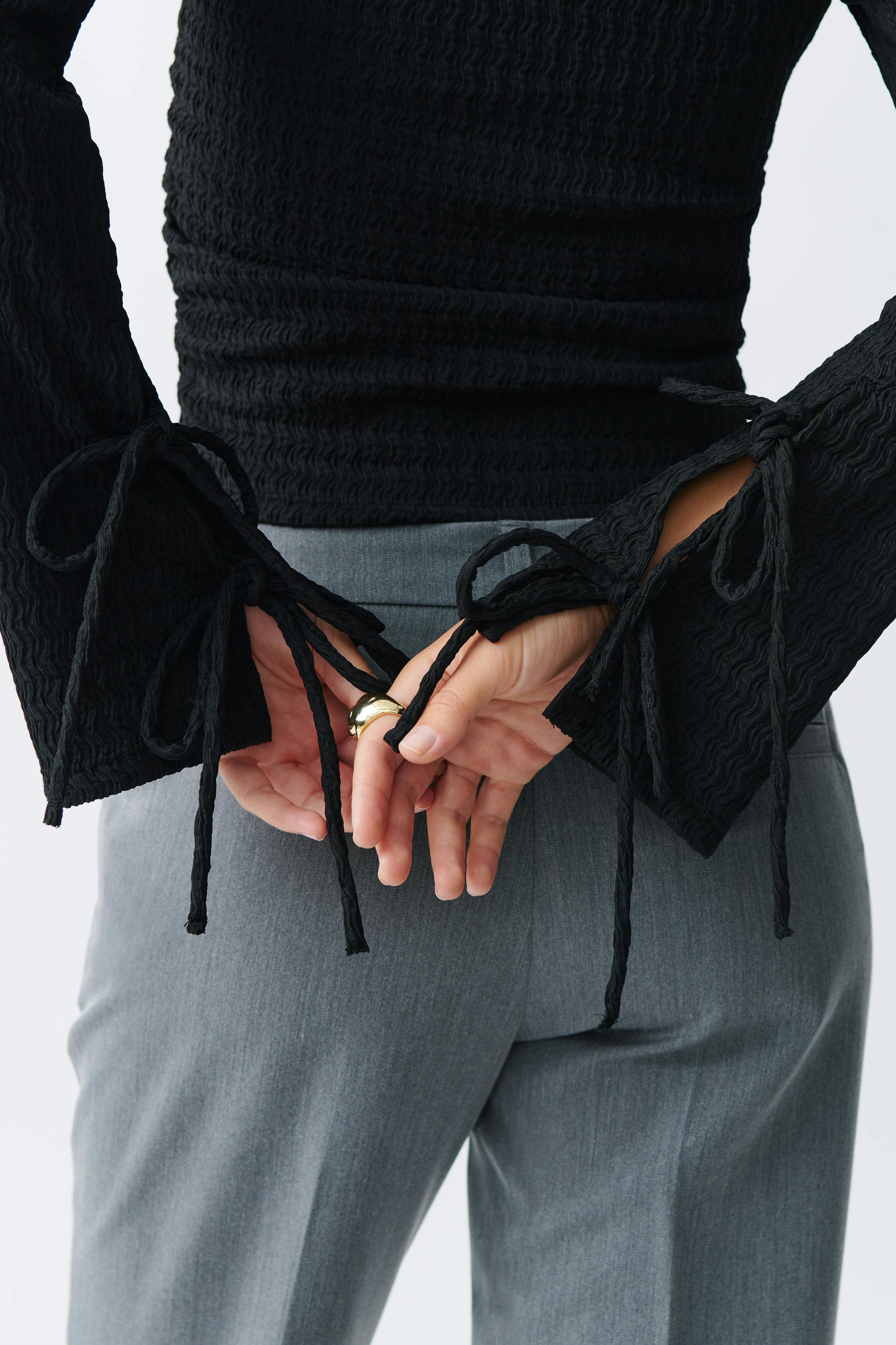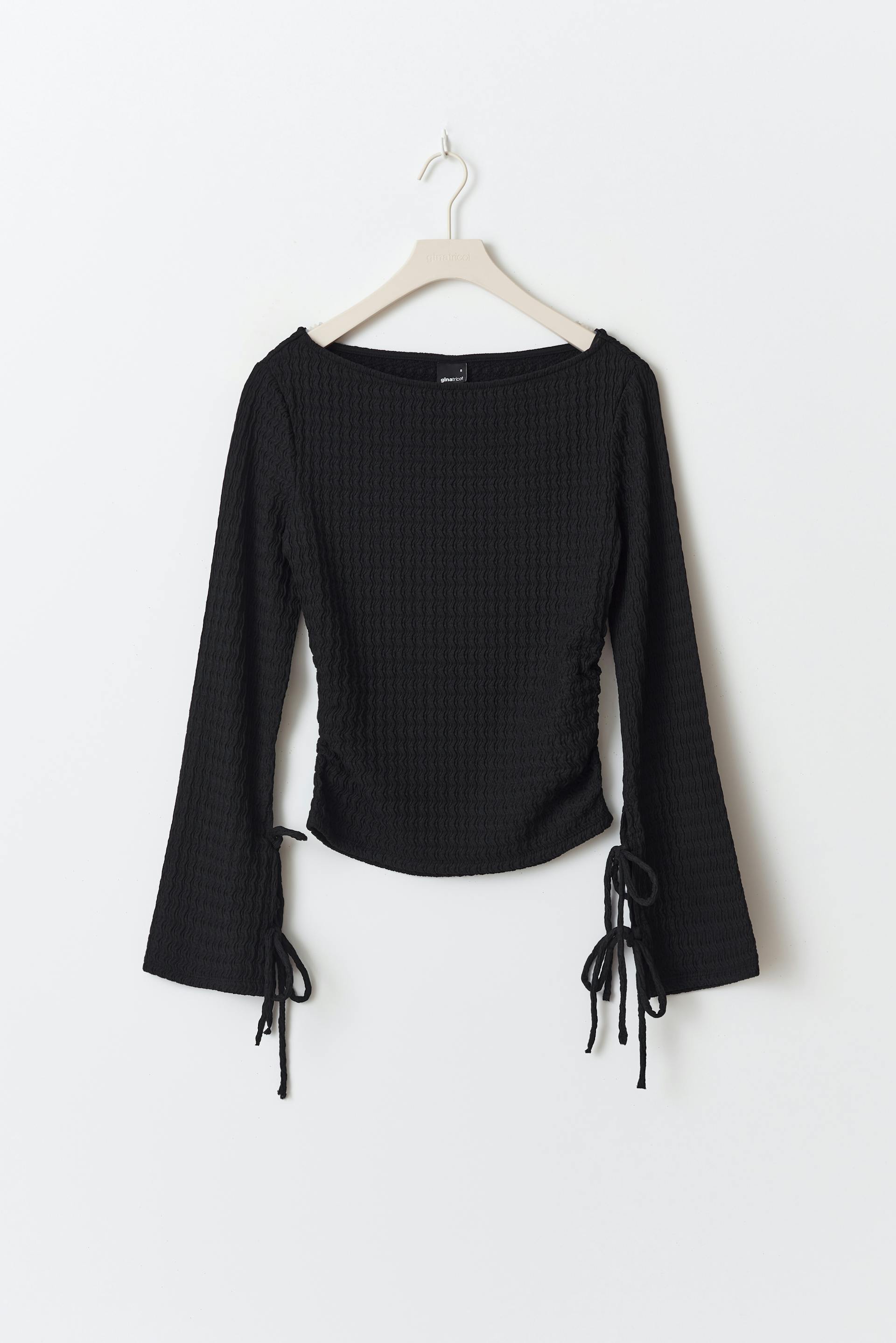 Strukturert topp med båtutringning. Toppen er svart og har rynker i sidene. Den har figurnær passform og langt erme med knytbare detaljer og splitt på enden av ermene.