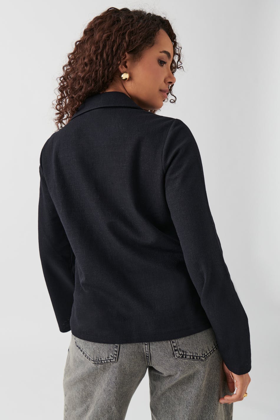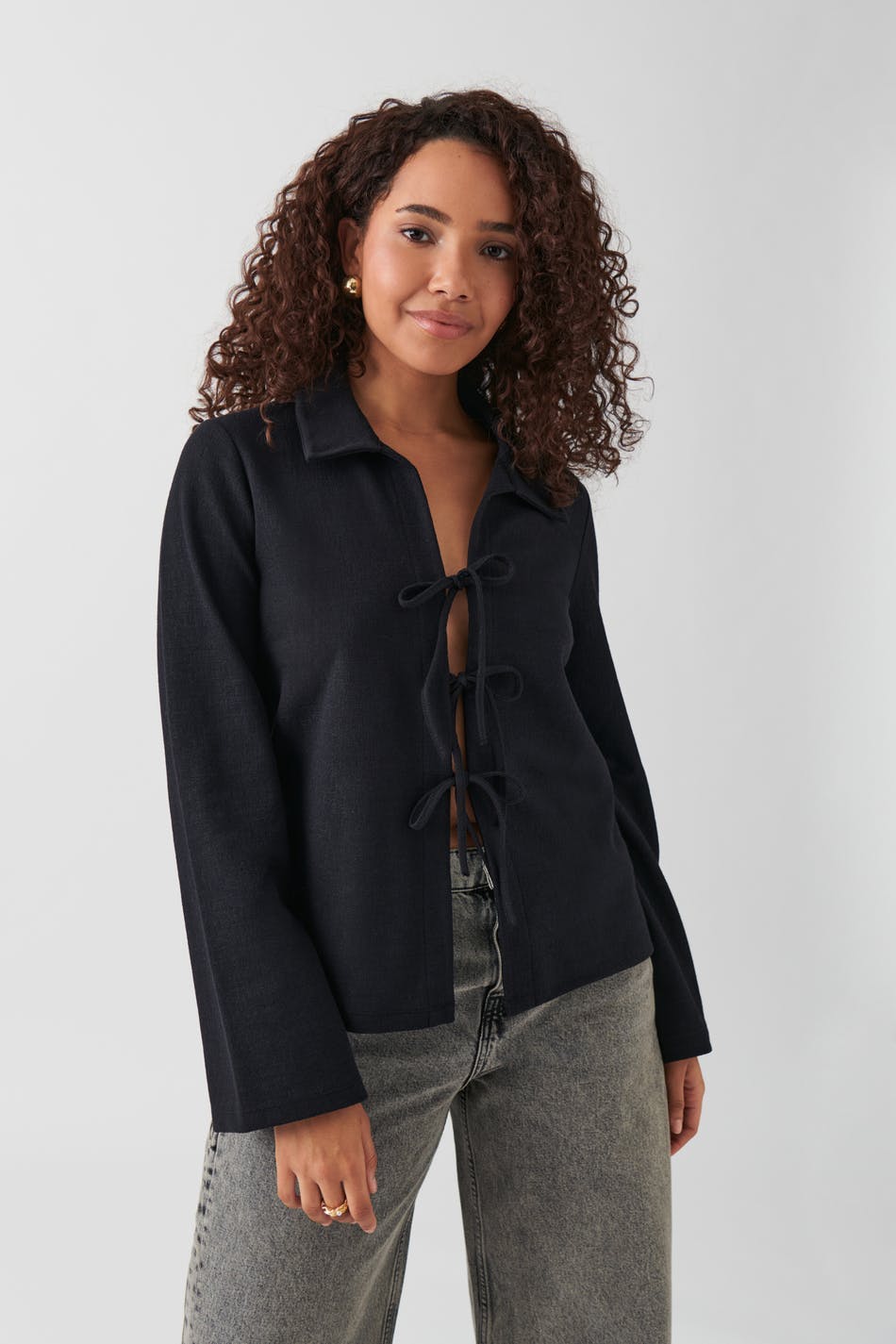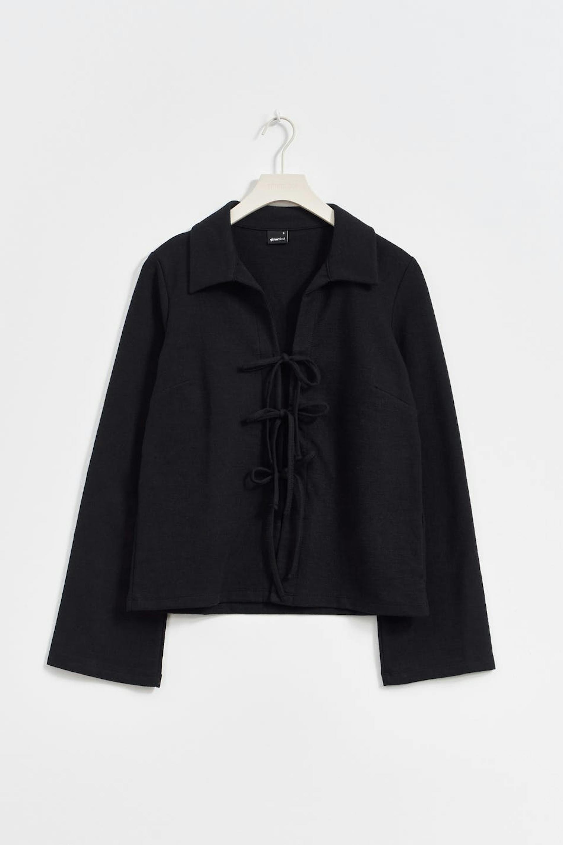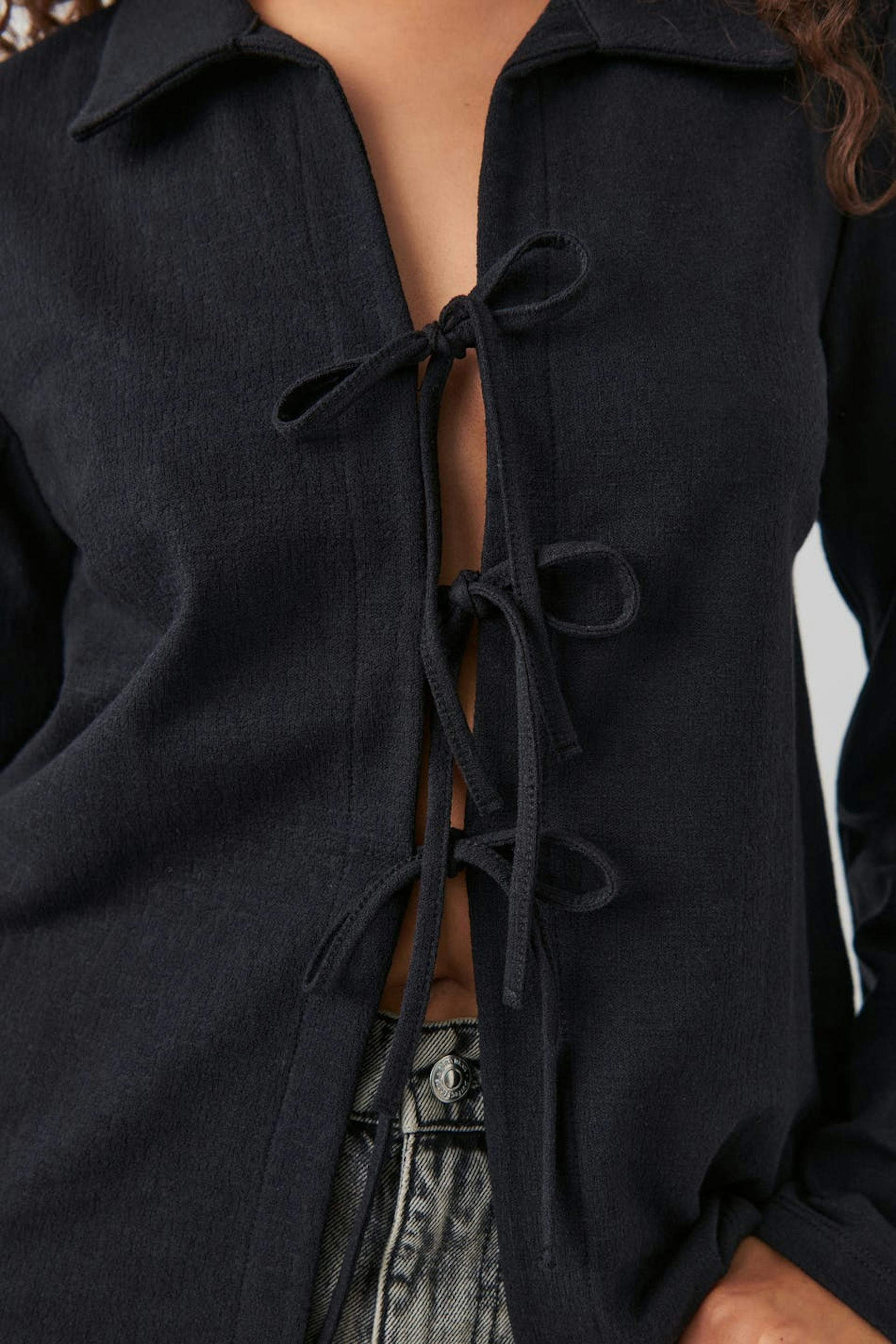 Langermet knytetopp i jersey med løs passform. Toppen er svart og har et strukturert materiale. Den har krage, normal lengde og knutelukking foran.