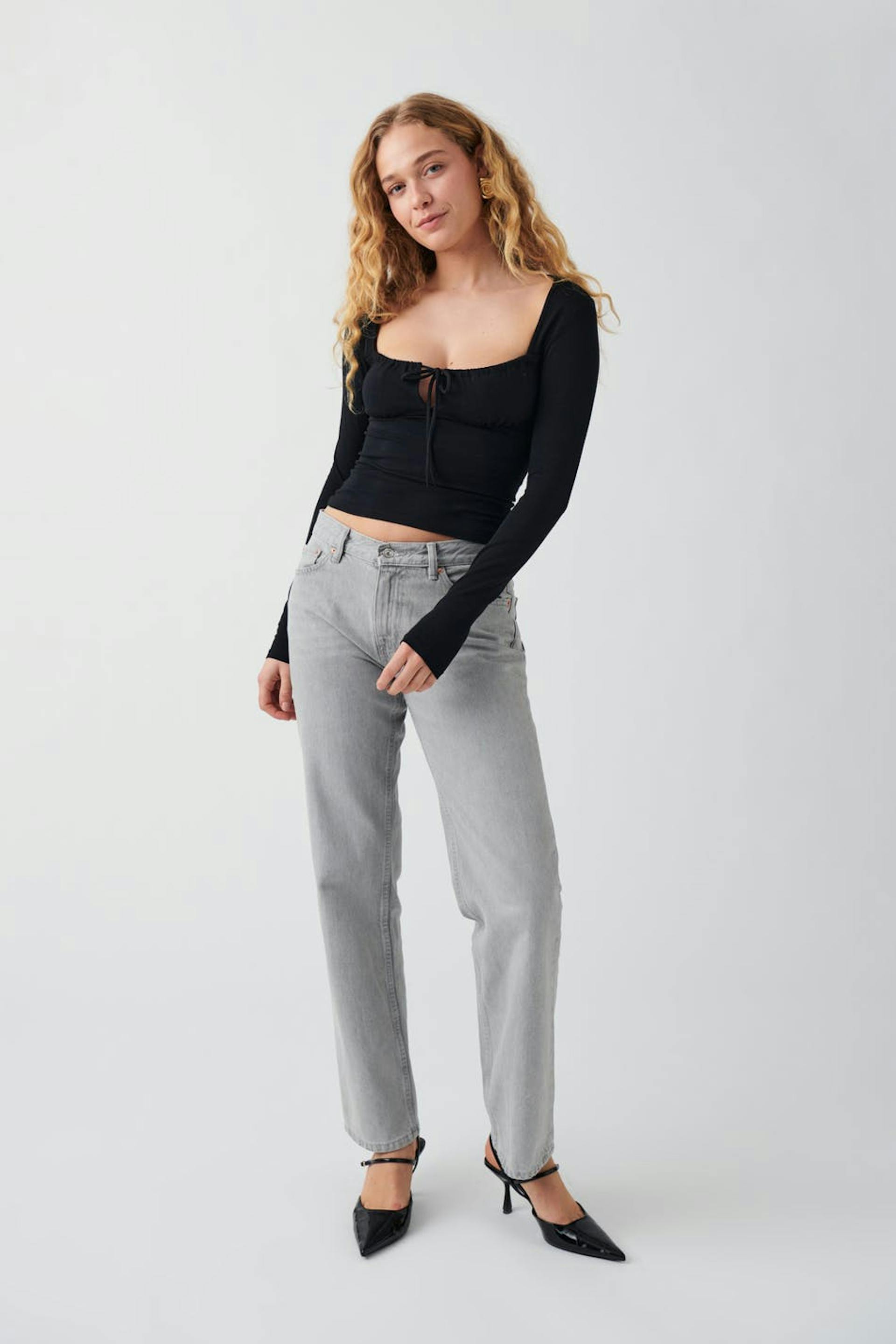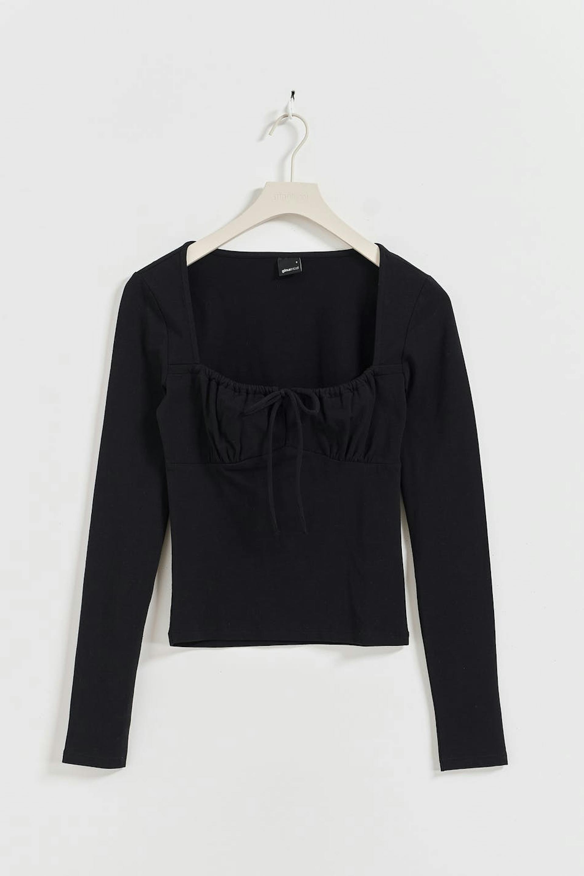 Langermet topp med knyting på forsiden. Toppen er svart og har figurnær passform. Den har dyp u-hals, rysjet bryst og normal lengde.