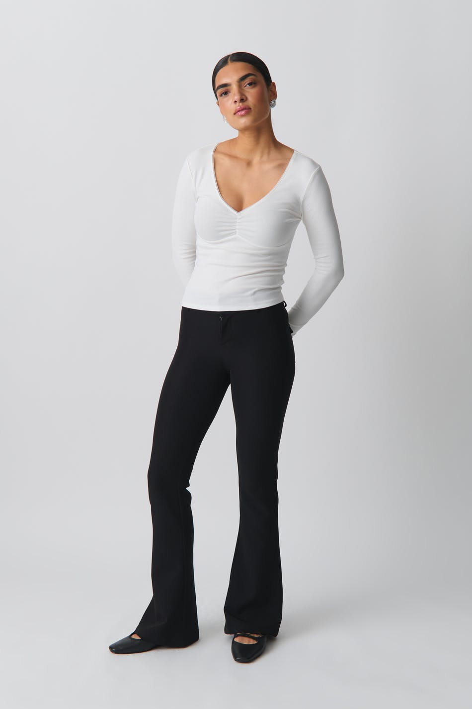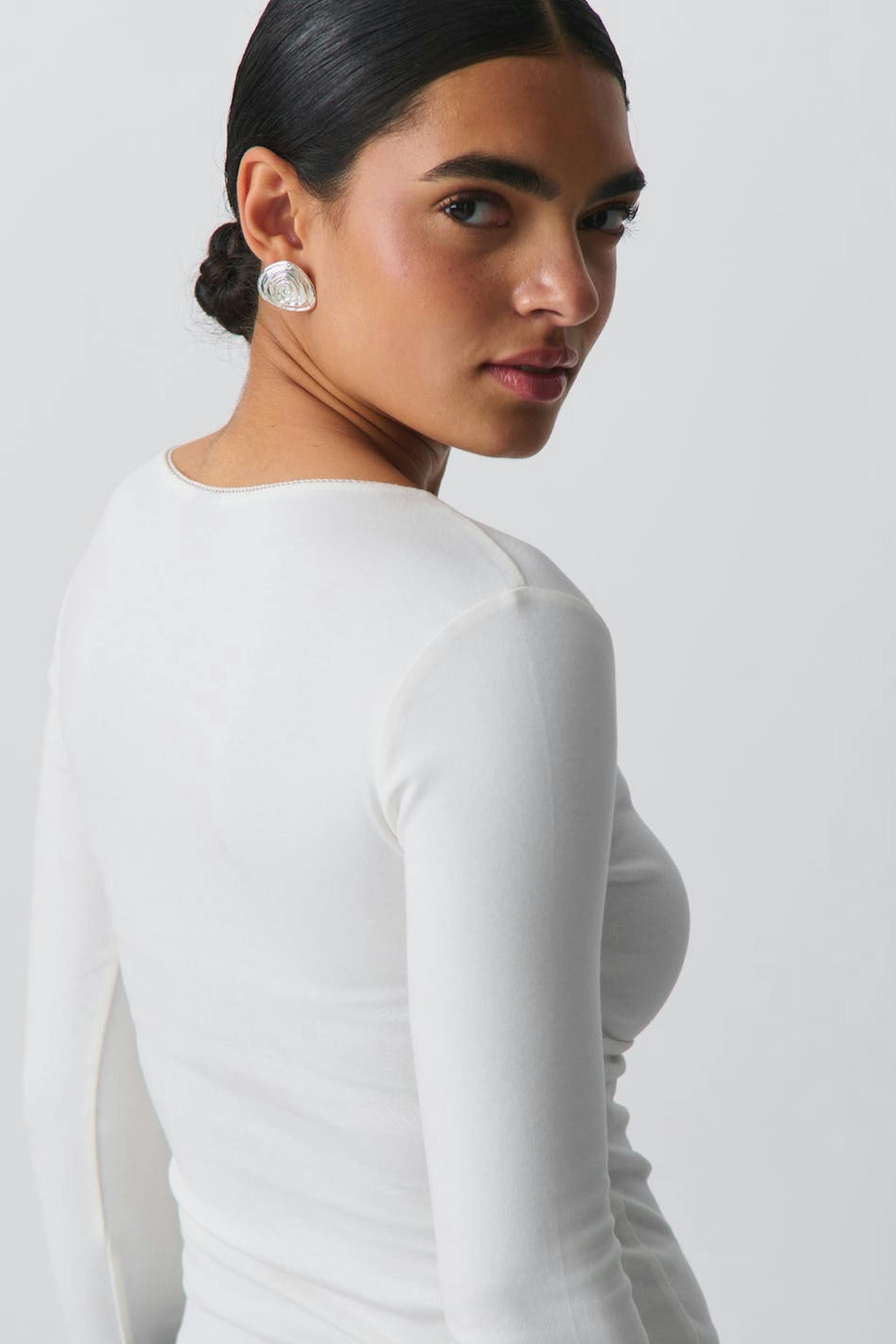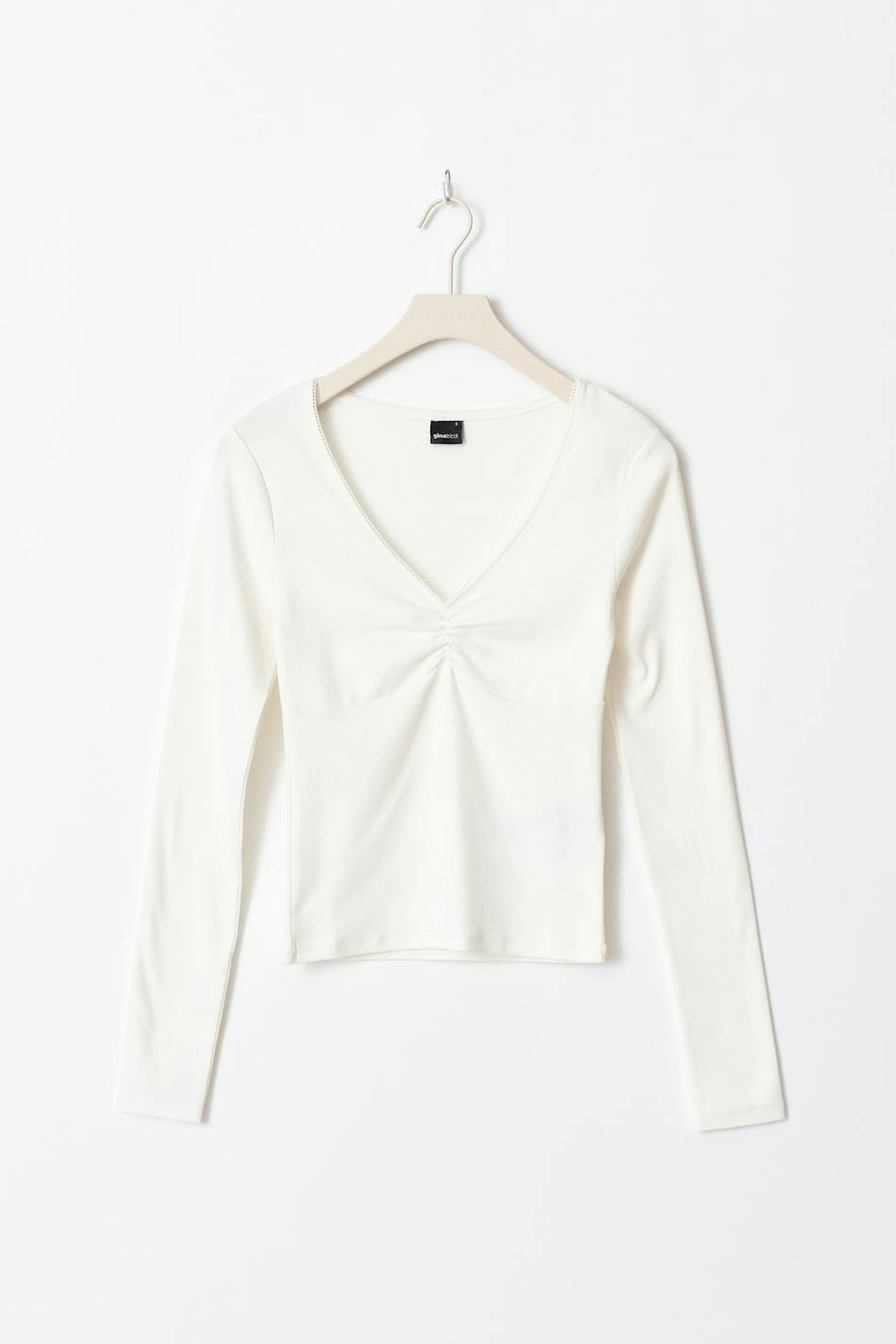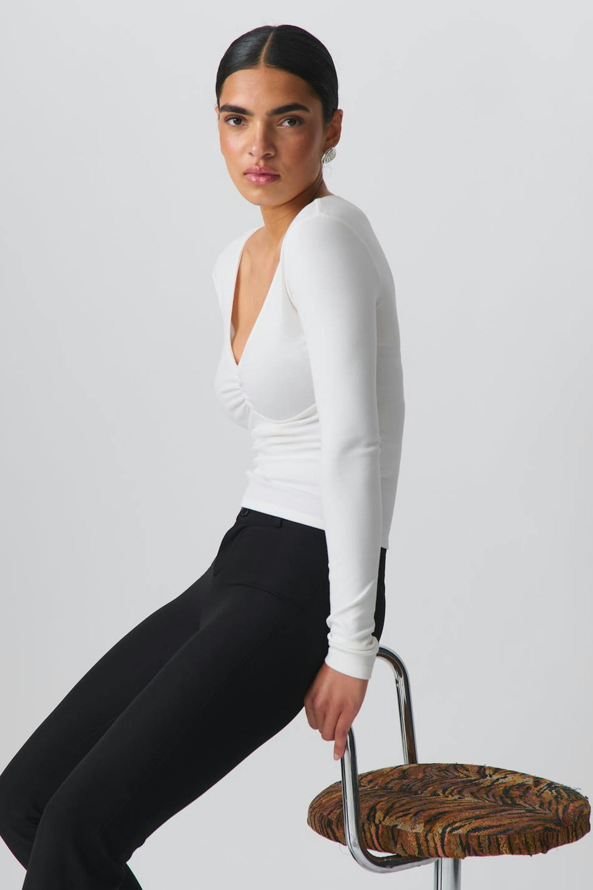 Langermet topp med rysjet bryst. Toppen er hvit og har v-ringning. Den har normal passform og ribbet kvalitet.