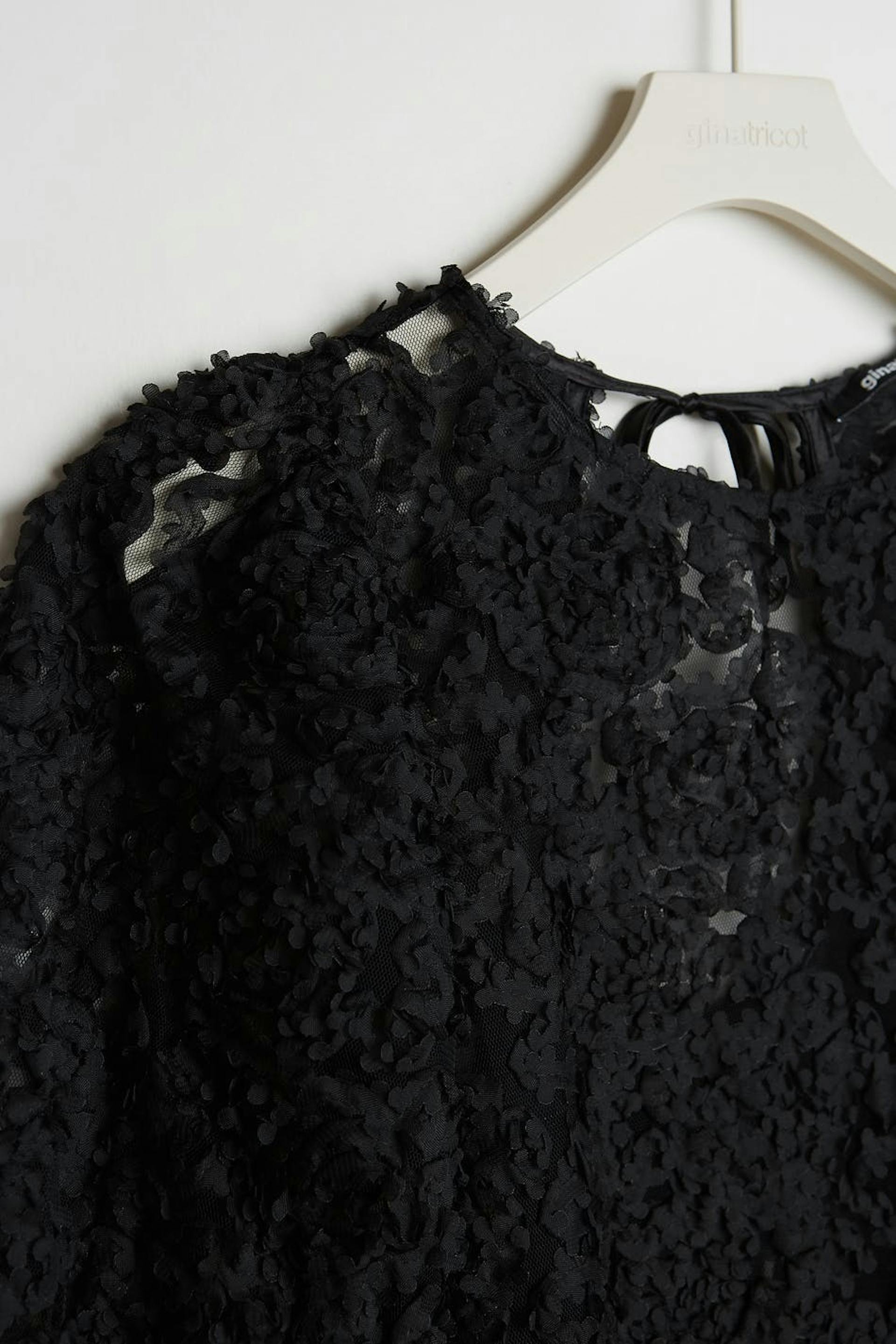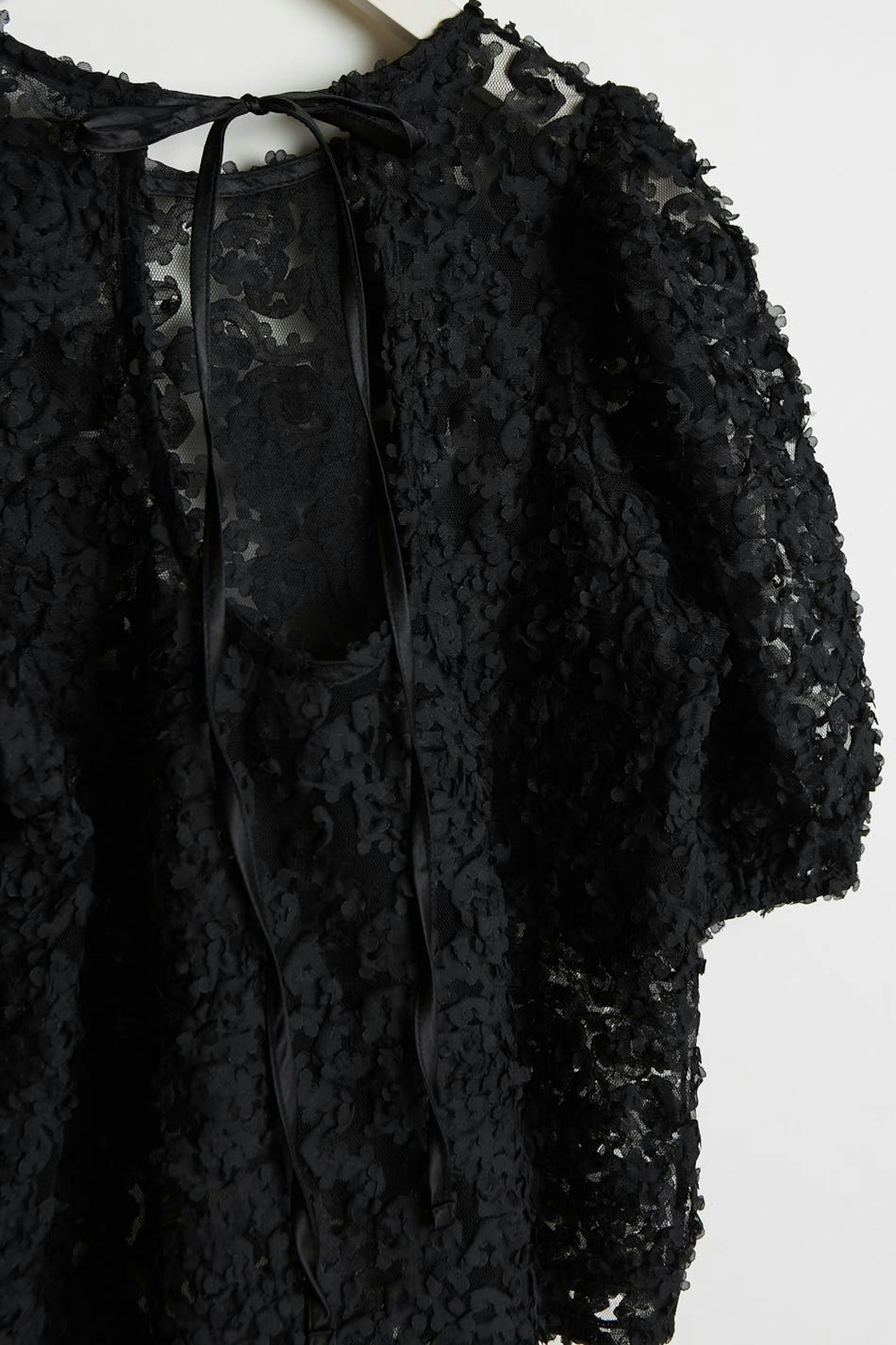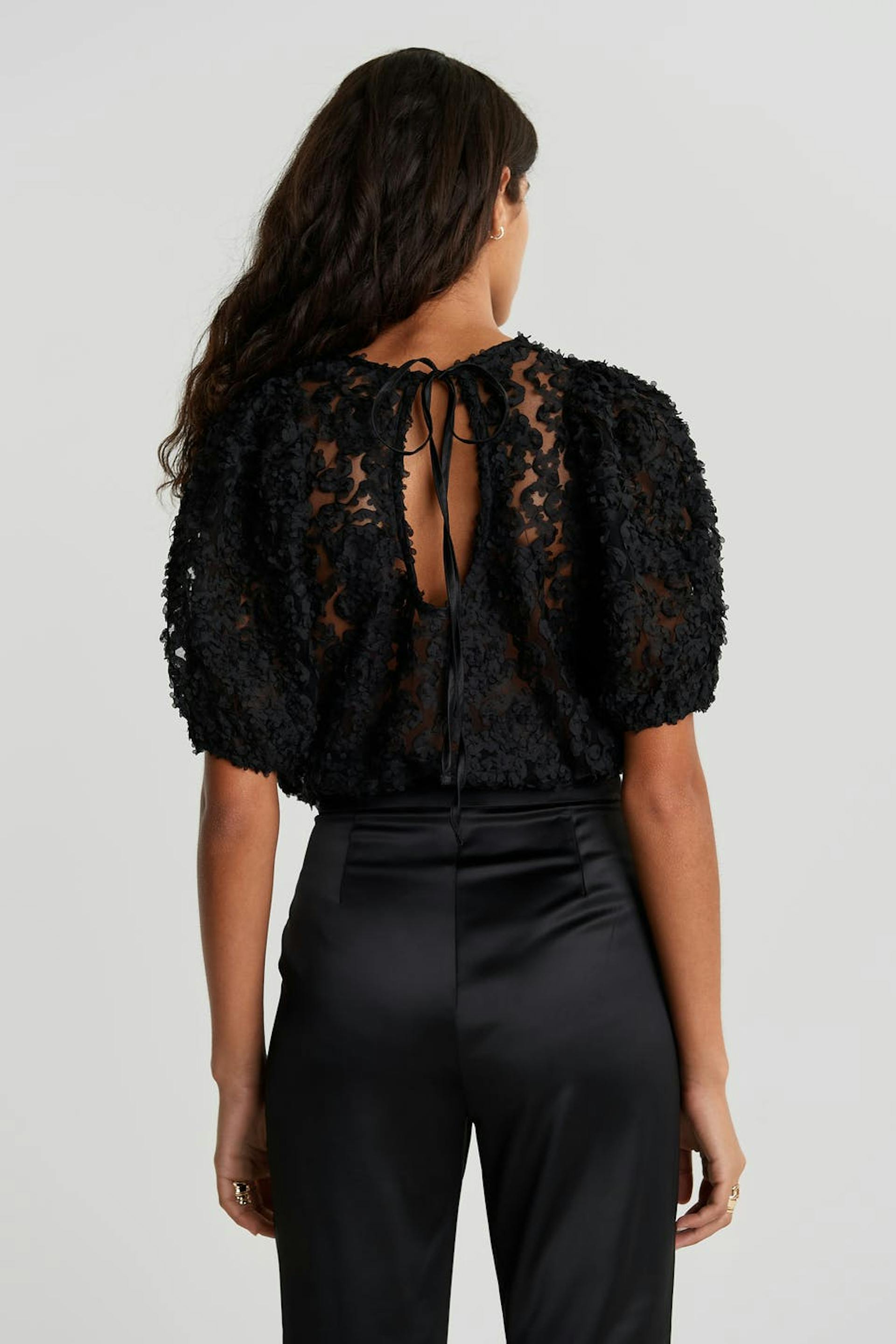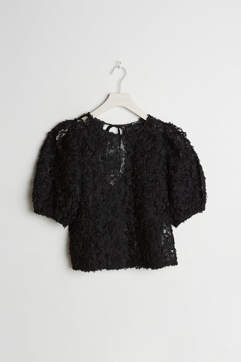 Topp med en vanlig passform. Toppen er perfekt for festen og svart og har korte puffermer. Den har 3D-ene detaljer.