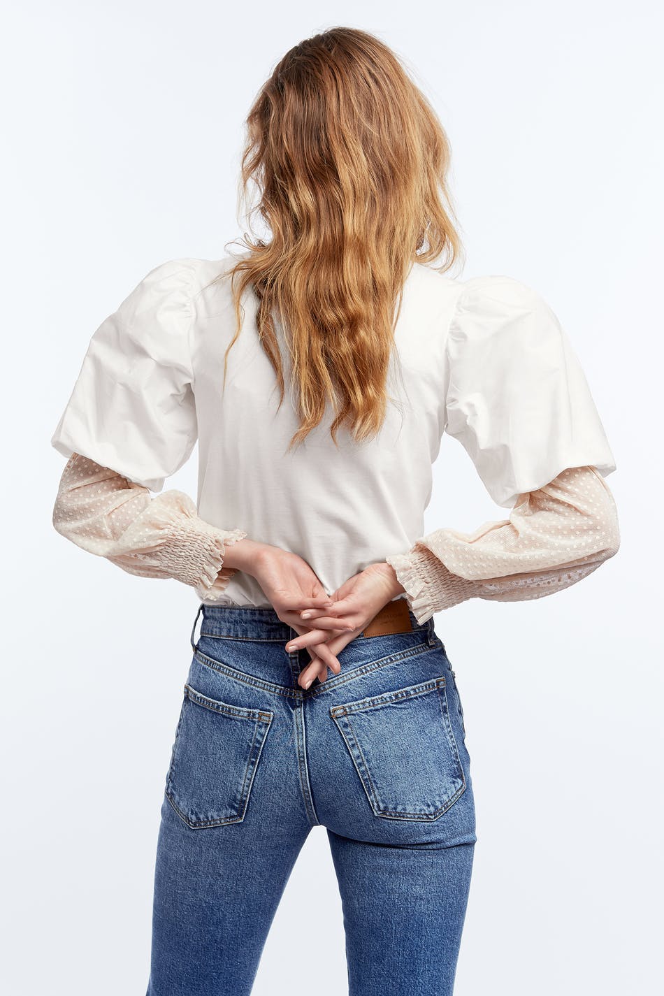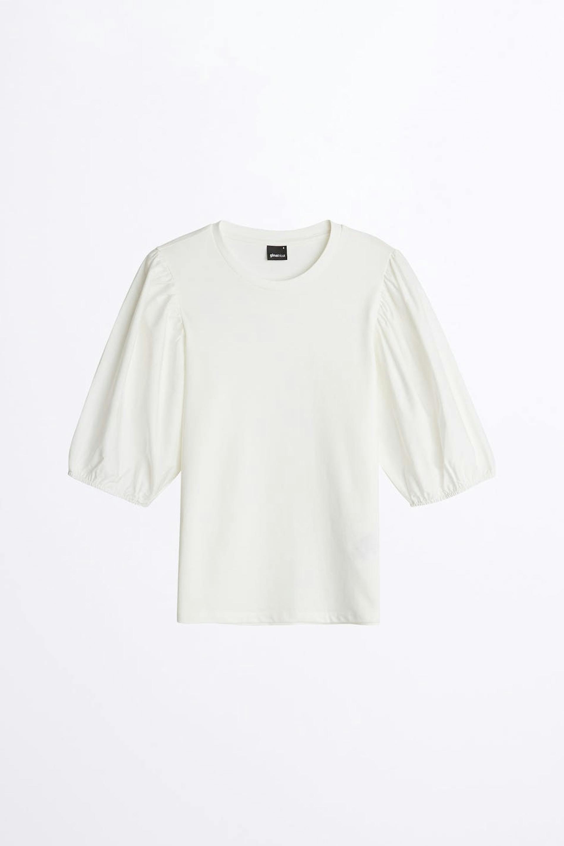 Topp med en romslig passform. Toppen er hvit og har puffermer i poplin. Den har en rund hals.