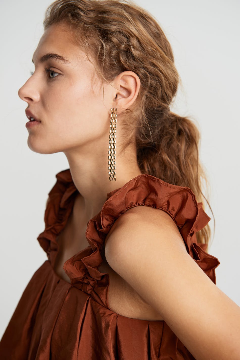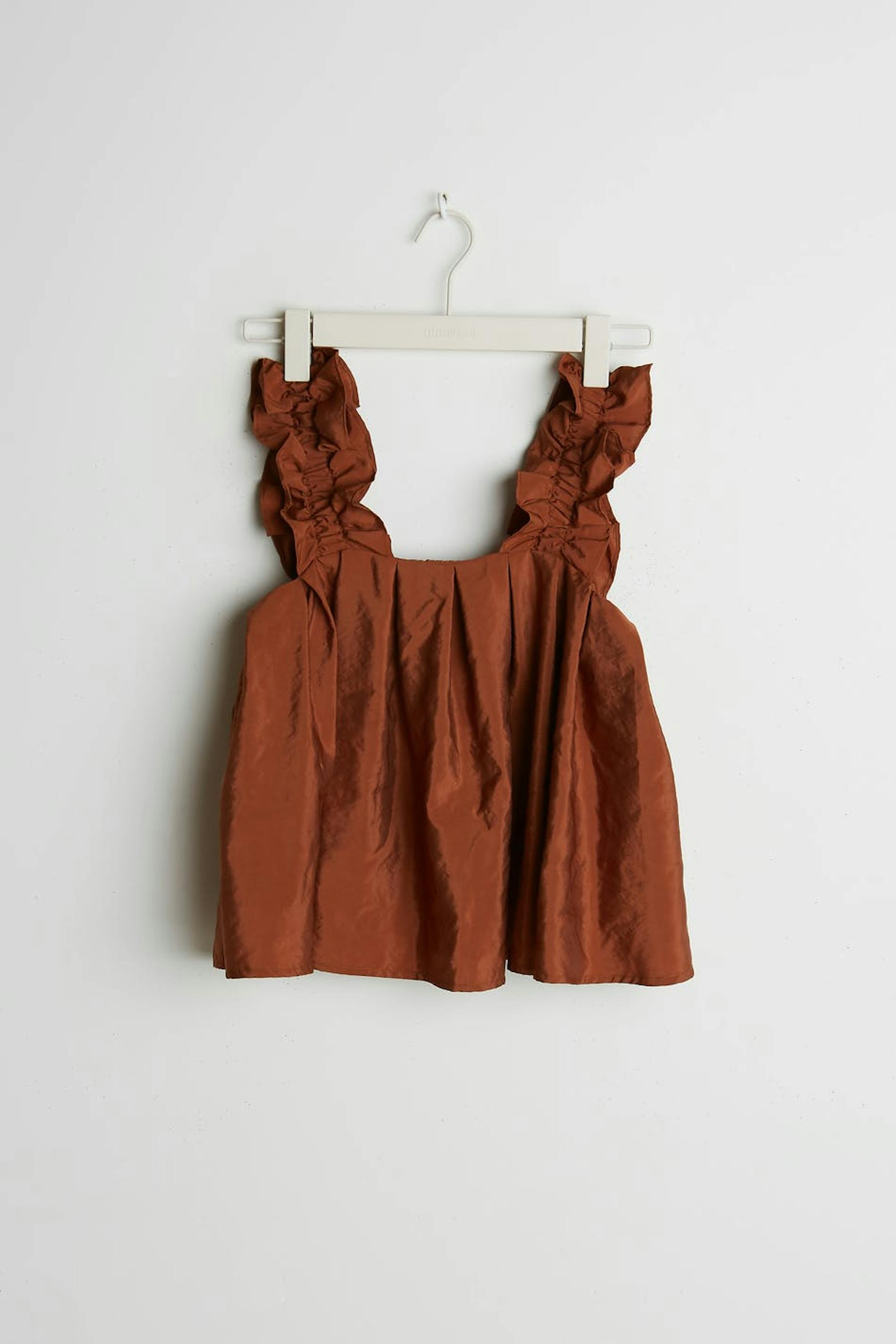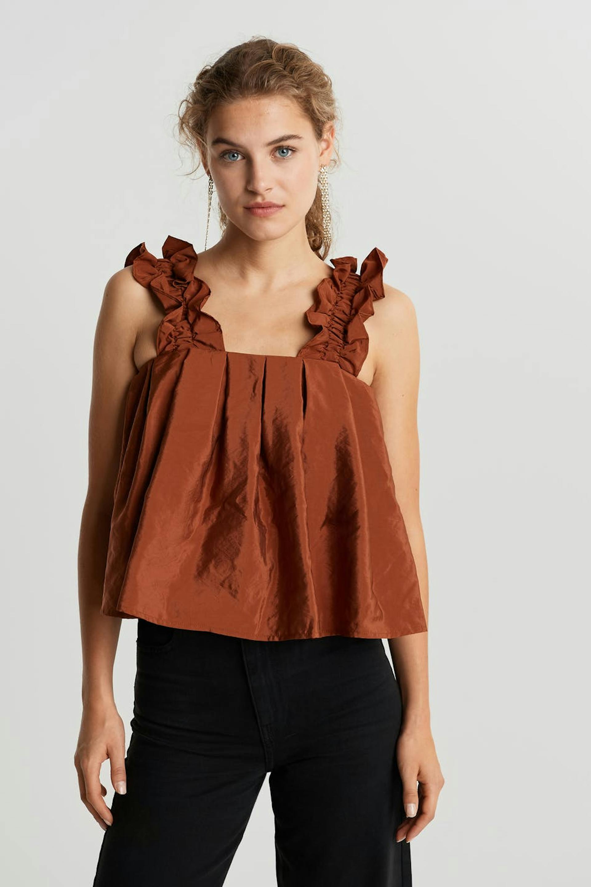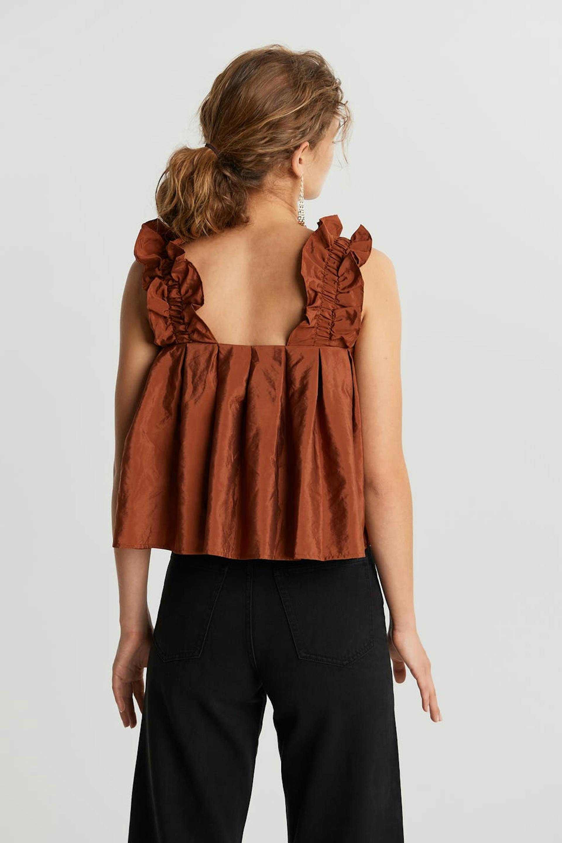 Rustfarget topp med en sjenerøs passform. Toppen har volanger på skuldrene.