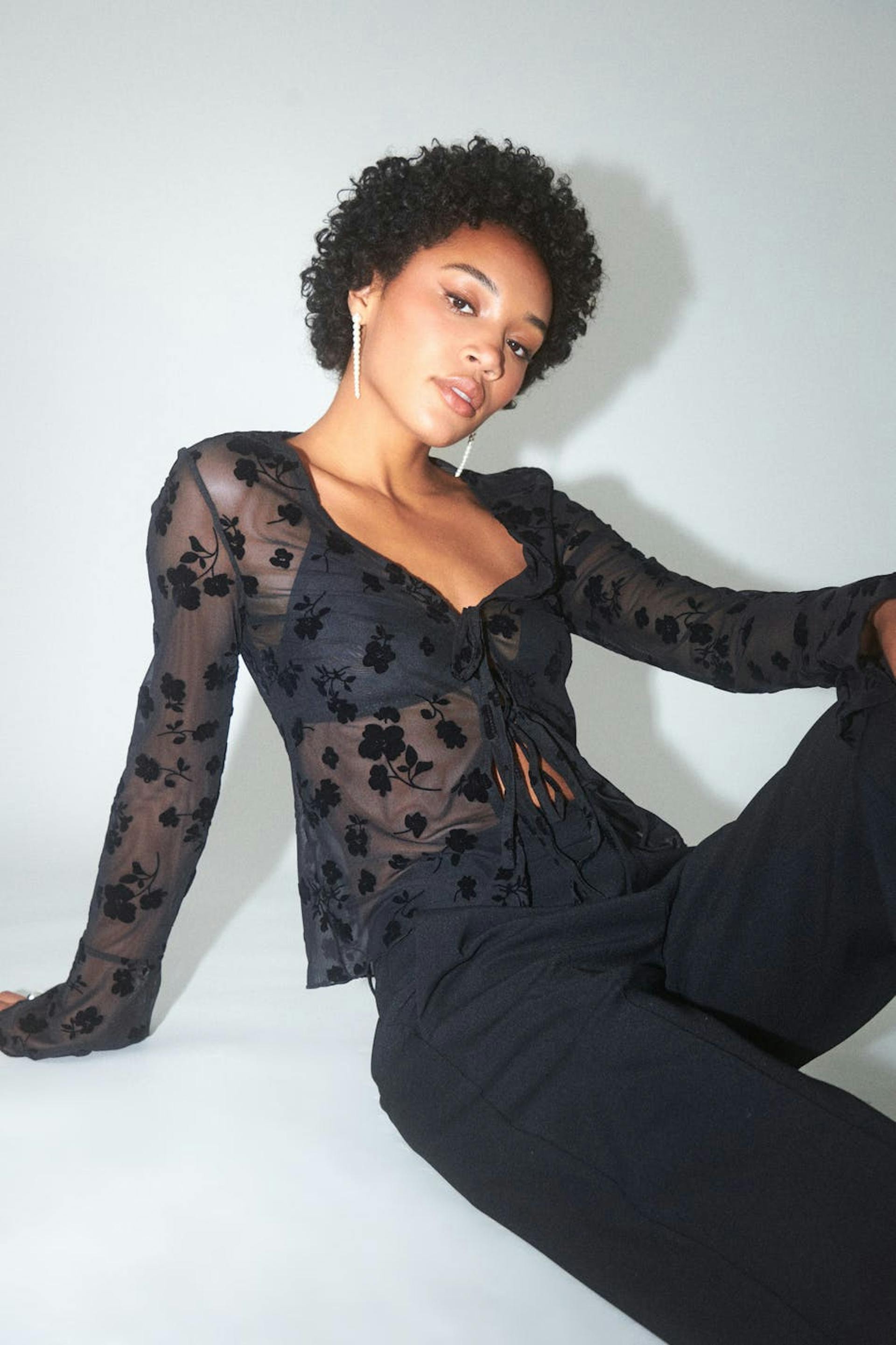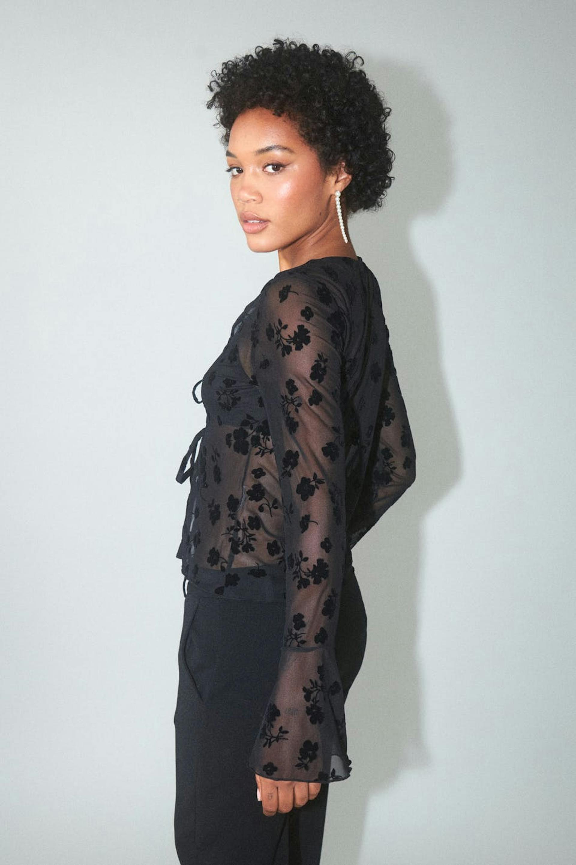 Langermet nettingtopp med blomstertrykk i fløyel. Toppen er svart og har knutelukking på forsiden. Den har v-ringning, gjennomsiktig stoff og brede mansjetter.