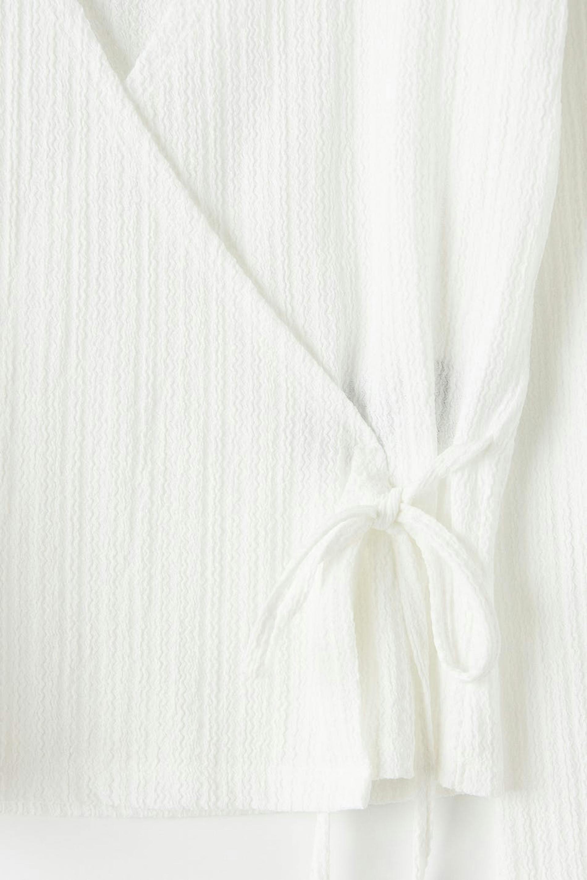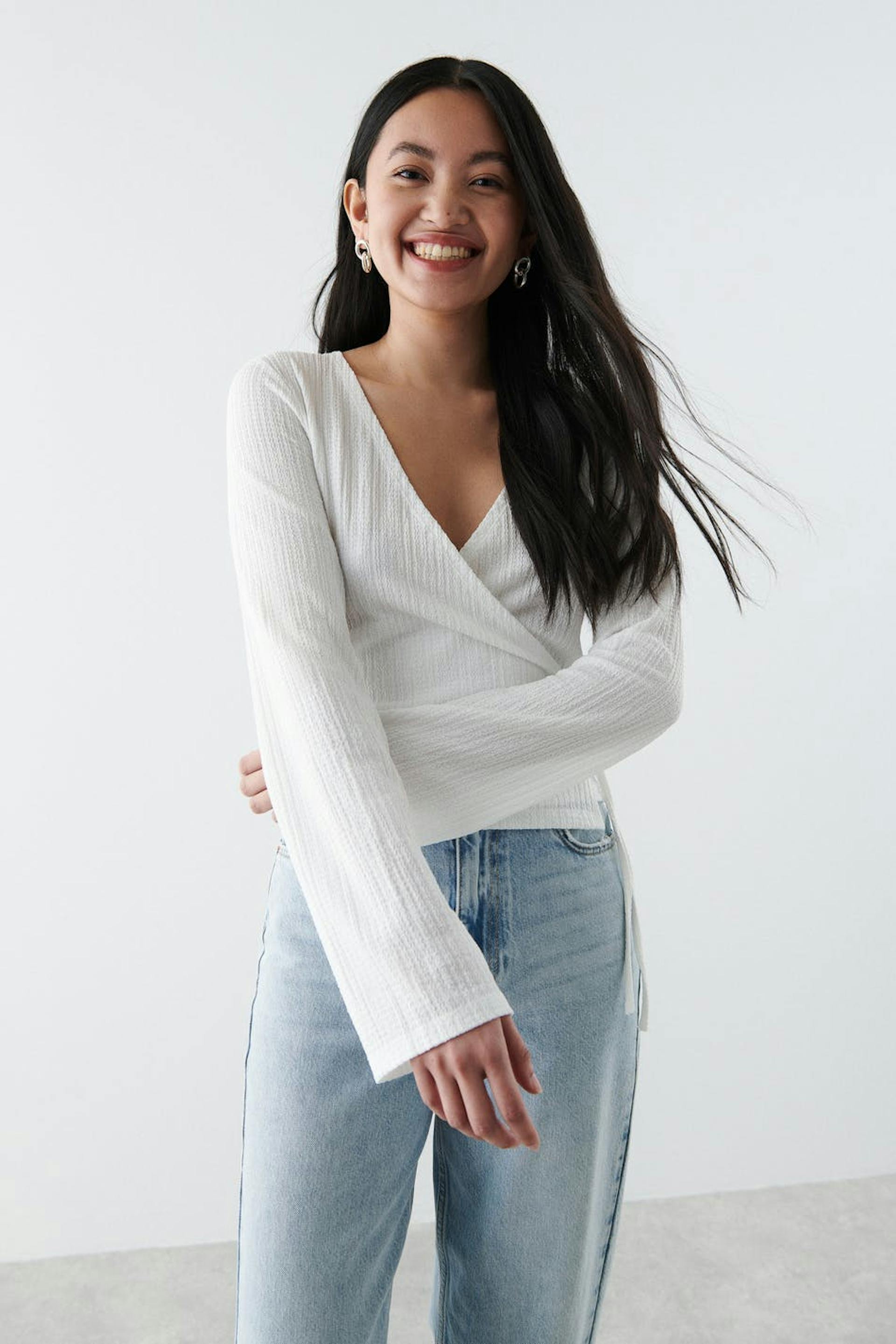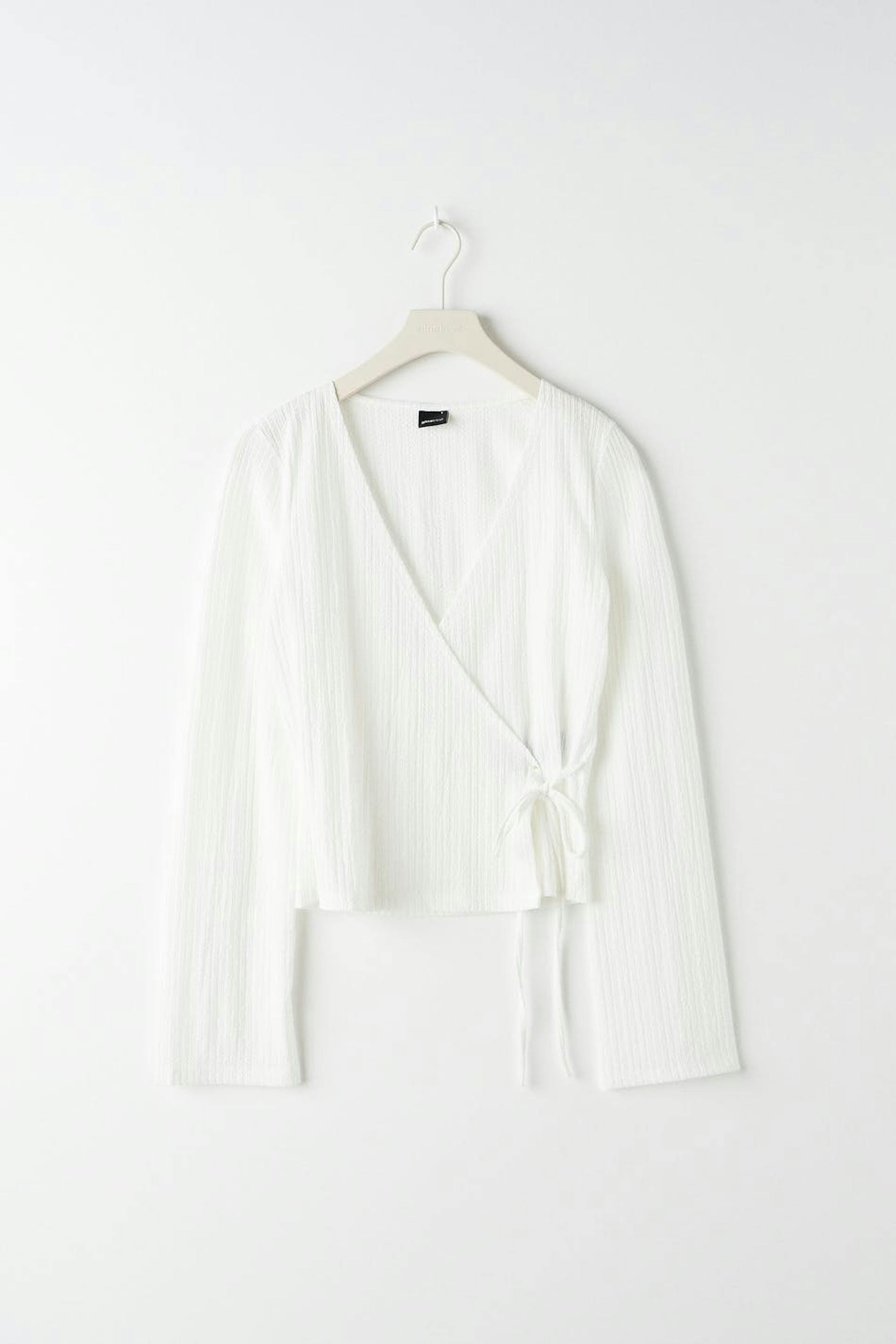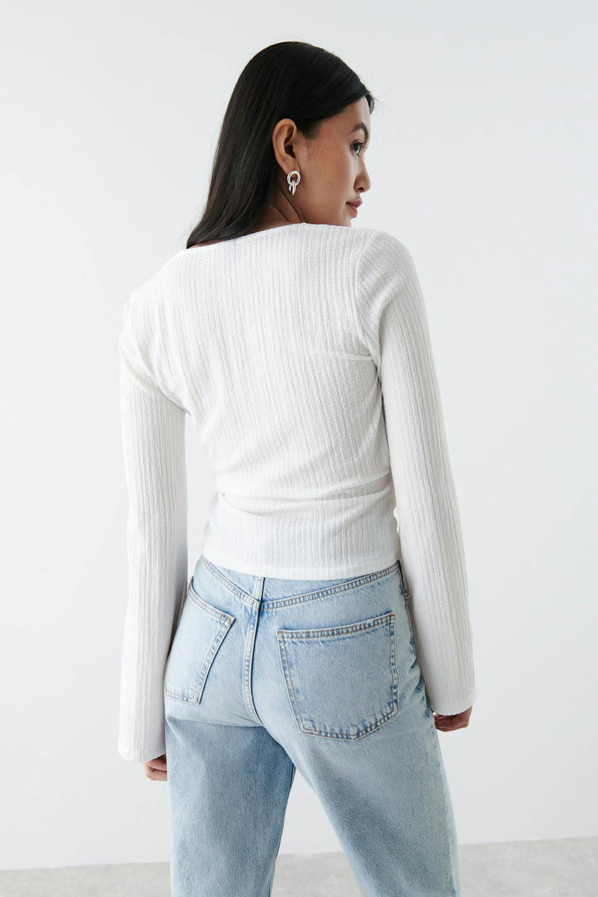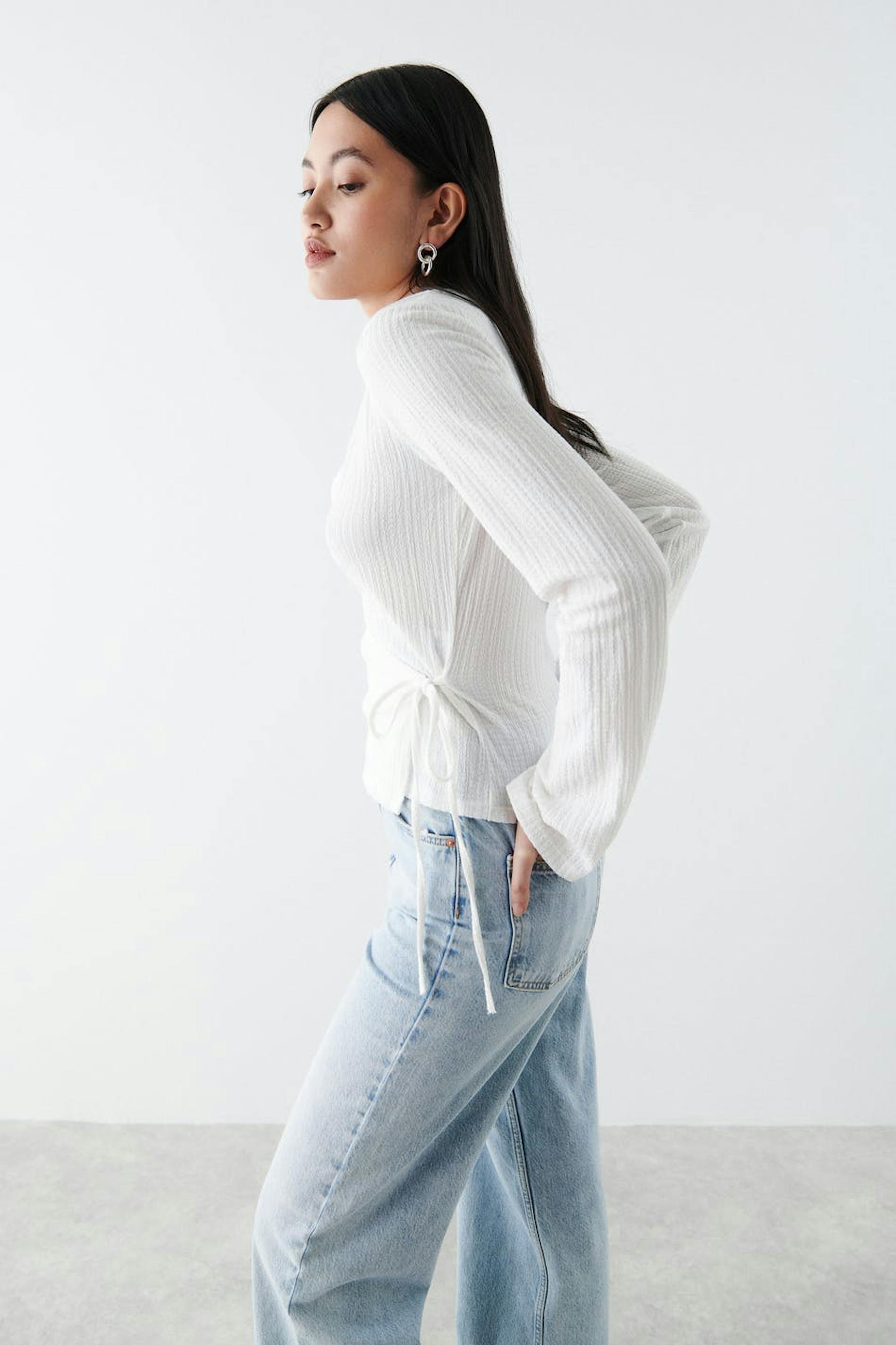 Langermet topp med knyting i siden. Toppen er hvit og har en v-ringning. Den har et strukturert materiale i jersey.