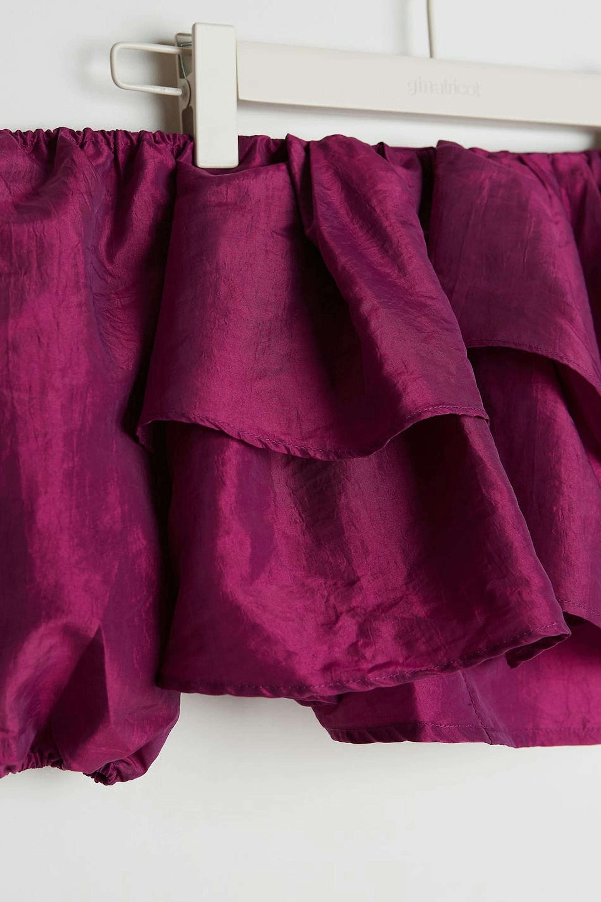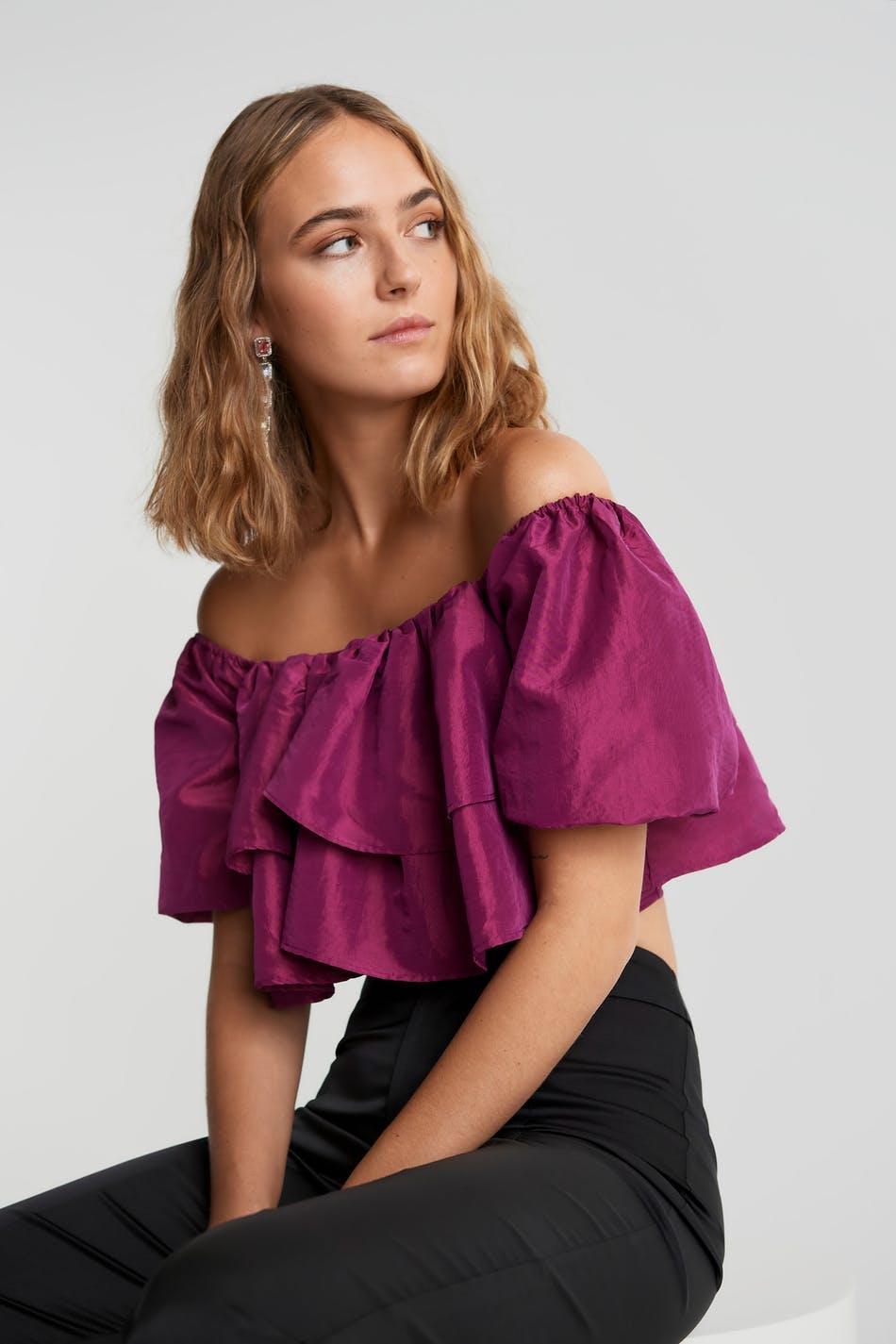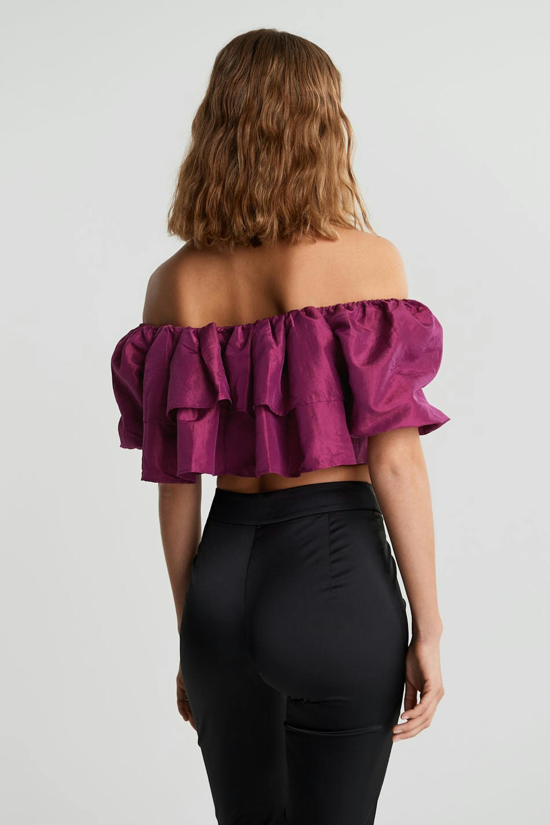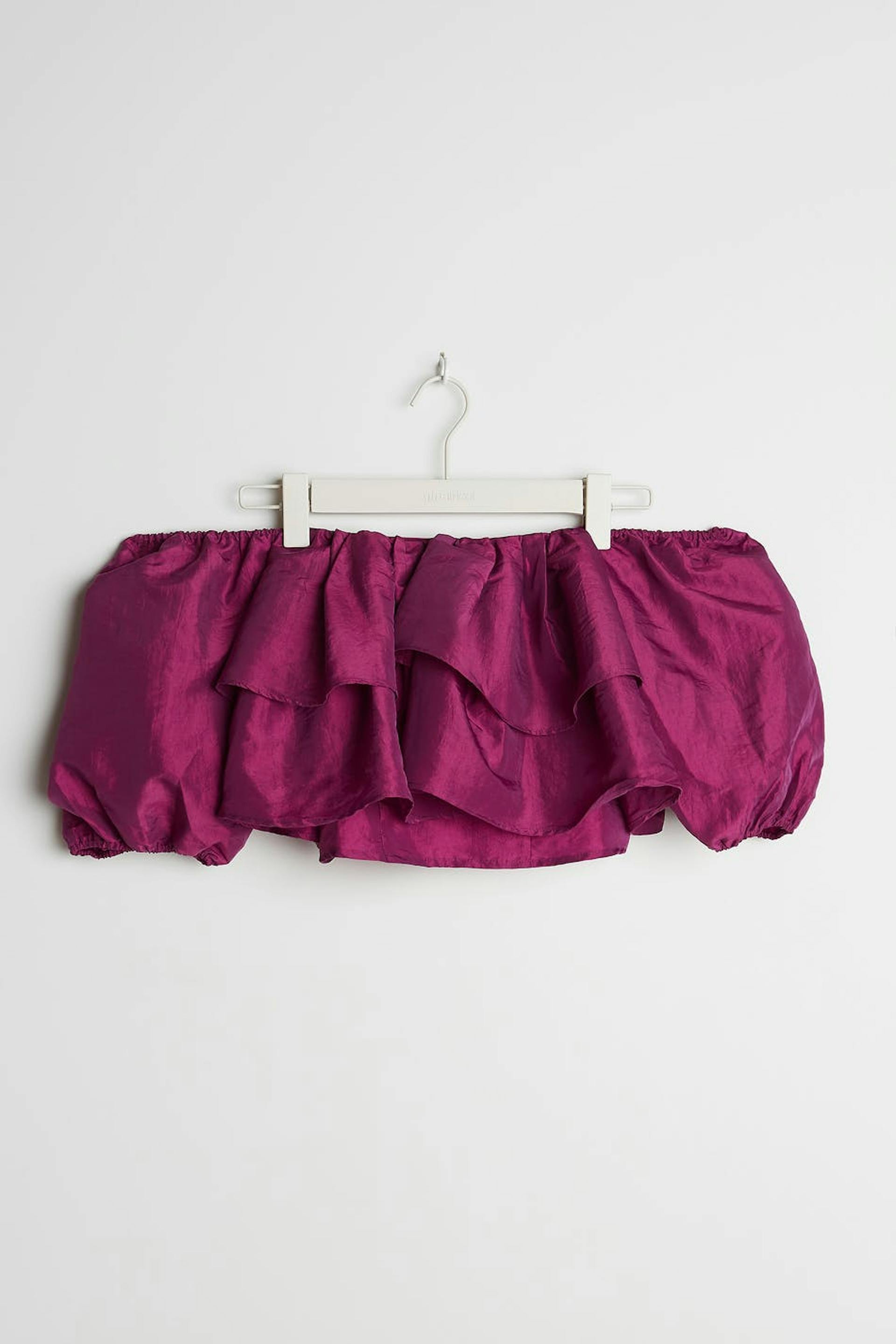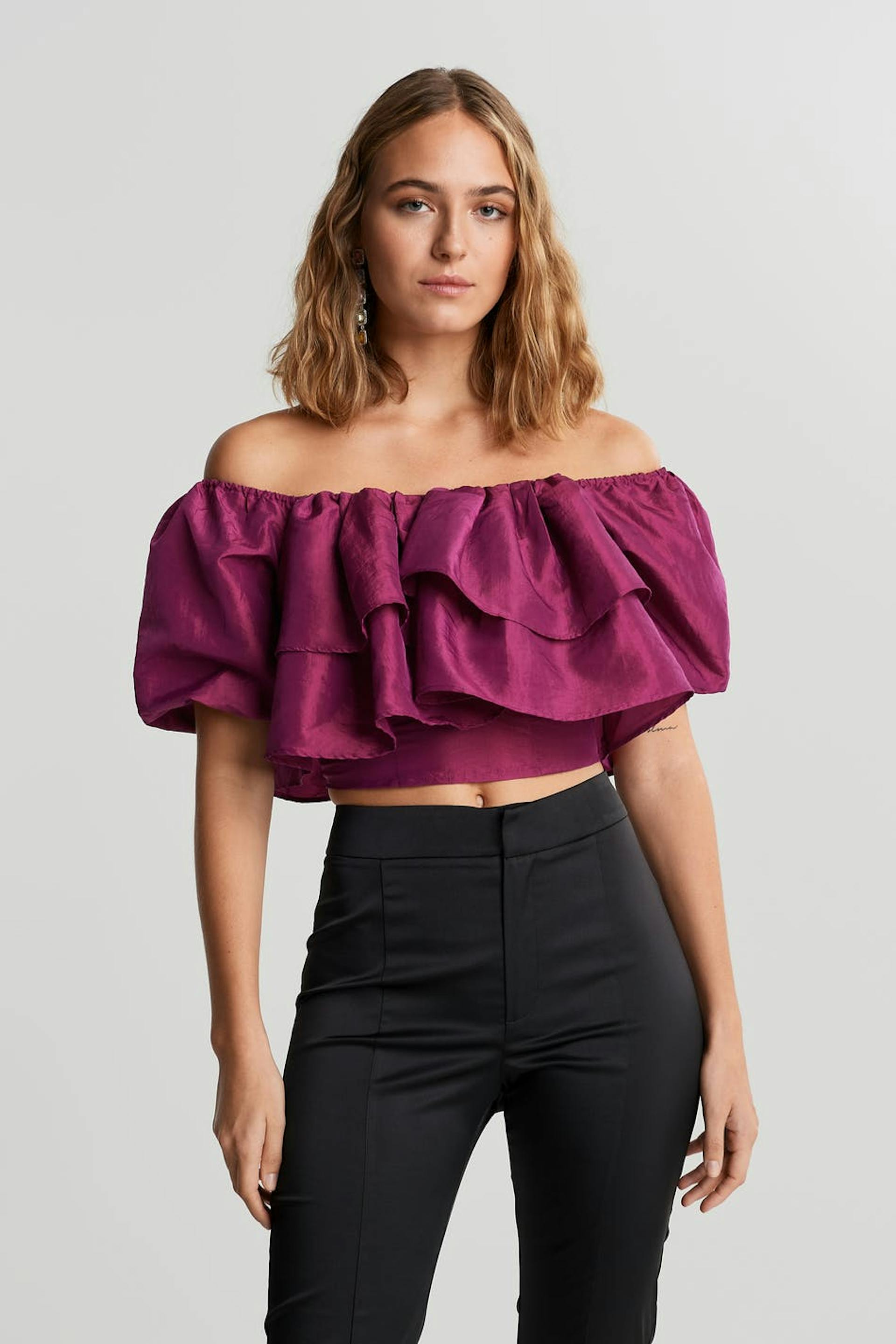 Kort off shoulder-topp med korte puffermer. Toppen er perfekt for festen og lilla og har volanger.